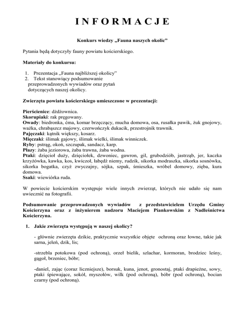 INFORMACJE Konkurs wiedzy „Fauna naszych okolic” Pytania będą dotyczyły fauny powiatu kościerskiego. Materiały do konkursu: 1. Prezentacja „Fauna najbliższej okolicy” 2. Tekst stanowiący podsumowanie przeprowadzonych wywiadów oraz pytań dotyczących naszej okolicy. Zwierzęta powiatu kościerskiego umieszczone w prezentacji: Pierścienice: dżdżownica. Skorupiaki: rak pręgowany. Owady: biedronka, ćma, komar brzęczący, mucha domowa, osa, rusałka pawik, żuk gnojowy, ważka, chrabąszcz majowy, czerwończyk dukacik, przestrojnik trawnik. Pajęczaki: kątnik większy, kosarz. Mięczaki: ślimak gajowy, ślimak wielki, ślimak winniczek. Ryby: pstrąg, okoń, szczupak, sandacz, karp. Płazy: żaba jeziorowa, żaba trawna, żaba wodna. Ptaki: dzięcioł duży, dzięciołek, dzwoniec, gawron, gil, grubodziób, jastrząb, jer, kaczka krzyżówka, kawka, kos, kwiczoł, łabędź niemy, rudzik, sikorka modraszka, sikorka sosnówka, sikorka bogatka, czyż zwyczajny, sójka, szpak, śmieszka, wróbel domowy, zięba, kura domowa. Ssaki: wiewiórka ruda. W powiecie kościerskim występuje wiele innych zwierząt, których nie udało się nam uwiecznić na fotografii. Podsumowanie przeprowadzonych wywiadów z przedstawicielem Urzędu Gminy Kościerzyna oraz z inżynierem nadzoru Maciejem Piankowskim z Nadleśnictwa Kościerzyna. 1. Jakie zwierzęta występują w naszej okolicy? - głównie zwierzęta dzikie, praktycznie wszystkie objęte ochroną oraz łowne, takie jak sarna, jeleń, dzik, lis; -strzebla potokowa (pod ochroną), orzeł bielik, szlachar, kormoran, brodziec leśny, gągoł, brzeniec, bóbr; -daniel, zając (coraz liczniejsze), borsuk, kuna, jenot, gronostaj, ptaki drapieżne, sowy, ptaki śpiewające, sokół, myszołów, wilk (pod ochroną), bóbr (pod ochroną), bocian czarny (pod ochroną). 2. Czy występuje w naszej okolicy jakiś gatunek zagrożony wyginięciem? -orzeł bielik, strzebla błotna, szlachar. 3. Czy na obszarze zrekultywowanym po żwirowni występują jakieś zwierzęta. Czy ich liczba uległa zmniejszeniu w porównaniu ze stanem poprzednim? -występują w większej ilości niż poprzednio, ponieważ są młode nasadzenia i zwierzęta nie są niepokojone (kaczki, łabędzie). 4. Czy w rezerwacie „Czapliniec” nadal występują czaple siwe? -nie występują. 5. Czy występuje różnorodność ryb? -troć wdzydzka (pod ochroną); -strzebla błotna. 6. Jakie zwierzęta są hodowane? -brak wiedzy na temat hodowli prywatnych; -wszystkie gatunki hodowane w produkcji rolniczej (krowy, konie, owce). 7. Czy spotykane są wilki? -tak, odnotowuje się coraz więcej przypadków. 8. Jakie są zwierzęta domowe? -wszystkie, które można legalnie kupić. 9. Czy zwierzęta naszych okolic mają dobre warunki życia? -występuje zagrożenie na drogach. 10. Czy człowiek ingeruje w faunę? -od zawsze. 11. Czy występują przypadki kłusownictwa? -zdarza się często przy użyciu broni palnej, jest to poważny problem. 12. Co zrobić w przypadku zauważenia kłusownictwa? -zgłosić się do nadleśnictwa.