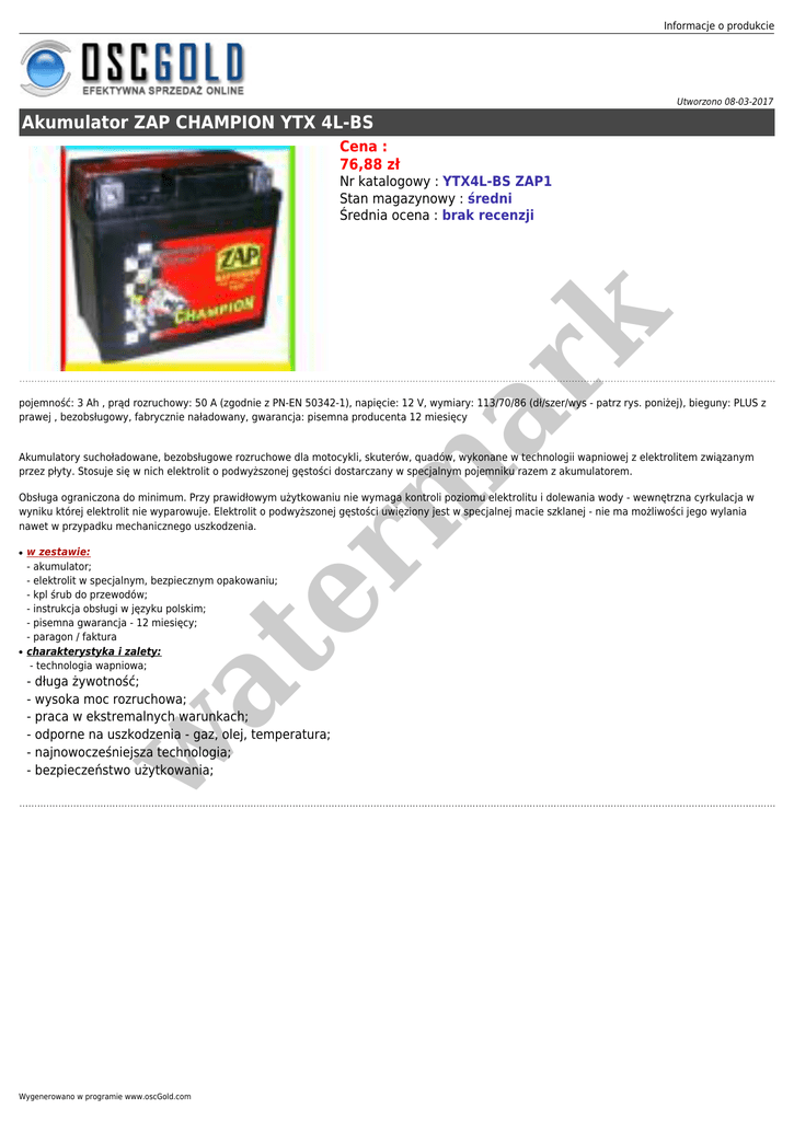 Informacje o produkcie Utworzono 08-03-2017 Akumulator ZAP CHAMPION YTX 4L-BS Cena : 76,88 zł er m ar k Nr katalogowy : YTX4L-BS ZAP1 Stan magazynowy : średni Średnia ocena : brak recenzji pojemność: 3 Ah , prąd rozruchowy: 50 A (zgodnie z PN-EN 50342-1), napięcie: 12 V, wymiary: 113/70/86 (dł/szer/wys - patrz rys. poniżej), bieguny: PLUS z prawej , bezobsługowy, fabrycznie naładowany, gwarancja: pisemna producenta 12 miesięcy Akumulatory suchoładowane, bezobsługowe rozruchowe dla motocykli, skuterów, quadów, wykonane w technologii wapniowej z elektrolitem związanym przez płyty. Stosuje się w nich elektrolit o podwyższonej gęstości dostarczany w specjalnym pojemniku razem z akumulatorem. Obsługa ograniczona do minimum. Przy prawidłowym użytkowaniu nie wymaga kontroli poziomu elektrolitu i dolewania wody - wewnętrzna cyrkulacja w wyniku której elektrolit nie wyparowuje. Elektrolit o podwyższonej gęstości uwięziony jest w specjalnej macie szklanej - nie ma możliwości jego wylania nawet w przypadku mechanicznego uszkodzenia. ● w zestawie: - akumulator; - elektrolit w specjalnym, bezpiecznym opakowaniu; - kpl śrub do przewodów; - instrukcja obsługi w języku polskim; - pisemna gwarancja - 12 miesięcy; - paragon / faktura charakterystyka i zalety: - technologia wapniowa; at ● w - długa żywotność; - wysoka moc rozruchowa; - praca w ekstremalnych warunkach; - odporne na uszkodzenia - gaz, olej, temperatura; - najnowocześniejsza technologia; - bezpieczeństwo użytkowania; Wygenerowano w programie www.oscGold.com