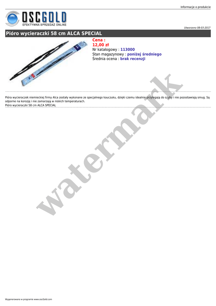 Informacje o produkcie Utworzono 08-03-2017 Pióro wycieraczki 58 cm ALCA SPECIAL Cena : 12,00 zł er m ar k Nr katalogowy : 113000 Stan magazynowy : poniżej średniego Średnia ocena : brak recenzji w at Pióra wycieraczek niemieckiej firmy Alca zostały wykonane ze specjalnego kauczuku, dzięki czemu idealnie przylegają do szyby i nie pozostawiają smug. Są odporne na korozję i nie zamarzają w niskich temperaturach. Pióro wycieraczki 58 cm ALCA SPECIAL Wygenerowano w programie www.oscGold.com