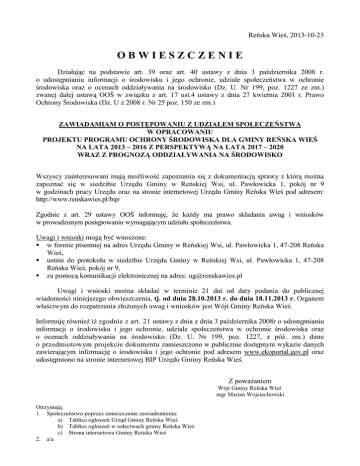 Reńska Wieś, 2013-10-25 OBWIESZCZENIE Działając na podstawie art. 39 oraz art. 40 ustawy z dnia 3 października 2008 r. o udostępnianiu informacji o środowisku i jego ochronie, udziale społeczeństwa w ochronie środowiska oraz o ocenach oddziaływania na środowisko (Dz. U. Nr 199, poz. 1227 ze zm.) zwanej dalej ustawą OOŚ w związku z art. 17 ust.4 ustawy z dnia 27 kwietnia 2001 r. Prawo Ochrony Środowiska (Dz. U z 2008 r. Nr 25 poz. 150 ze zm.) ZAWIADAMIAM O POSTĘPOWANIU Z UDZIAŁEM SPOŁECZEŃSTWA W OPRACOWANIU PROJEKTU PROGRAMU OCHRONY ŚRODOWISKA DLA GMINY REŃSKA WIEŚ NA LATA 2013 – 2016 Z PERSPEKTYWĄ NA LATA 2017 – 2020 WRAZ Z PROGNOZĄ ODDZIAŁYWANIA NA ŚRODOWISKO Wszyscy zainteresowani mają możliwość zapoznania się z dokumentacją sprawy z którą można zapoznać się w siedzibie Urzędu Gminy w Reńskiej Wsi, ul. Pawłowicka 1, pokój nr 9 w godzinach pracy Urzędu oraz na stronie internetowej Urzędu Gminy Reńska Wieś pod adresem: http://www.renskawies.pl/bip/ Zgodnie z art. 29 ustawy OOŚ informuję, że każdy ma prawo składania uwag i wniosków w prowadzonym postępowaniu wymagającym udziału społeczeństwa. Uwagi i wnioski mogą być wnoszone: w formie pisemnej na adres Urzędu Gminy w Reńskiej Wsi, ul. Pawłowicka 1, 47-208 Reńska Wieś, ustnie do protokołu w siedzibie Urzędu Gminy w Reńskiej Wsi, ul. Pawłowicka 1, 47-208 Reńska Wieś, pokój nr 9, za pomocą komunikacji elektronicznej na adres: [email protected] Uwagi i wnioski można składać w terminie 21 dni od daty podania do publicznej wiadomości niniejszego obwieszczenia, tj. od dnia 28.10.2013 r. do dnia 18.11.2013 r. Organem właściwym do rozpatrzenia złożonych uwag i wniosków jest Wójt Gminy Reńska Wieś. Informuję również iż zgodnie z art. 21 ustawy z dnia z dnia 3 października 2008r o udostępnianiu informacji o środowisku i jego ochronie, udziale społeczeństwa w ochronie środowiska oraz o ocenach oddziaływania na środowisko (Dz. U. Nr 199, poz. 1227, z póź. zm.) dane o przedmiotowym projekcie dokumentu zamieszczono w publicznie dostępnym wykazie danych zawierającym informację o środowisku i jego ochronie pod adresem www.ekoportal.gov.pl oraz udostępniono na stronie internetowej BIP Urzędu Gminy Reńska Wieś. Z poważaniem Wójt Gminy Reńska Wieś mgr Marian Wojciechowski Otrzymują: 1. Społeczeństwo poprzez umieszczenie zawiadomienia: a) Tablica ogłoszeń Urząd Gminy Reńska Wieś b) Tablice ogłoszeń w sołectwach gminy Reńska Wieś c) Strona internetowa Gminy Reńska Wieś 2. a/a
