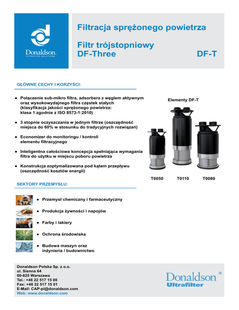 Filtracja sprężonego powietrza Filtr trójstopniowy DF-Three DF-T GŁÓWNE CECHY I KORZYŚCI: ● Połączenie sub-mikro filtra, adsorbera z węglem aktywnym oraz wysokowydajnego filtra częstek stałych (klasyfikacja jakości sprężonego powietrza: klasa 1 zgodnie z ISO 8573-1:2010) Elementy DF-T ● 3 stopnie oczyszczania w jednym filtrze (oszczędność miejsca do 60% w stosunku do tradycyjnych rozwiązań) ● Economizer do monitoringu / kontroli elementu filtracyjnego ● Inteligentna całościowa koncepcja spełniająca wymagania filtra do użytku w miejscu poboru powietrza ● Konstrukcja zoptymalizowana pod kątem przepływu (oszczędność kosztów energii) T0050 SEKTORY PRZEMYSŁU: ● Przemysł chemiczny i farmaceutyczny ● Produkcja żywności i napojów ● Farby i lakiery ● Ochrona środowiska ● Budowa maszyn oraz inżynieria / budownictwo Donaldson Polska Sp. z o.o. ul. Sienna 64 00-825 Warszawa Tel.: +48 22 517 15 00 Fax: +48 22 517 15 01 E-Mail: [email protected] Web: www.donaldson.com T0110 T0080 DF-T Filtracja Sprężonego Powietrza OPIS PRODUKTU Filtry trójstopniowe DF-T (DF-Three) są używane do oczyszczania sprężonego powietrza oraz gazów w obszarze zastosowań przemysłowych. Element łączy 3 stopnie oczyszczania w jednym filtrze (patrz rys.): Economizer 1. Filtr koalescencyjny do usuwania aerozoli olejowych oraz cząstek stałych, 2. Adsorber z węglem aktywnym (złoże pakowane) do usuwania par oleju i innych węglowodorów, pozwalający osiągnąć jakość powietrza klasy 1 zgodnie z ISO 8573-1:2010 dla olejów 3. Wysokowydajny filtr cząstek stałych 3. Wysokowydajny filtr cząstek stałych pozwalający osiągnąć jakość klasy 1 zgodnie z ISO8573-1:2010 dla cząstek stałych. 2. Adsorber z węglem aktywnym 1. Filtr koalescencyjny Filtr DF-T jest zatem doskonale dostosowany do użytku w miejscu poboru powietrza, gdzie niezbędna jest najwyższa jakość sprężonego powietrza i gdzie dostępna jest jedynie niewielka przestań. Economizer zintegrowany z obudową filtra wskazuje okres eksploatacji elementu filtracyjnego i sygnalizuje niezbędną wymianę po wygaśnięciu zaprogramowanego czasu użytkowania. Opcjonalnie Economizer wskazuje spadek ciśnienia na filtrze i sygnalizuje osiągnięcie zaprogramowanego limitu określającego konieczność wymiany wkładu. Ponieważ Economizer alarmuje przebicie oleju, doskonale chroni aparaturę przemysłową. Element filtracyjny DF-T zaprojektowano i opracowano do zastosowań: ● Urządzenia laserowe: Oczyszczanie gazu tnącego i przedmuchowego ● Powietrze oddechowe: Dzięki połączeniu różnych stopni oczyszczania w jednej obudowie, filtr DF-T jest rozwiązaniem kompaktowym, wymagającym niewielkiej przestrzeni i łatwym w serwisowaniu. 3 rozmiary filtra DF-T pokrywają zakresem wydajności przepływy do 110 Nm³/h w warunkach ciśnienia roboczego 7 bar. Karta Katalogowa 2/4 Usuwanie olejów i cząstek stałych, a także zapachów i smaków ● Aparatura przemysłowa: Wytwarzanie sprężonego powietrza wolnego od olejów i cząstek stałych do różnych zastosowań, np. do urządzeń pakujących DF-T Filtracja Sprężonego Powietrza SPECYFIKACJA PRODUKTU Cechy: Korzyści: Połączenie sub-mikro filtra, adsorbera z węglem aktywnym i wysokowydajnego filtra cząstek stałych (jakość powietrza: klasa 1 dla cząstek stałych) 3 stopnie oczyszczania w jednym filtrze (oszczędność miejsca do 60% w porównaniu do tradycyjnych rozwiązań) Economizer Zapewniony poziom jakości sprężonego powietrza zgodnie z ISO 8573-1:2010 Obniżone koszty instalacji i obsługi, niewielkie wymagania przestrzenne - praca możliwa również w niewielkich przestrzeniach Niezawodna kontrola okresów międzyprzeglądo wych wkładu filtracyjnego i spadku ciśnienia. Opcjonalnie regulowana kontrola spadku ciśnienia pozwala rozpoznać zewnętrzne czynniki wpływa jące na filtr (np. przebicie oleju) i pozwala wysłać komunikat alarmowy. Economizer zapewnia doskonałą ochronę aparatury przemysłowej “Inteligentna całościowa koncepcja” Zakres rozmiarów, stopnie filtracji, zintegrowane funkcje monitoringu i niezawodny, pneumatyczny dren kondensatu doskonale dopasowane do wymagań filtracji w miejscu poboru powietrza Konstrukcja zoptymalizowana pod kątem przepływu Niskie spadki ciśnień, oszczędności kosztów energii Połączenie bagnetowe pomiędzy górną i dolną Łatwa w obsłudze budowa - łatwa instalacja częścią obudowy, element może być usunięty razem i montaż, uproszczona wymiana filtra, z dolną częścią obudowy, górna część obudowy dogodna obsługa serwisowa zintegrowana ze wskaźnikiem spadku ciśnienia Filtr nie może się otworzyć pod ciśnieniem dzięki Wysokie bezpieczeństwo użytkowania zastosowaniu zamknięcia bagnetowego Wylot Wlot Wydajność filtracji przy nominalnym przepływie, zdefiniowana przez następujące warunki pracy 1) Nadciśnienie robocze Temperatura robocza 1) Zawartość oleju na wlocie Zawartość wilgoci Klasyfikacja jakości sprężonego powietrza zgodnie z ISO 8573-1:2010 dla olejów Klasyfikacja jakości sprężonego powietrza zgodnie z ISO 8573-1:2010 dla cząstek stałych Spadek ciśnienia w nowych warunkach, suchy Czas eksploatacji stadium węgla aktywnego 7 bar 20°C 3 mg/m3 50% wilgotności względnej, odpowiadającej ciśnieniowemu punktowi rosy ok. +10°C w 20°C temperatury roboczej < 0.003 mg/m3, klasa 1 Klasa 1 330 mbar 2000 roboczogodzin Rekomendowana maksymalna temperatura robocza wynosi 30°C, ze wzrostem temperatury zmniejsza się żywotność filtra (w 30°C żywotność w oleju mineralnym ISO 46 wynosi ok. 1000 roboczogodzin). Karta Katalogowa 3/4 DF-T Filtracja Sprężonego Powietrza MATERIAŁY/ WYMIARY Poz. Szt. Opis 1 1 Górna część obudowy 2 1 Dolna część obudowy 3 2 Uchwyt montażowy (opcja) 4 1 Economizer 5 1 Dren KA 1/2 Materiały obudowy filtra Obudowa filtra Aluminium odlew Economizer Tworzywo sztuczne Dren pływakowy Tworzywo 