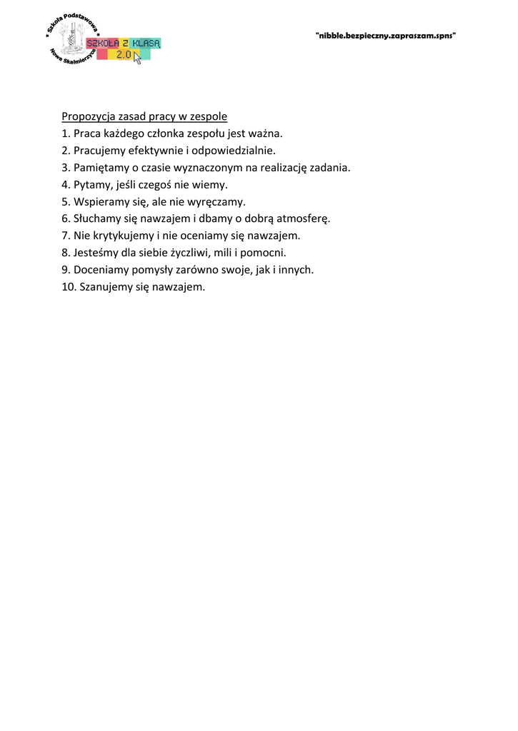 "nibble.bezpieczny.zapraszam.spns" Propozycja zasad pracy w zespole 1. Praca każdego członka zespołu jest ważna. 2. Pracujemy efektywnie i odpowiedzialnie. 3. Pamiętamy o czasie wyznaczonym na realizację zadania. 4. Pytamy, jeśli czegoś nie wiemy. 5. Wspieramy się, ale nie wyręczamy. 6. Słuchamy się nawzajem i dbamy o dobrą atmosferę. 7. Nie krytykujemy i nie oceniamy się nawzajem. 8. Jesteśmy dla siebie życzliwi, mili i pomocni. 9. Doceniamy pomysły zarówno swoje, jak i innych. 10. Szanujemy się nawzajem.