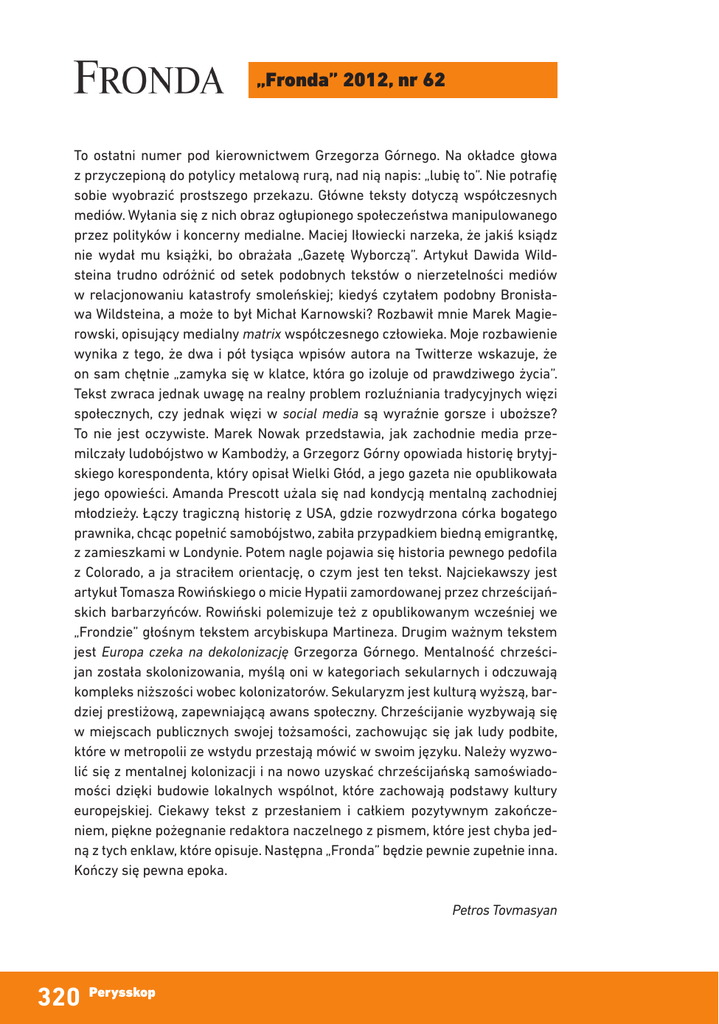 „Fronda” 2012, nr 62 To ostatni numer pod kierownictwem Grzegorza Górnego. Na okładce głowa z przyczepioną do potylicy metalową rurą, nad nią napis: „lubię to”. Nie potrafię sobie wyobrazić prostszego przekazu. Główne teksty dotyczą współczesnych mediów. Wyłania się z nich obraz ogłupionego społeczeństwa manipulowanego przez polityków i koncerny medialne. Maciej Iłowiecki narzeka, że jakiś ksiądz nie wydał mu książki, bo obrażała „Gazetę Wyborczą”. Artykuł Dawida Wildsteina trudno odróżnić od setek podobnych tekstów o nierzetelności mediów w relacjonowaniu katastrofy smoleńskiej; kiedyś czytałem podobny Bronisława Wildsteina, a może to był Michał Karnowski? Rozbawił mnie Marek Magierowski, opisujący medialny matrix współczesnego człowieka. Moje rozbawienie wynika z tego, że dwa i pół tysiąca wpisów autora na Twitterze wskazuje, że on sam chętnie „zamyka się w klatce, która go izoluje od prawdziwego życia”. Tekst zwraca jednak uwagę na realny problem rozluźniania tradycyjnych więzi społecznych, czy jednak więzi w social media są wyraźnie gorsze i uboższe? To nie jest oczywiste. Marek Nowak przedstawia, jak zachodnie media przemilczały ludobójstwo w Kambodży, a Grzegorz Górny opowiada historię brytyjskiego korespondenta, który opisał Wielki Głód, a jego gazeta nie opublikowała jego opowieści. Amanda Prescott użala się nad kondycją mentalną zachodniej młodzieży. Łączy tragiczną historię z USA, gdzie rozwydrzona córka bogatego prawnika, chcąc popełnić samobójstwo, zabiła przypadkiem biedną emigrantkę, z zamieszkami w Londynie. Potem nagle pojawia się historia pewnego pedofila z Colorado, a ja straciłem orientację, o czym jest ten tekst. Najciekawszy jest artykuł Tomasza Rowińskiego o micie Hypatii zamordowanej przez chrześcijańskich barbarzyńców. Rowiński polemizuje też z opublikowanym wcześniej we „Frondzie” głośnym tekstem arcybiskupa Martineza. Drugim ważnym tekstem jest Europa czeka na dekolonizację Grzegorza Górnego. Mentalność chrześcijan została skolonizowania, myślą oni w kategoriach sekularnych i odczuwają kompleks niższości wobec kolonizatorów. Sekularyzm jest kulturą wyższą, bardziej prestiżową, zapewniającą awans społeczny. Chrześcijanie wyzbywają się w miejscach publicznych swojej tożsamości, zachowując się jak ludy podbite, które w metropolii ze wstydu przestają mówić w swoim języku. Należy wyzwolić się z mentalnej kolonizacji i na nowo uzyskać chrześcijańską samoświadomości dzięki budowie lokalnych wspólnot, które zachowają podstawy kultury europejskiej. Ciekawy tekst z przesłaniem i całkiem pozytywnym zakończeniem, piękne pożegnanie redaktora naczelnego z pismem, które jest chyba jedną z tych enklaw, które opisuje. Następna „Fronda” będzie pewnie zupełnie inna. Kończy się pewna epoka. Petros Tovmasyan 320 Perysskop