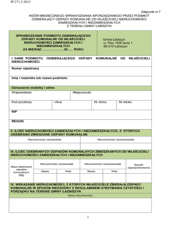 IP.271.2.2015 Załącznik nr 7 WZÓR MIESIĘCZNEGO SPRAWOZDANIA SPORZĄDZANEGO PRZEZ PODMIOT ODBIERAJĄCY ODPADY KOMUNALNE OD WŁAŚCICIELI NIERUCHOMOŚCI ZAMIESZKAŁYCH I NIEZAMIESZKAŁYCH Z TERENU GMINY ŁABISZYN SPRAWOZDANIE PODMIOTU ODBIERAJĄCEGO ODPADY KOMUNALNE OD WŁAŚCICIELI NIERUCHOMOŚCI ZAMIESZKAŁYCH I NIEZAMIESZKAŁYCH ZA MIESIĄC……………….. 20...... ROKU I. DANE PODMIOTU NIERUCHOMOŚCI ODBIERAJĄCEGO Gmina Łabiszyn ul. Plac 1000 lecia 1 89-210 Łabiszyn ODPADY KOMUNALNE OD WŁAŚCICIELI Numer rejestrowy Imię i nazwisko lub nazwa podmiotu Oznaczenie siedziby i adres Województwo Miejscowość Kod pocztowy Ulica Nr domu Nr lokalu NIP REGON II. ILOŚĆ NIERUCHOMOŚCI ZAMIESZAŁYCH I NIEZAMIESZKAŁYCH, Z KTÓRYCH ODEBRANO ZMIESZANE ODPADY KOMUNALNE Nieruchomości zamieszkałe Nieruchomości niezamieszkałe III. ILOŚĆ ODEBRANYCH ODPADÓW KOMUNALNYCH ZMIESZKANYCH OD WŁAŚCICIELI NIERUCHOMOŚCI ZAMIESZKAŁYCH I NIEZAMIESZKAŁYCH Nieruchomości zamieszkałe Masa odebranych odpadów komunalnych [Mg] Miasto Wieś Nieruchomości niezamieszkałe Miasto Sposób zagospodarowania Wieś IV. WSKAZANIE NIERUCHOMOŚCI, Z KTÓRYCH WŁAŚCICIELE ZBIERAJĄ ODPADY KOMUNALNE W SPOSÓB NIEZGODNY Z REGULAMINEM UTRZYMANIA CZYSTOŚCI I PORZĄDKU NA TERENIE GMINY ŁAZBISZYN Adres nieruchomości 1 IP.271.2.2015 V. ILOŚĆ ORAZ WIELKOŚĆ PODSTAWIONYCH POJEMNIKÓW NA ODPADY KOMUNALNE ZMIESZANE Wielkość pojemnika Liczba pojemników Nieruchomości zamieszkałe Nieruchomości niezamieszkałe 60l 120l 240l 660l 1100l 5000l 7000l 10000l VI. MASA POSZCZEGÓLNYCH RODZAJÓW ODPADÓW KOMUNALNYCH ZEBRANYCH SELEKTYWNIE Z TERENU GMINY ŁABISZYN Kod odebranych odpadów Rodzaj odebranych odpadów komunalnych komunalnych Łączna masa odebranych odpadów komunalnych [Mg] Sposób zagospodarowania PUNKT SELEKTYWNEJ ZBIÓRKI ODPADÓW KOMUNALNYCH Kod odebranych odpadów Rodzaj odebranych odpadów komunalnych komunalnych Łączna masa odebranych odpadów komun [Mg] Sposób zagospodarowania VII. DANE OSOBY WYPEŁNIAJĄCEJ SPRAWOZDANIE Imię Nazwisko Telefon służbowy Faks służbowy E-mail służbowy Data Podpis i pieczątka odbierającego (lub osoby upoważnionej) odpady komunalne od właścicieli nieruchomości 2
