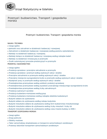 Urząd Statystyczny w Gdańsku Przemysł i budownictwo. Transport i gospodarka morska Przemysł i budownictwo. Transport i gospodarka morska NAUKA I TECHNIKA ● Uwagi ogólne ● Jednostki oraz zatrudnieni w działalności badawczej i rozwojowej ● Zatrudnieni w działalności badawczej i rozwojowej według poziomu wykształcenia ● Nakłady na działalność badawczą i rozwojową ● Nakłady bieżące na działalność badawczą i rozwojową według rodzajów badań ● Nakłady na działalnosć innowacyjną w przemyśle ● Środki automatyzacji procesów produkcyjnych w przemyśle PRZEMYSŁ I BUDOWNICTWO ● Uwagi ogólne ● Produkcja sprzedana i przeciętne zatrudnienie w przemyśle ● Produkcja sprzedana i przemysł według wybranych sekcji i działów ● Przeciętne zatrudnienie w przemysle według wybranych sekcji i działów ● Przeciętne miesięczne wynagrodzenie brutto w przemyśle według wybranych sekcji i działów ● Wydajność pracy w przemyśle według wybranych sekcji i działów ● Przedsiębiorstwa przemysłowe według wielkości produkcji sprzedanej ● Przedsiębiorstwa przemysłowe według wysokości przeciętnego miesięcznego wynagrodzenia brutto ● Przedsiębiorstwa przemysłowe według liczby zatrudnionych ● Produkcja wybranych wyrobów ● Produkcja budowlano-montażowa według grup ● Produkcja budowlano-montażowa według rodzajów obiektów budowlanych ● Budynki oddane do użytkowania ● Budynki oddane do użytkowania według rodzaju budynków ● Budynki mieszkalne oddane do użytkowania według form budownictwa mieszkaniowego ● Budynki mieszkalne oddane do użytkowania według liczby mieszkań i liczby izb ● Budynki mieszkalne oddane do użytkowania według czasu trwania budowy w 2006 r. TRANSPORT.GOSPODARKA MORSKA ● Uwagi ogólne ● Drogi publiczne ● Obiekty mostowe ● Tabor samochodowy eksploatowany w transporcie samochodowym zarobkowym ● Przewozy ładunków transportem samochodowym zarobkowym ● Przewozy pasażerów transportem samochodowym ● Pojazdy samochodowe zarejestrowane ● Wybrane dane o porcie lotniczym ● Podmioty i pracujący w gospodarce morskiej ● Statki wchodzące i wychodzące z portu morskiego ● Statki wchodzące do portu morskiego według bander ● Obroty ładunkowe w porcie morskim ● Obrót ładunków tranzytowych według relacji przeładunkowych ● Obrót ładunków tranzytowych według krajów ● Kontenery w międzynarodowym obrocie morskim ● Wahania sezonowe obrotów ładunkowych według miesięcy ● Międzynarodowy ruch pasażerów w porcie morskim ● Przewozy pasażerów promami według relacji ● Zamówienia i produkcja statków ● Kutry według portów macierzystych ● Łodzie rybackie według baz rybackich ● Połowy ryb morskich według gatunków Statki wchodzące i wychodzące z portu morskiego