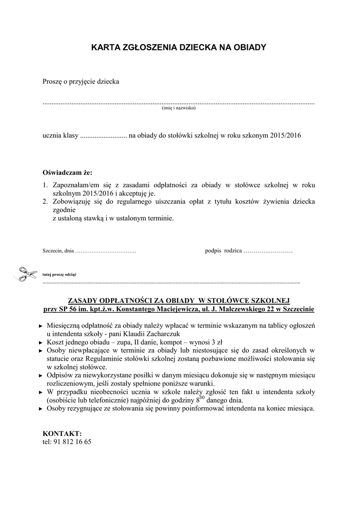 KARTA ZGŁOSZENIA DZIECKA NA OBIADY Proszę o przyjęcie dziecka ....................................................................................................................................................... (imię i nazwisko) ucznia klasy .......................... na obiady do stołówki szkolnej w roku szkonym 2015/2016 Oświadczam że: 1. Zapoznałam/em się z zasadami odpłatności za obiady w stołówce szkolnej w roku szkolnym 2015/2016 i akceptuję je. 2. Zobowiązuję się do regularnego uiszczania opłat z tytułu kosztów żywienia dziecka zgodnie z ustaloną stawką i w ustalonym terminie. Szczecin, dnia ……………………………. podpis rodzica ………….………… data i podpis tutaj proszę odciąć …………………………………………………………………………………………………………………………………………………………………. ZASADY ODPŁATNOŚCI ZA OBIADY W STOŁÓWCE SZKOLNEJ przy SP 56 im. kpt.ż.w. Konstantego Maciejewicza, ul. J. Malczewskiego 22 w Szczecinie ► ► ► ► ► ► Miesięczną odpłatność za obiady należy wpłacać w terminie wskazanym na tablicy ogłoszeń u intendenta szkoły - pani Klaudii Zacharczuk Koszt jednego obiadu – zupa, II danie, kompot – wynosi 3 zł Osoby niewpłacające w terminie za obiady lub niestosujące się do zasad określonych w statucie oraz Regulaminie stołówki szkolnej zostaną pozbawione możliwości stołowania się w szkolnej stołówce. Odpisów za niewykorzystane posiłki w danym miesiącu dokonuje się w następnym miesiącu rozliczeniowym, jeśli zostały spełnione poniższe warunki. W przypadku nieobecności ucznia w szkole należy zgłosić ten fakt u intendenta szkoły (osobiście lub telefonicznie) najpóźniej do godziny 800 danego dnia. Osoby rezygnujące ze stołowania się powinny poinformować intendenta na koniec miesiąca. KONTAKT: tel: 91 812 16 65