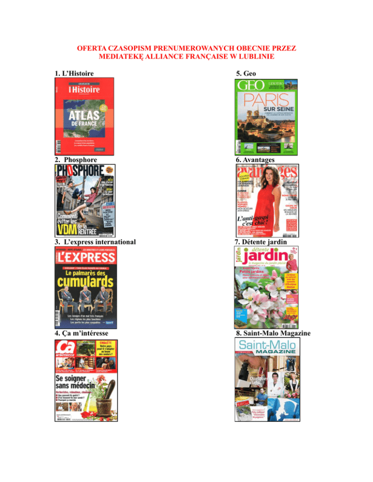 OFERTA CZASOPISM PRENUMEROWANYCH OBECNIE PRZEZ MEDIATEKĘ ALLIANCE FRANÇAISE W LUBLINIE 1. L’Histoire 5. Geo 2. Phosphore 6. Avantages 3. L’express international 7. Détente jardin 4. Ça m’intéresse 8. Saint-Malo Magazine