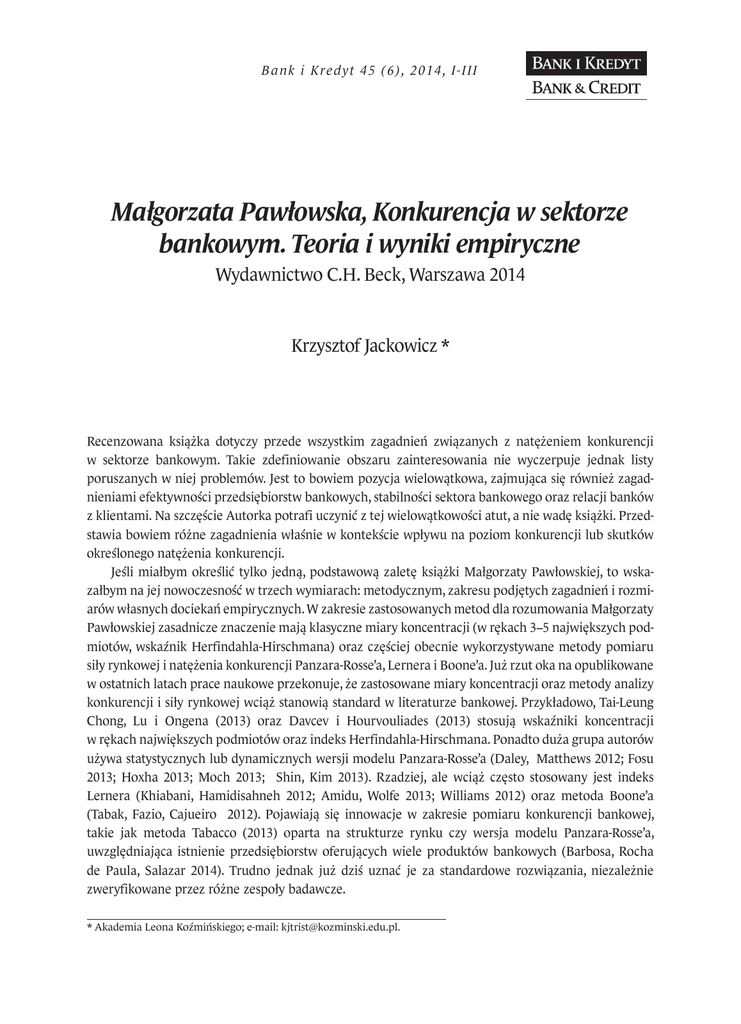 B ank i Kredy t 45 (6), 2014, I-III Małgorzata Pawłowska, Konkurencja w sektorze bankowym. Teoria i wyniki empiryczne Wydawnictwo C.H. Beck, Warszawa 2014 Krzysztof Jackowicz * Recenzowana książka dotyczy przede wszystkim zagadnień związanych z natężeniem konkurencji w sektorze bankowym. Takie zdefiniowanie obszaru zainteresowania nie wyczerpuje jednak listy poruszanych w niej problemów. Jest to bowiem pozycja wielowątkowa, zajmująca się również zagadnieniami efektywności przedsiębiorstw bankowych, stabilności sektora bankowego oraz relacji banków z klientami. Na szczęście Autorka potrafi uczynić z tej wielowątkowości atut, a nie wadę książki. Przedstawia bowiem różne zagadnienia właśnie w kontekście wpływu na poziom konkurencji lub skutków określonego natężenia konkurencji. Jeśli miałbym określić tylko jedną, podstawową zaletę książki Małgorzaty Pawłowskiej, to wskazałbym na jej nowoczesność w trzech wymiarach: metodycznym, zakresu podjętych zagadnień i rozmiarów własnych dociekań empirycznych. W zakresie zastosowanych metod dla rozumowania Małgorzaty Pawłowskiej zasadnicze znaczenie mają klasyczne miary koncentracji (w rękach 3−5 największych podmiotów, wskaźnik Herfindahla-Hirschmana) oraz częściej obecnie wykorzystywane metody pomiaru siły rynkowej i natężenia konkurencji Panzara-Rosse’a, Lernera i Boone’a. Już rzut oka na opublikowane w ostatnich latach prace naukowe przekonuje, że zastosowane miary koncentracji oraz metody analizy konkurencji i siły rynkowej wciąż stanowią standard w literaturze bankowej. Przykładowo, Tai-Leung Chong, Lu i Ongena (2013) oraz Davcev i Hourvouliades (2013) stosują wskaźniki koncentracji w rękach największych podmiotów oraz indeks Herfindahla-Hirschmana. Ponadto duża grupa autorów używa statystycznych lub dynamicznych wersji modelu Panzara-Rosse’a (Daley, Matthews 2012; Fosu 2013; Hoxha 2013; Moch 2013; Shin, Kim 2013). Rzadziej, ale wciąż często stosowany jest indeks Lernera (Khiabani, Hamidisahneh 2012; Amidu, Wolfe 2013; Williams 2012) oraz metoda Boone’a (Tabak, Fazio, Cajueiro 2012). Pojawiają się innowacje w zakresie pomiaru konkurencji bankowej, takie jak metoda Tabacco (2013) oparta na strukturze rynku czy wersja modelu Panzara-Rosse’a, uwzględniająca istnienie przedsiębiorstw oferujących wiele produktów bankowych (Barbosa, Rocha de Paula, Salazar 2014). Trudno jednak już dziś uznać je za standardowe rozwiązania, niezależnie zweryfikowane przez różne zespoły badawcze. * Akademia Leona Koźmińskiego; e-mail: [email protected]. II Recenzje Drugim wymiarem nowoczesności pracy Małgorzaty Pawłowskiej jest, jak już wspomniałem, uwzględnienie wielorakich oddziaływań struktury rynku bankowego i panującej na nim konkurencji na funkcjonowanie systemu finansowego oraz sfery realnej gospodarki. Podobnie wielowątkowa dyskusja toczy się w literaturze przedmiotu. Argumentów na poparcie tego stwierdzenia dostarcza ponownie analiza pozycji opublikowanych w ostatnich latach. Badane są związki konkurencji z innowacjami. Bos, Kolari i van Lamoen (2013) czynią to w odniesieniu do innowacji w samym sektorze bankowym, Cornaggia i in. (2014) dla niefinansowych spółek publicznych i przedsiębiorstw prywatnych. W obu przypadkach punktem wyjścia jest deregulacja w zakresie tworzenia sieci placówek w Stanach Zjednoczonych. Analizowane są też związki siły rynkowej i konkurencji z efektywnością banków: Williams (2012) dla banków z Ameryki Łacińskiej, Andrieş i Căpraru (2014) w przypadku banków z 27 krajów Unii Europejskiej, Kouki i Al-Nasser (2014) dla państw afrykańskich, oraz z ich zachętami do podejmowania ryzyka: Tabak, Fazio i Cajueiro (2014) dla 10 krajów Ameryki Łacińskiej. Spotyka się również prace, których główny cel jest skromniejszy i dotyczy określenia natężenia konkurencji lub stopnia koncentracji na nowych rynkach bądź po zajściu zdarzeń, które istotnie zmieniły strukturę rynku i przez to mogły mieć wpływ na obowiązujący model konkurencji między podmiotami sektora bankowego. Przykładowo, Shin i Kim (2013) sprawdzili, jak konsolidacja po azjatyckim kryzysie bankowym lat 1997−1998 wpłynęła na konkurencję w koreańskim sektorze bankowym. Daley i Matthews (2012) ustalili, że na Jamajce modele konkurencji zależą od tego, czy mamy do czynienia z bankami o charakterze inwestycyjnym czy typowymi bankami komercyjnymi. Fosu (2013) określił dominujący model konkurencji w wybranych państwach afrykańskich, natomiast Khabani i Hamidisahneh (2012) zweryfikowali skalę wpływu obniżenia barier wejścia i rozwoju banków prywatnych na konkurencję w irańskim sektorze bankowym. Studiuje się także związki koncentracji oraz konkurencji z możliwościami i kosztem pozyskania kredytu, a przez to możliwościami zewnętrznego finansowania rozwoju przez podmioty ze sfery realnej gospodarki. Referowane w literaturze wyniki badań empirycznych nie są jednoznaczne. Z jednej strony Tai-Leung Chong, Lu i Ongena (2013) dowodzą, że na mniej skoncentrowanych rynkach ograniczenia w finansowaniu, jakie napotykają małe i średnie przedsiębiorstwa, są mniej dotkliwe. Z drugiej strony Hoxha (2013) pokazuje, że gałęzie przemysłu zależne od zewnętrznego finansowania rozwijają się w warunkach ograniczonej konkurencji w sektorze bankowym i jego większej koncentracji. Do omawianego obecnie nurtu należy też praca Chortareasa, Garza-Garcii i Girardone (2012), analizująca związek konkurencji i koncentracji z marżami odsetkowymi realizowanymi przez banki. Trzecią cechą świadczącą o nowoczesności książki Małgorzaty Pawłowskiej jest zaprezentowanie w niej wyników własnych, obszernych badań empirycznych. Autorka od lat studiuje zagadnienia związane z konkurencją i konkurencyjnością i jest jednym z niewielu specjalistów w tym zakresie w naszym kraju. Napisana obecnie praca podsum