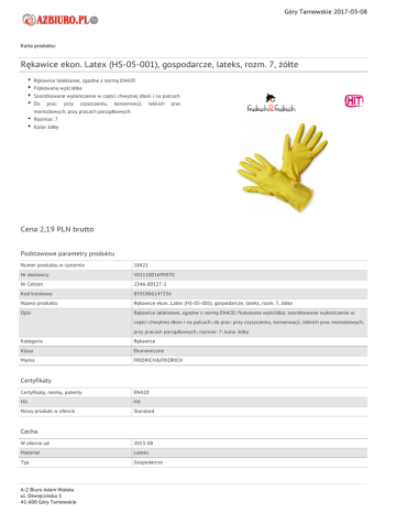 Góry Tarnowskie 2017-03-08 Karta produktu: Rękawice ekon. Latex (HS-05-001), gospodarcze, lateks, rozm. 7, żółte Rękawice lateksowe, zgodne z normą EN420 Flokowana wyściółka Szorstkowane wykończenie w części chwytnej dłoni i na palcach Do prac: przy czyszczeniu, konserwacji, lekkich prac montażowych, przy pracach porządkowych Rozmiar: 7 Kolor żółty Cena 2,19 PLN brutto Podstawowe parametry produktu Numer produktu w systemie 18421 Nr dostawcy V0111001699070 Nr Celcen 2346-00127-2 Kod kreskowy 8591806147256 Nazwa produktu Rękawice ekon. Latex (HS-05-001), gospodarcze, lateks, rozm. 7, żółte Opis Rękawice lateksowe, zgodne z normą EN420; flokowana wyściółka; szorstkowane wykończenie w części chwytnej dłoni i na palcach; do prac: przy czyszczeniu, konserwacji, lekkich prac montażowych, przy pracach porządkowych; rozmiar: 7; kolor żółty Kategoria Rękawice Klasa Ekonomiczne Marka FRIDRICH&FRIDRICH Certyfikaty Certyfikaty, normy, patenty EN420 Hit Hit Nowy produkt w ofercie Standard Cecha W ofercie od 2013-08 Materiał Lateks Typ Gospodarcze A-Z Biuro Adam Watoła ul. Oświęcimska 3 41-600 Góry Tarnowskie Góry Tarnowskie 2017-03-08 Karta katalogowa produktu cd. Rękawice ekon. Latex (HS-05-001), gospodarcze, lateks, rozm. 7, żółte Produkt Rękawice Rodzaj Ekonomiczne Wymiary Rozmiar 7 Wspólny słownik zamówień CPV 18143000-3 Kolor Kolor Pozostałe zdjęcia produktu Serdecznie zapraszamy do współpracy A-Z Biuro Adam Watoła zespół. A-Z Biuro Adam Watoła ul. Oświęcimska 3 41-600 Góry Tarnowskie Żółty
