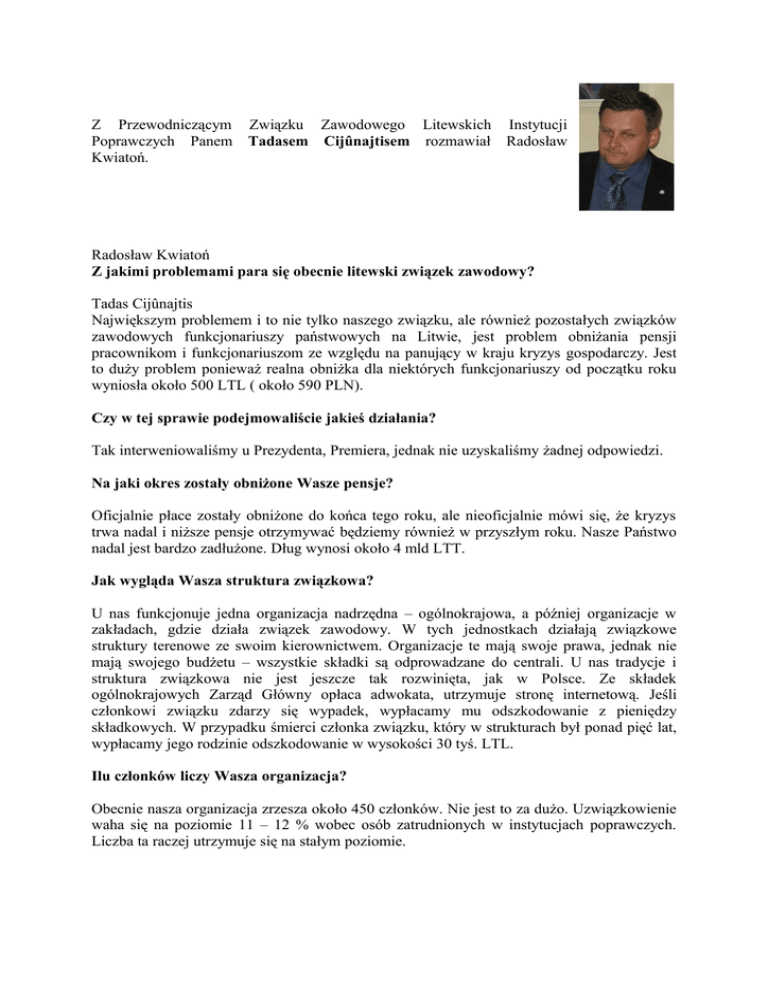 Z Przewodniczącym Poprawczych Panem Kwiatoń. Związku Zawodowego Litewskich Instytucji Tadasem Cijûnajtisem rozmawiał Radosław Radosław Kwiatoń Z jakimi problemami para się obecnie litewski związek zawodowy? Tadas Cijûnajtis Największym problemem i to nie tylko naszego związku, ale również pozostałych związków zawodowych funkcjonariuszy państwowych na Litwie, jest problem obniżania pensji pracownikom i funkcjonariuszom ze względu na panujący w kraju kryzys gospodarczy. Jest to duży problem ponieważ realna obniżka dla niektórych funkcjonariuszy od początku roku wyniosła około 500 LTL ( około 590 PLN). Czy w tej sprawie podejmowaliście jakieś działania? Tak interweniowaliśmy u Prezydenta, Premiera, jednak nie uzyskaliśmy żadnej odpowiedzi. Na jaki okres zostały obniżone Wasze pensje? Oficjalnie płace zostały obniżone do końca tego roku, ale nieoficjalnie mówi się, że kryzys trwa nadal i niższe pensje otrzymywać będziemy również w przyszłym roku. Nasze Państwo nadal jest bardzo zadłużone. Dług wynosi około 4 mld LTT. Jak wygląda Wasza struktura związkowa? U nas funkcjonuje jedna organizacja nadrzędna – ogólnokrajowa, a później organizacje w zakładach, gdzie działa związek zawodowy. W tych jednostkach działają związkowe struktury terenowe ze swoim kierownictwem. Organizacje te mają swoje prawa, jednak nie mają swojego budżetu – wszystkie składki są odprowadzane do centrali. U nas tradycje i struktura związkowa nie jest jeszcze tak rozwinięta, jak w Polsce. Ze składek ogólnokrajowych Zarząd Główny opłaca adwokata, utrzymuje stronę internetową. Jeśli członkowi związku zdarzy się wypadek, wypłacamy mu odszkodowanie z pieniędzy składkowych. W przypadku śmierci członka związku, który w strukturach był ponad pięć lat, wypłacamy jego rodzinie odszkodowanie w wysokości 30 tyś. LTL. Ilu członków liczy Wasza organizacja? Obecnie nasza organizacja zrzesza około 450 członków. Nie jest to za dużo. Uzwiązkowienie waha się na poziomie 11 – 12 % wobec osób zatrudnionych w instytucjach poprawczych. Liczba ta raczej utrzymuje się na stałym poziomie. Jak organizacja związkowa jest postrzegana przez kierownictwo zakładów? Jest z tym bardzo różnie. Niektórzy dyrektorzy tolerują organizacje związkowe, jednak nie za bardzo liczą się z Przewodniczącymi organizacji terenowych. Jeśli np. ja przyjeżdżam do zakładu, to wtedy dyrektor robi kawę, chce ze mną rozmawiać, obiecuje dużo rzeczy. Jednak już po moim wyjeździe Przewodniczący terenowi nie mają lekkiego życia, a dyrektorzy nie kwapią się do tego, aby robić to co mi obiecali. W takich przypadkach rozmawiam bezpośrednio z Dyrektorem Generalnym, wskazuję mu nieprawidłowości w poszczególnych zakładach, a on poleca podjąć konkretne działania. Obecnie współpraca z nim układa się bardzo dobrze. Traktuje Związek jako partnera. Jako, że ja pierwszy otrzymuję sygnały o nieprawidłowościach w zakładach, Dyrektor Generalny poprosił mnie, żebym z tymi sygnałami zwracać się bezpośrednio do niego, a nie do Ministra Sprawiedliwości, czy prasy. Jego reakcja jest wtedy bardzo szybka. Jakieś trzy miesiące temu w jednym z naszych zakładów pojawił się problem – funkcjonariuszom źle naliczone pensję. Niektórzy otrzymywali mniej inni więcej, a powinni otrzymywać tyle samo. Wykonałem wtedy telefon do Dyrektora Generalnego. Ten natychmiast wysłał tam kontrolę, która wykazała nieprawidłowości. Dyrektor tej jednostki został ukarany. Czy oprócz kontaktów z polskim związkiem zawodowym utrzymujecie jeszcze kontakty z innymi branżowymi związkami zawodowymi? Do tej pory nasze kontakty na niwie związkowej utrzymywaliśmy tylko z Polakami. Ostatnio udało mi się pozyskać adresy podobnych związków we Francji, Anglii i będziemy próbowali nawiązać z nimi kontakt. Co zmieniło się u Was od czasu kiedy nawiązaliśmy współpracę. Czy fakt kontaktów z polskim związkiem zawodowym pomógł Ci w pracy związkowej? Dzięki współpracy z Wami udało nam się już przenieść na nasz grunt wiele zapisów z waszych rozporządzeń i Statutu, które to ułatwiły nam pracę. Dzięki przyjaźni z Polakami inaczej postrzegają nasz związek również dyrektorzy. Zauważyli, że nie jesteśmy już odosobnioną strukturą, tylko jeśli zajdzie taka potrzeba to wtedy polski związek pomoże nam w naszych działaniach. Mam nadzieję, że już wkrótce uda nam się zrobić to, o czym rozmawialiśmy wcześniej, czyli założyć europejskie stowarzyszenie związków zawodowych funkcjonariuszy i pracowników więzień. To także podniesie rangę naszej organizacji. Dziękuję bardzo za rozmowę i do zobaczenia tym razem w Polsce! Dziękuję również! Radosław Kwiatoń Biuro Zarządu Głównego NSZZ FiPW