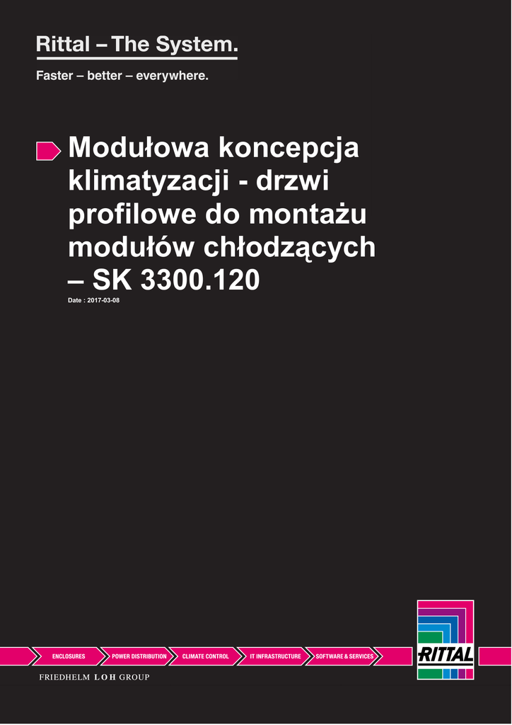 Modułowa koncepcja klimatyzacji - drzwi profilowe do montażu modułów chłodzących – SK 3300.120 Date : 2017-03-08 Modułowa koncepcja klimatyzacji - drzwi profilowe do montażu modułów chłodzących – SK 3300.120 created: 08.03.2017 on www.rittal.com/pl-pl Opis produktu Materiał: Blacha stalowa Kolor: RAL 7035 Zakres dostawy: Drzwi profilowe bez zamontowanego modułu klimatyzacyjnego Zawiasy TS 8, kąt otwarcia drzwi ok. 110° Wskazówka: Poniższa informacja dotyczy szaf TS 8 o szerokości 1200 mm W przypadku „prawego“ położenia urządzenia, 1 opakowanie zawiera drzwi profilowane z zawiasami do montażu na prawej połowie szafy plus specjalne skrzydło drzwi z zamkiem do lewej połowy szafy. W przypadku „lewego“ położenia urządzenia, 1 opakowanie zawiera drzwi profilowe z zawiasami do montażu na lewej połowie szafy. Można użyć dostępnego prawego skrzydła drzwi z zamkiem. Cechy produktu Pasujący do: TS 8 o szerokości: = 1200 mm o wysokości: = 2000 mm Wskazówka: Położenie urządzenia z prawej strony Jednostka opakowania: 1 szt. Masa/opak.: 57,5 kg EAN: 4028177560154 © Rittal 2017 1 Numer taryfy celnej: 94039010 ETIM 6.0: EC002510 ETIM 5.0: EC002510 eCl@ss 8.0/8.1: 27180702 eCl@ss 7.0/7.1: 27180702 eCl@ss 6.0/6.1: 27180702 eCl@ss 5.1/5.1.4: 27180702 Atesty Objaśnienia: NA 2017 © Rittal Sp. z o o. © Rittal 2017 2