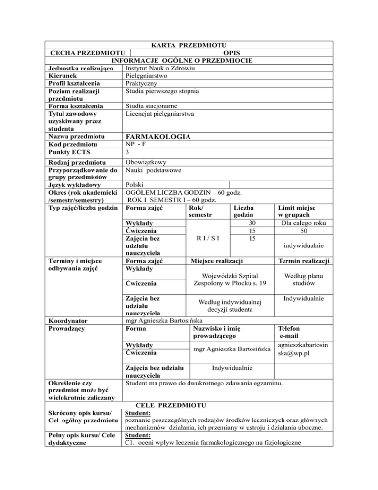 KARTA PRZEDMIOTU CECHA PRZEDMIOTU OPIS INFORMACJE OGÓLNE O PRZEDMIOCIE Instytut Nauk o Zdrowiu Jednostka realizująca Pielęgniarstwo Kierunek Praktyczny Profil kształcenia Studia pierwszego stopnia Poziom realizacji przedmiotu Studia stacjonarne Forma kształcenia Licencjat pielęgniarstwa Tytuł zawodowy uzyskiwany przez studenta Nazwa przedmiotu FARMAKOLOGIA NP - F Kod przedmiotu 3 Punkty ECTS Rodzaj przedmiotu Przyporządkowanie do grupy przedmiotów Język wykładowy Okres (rok akademicki /semestr/semestry) Typ zajęć/liczba godzin Terminy i miejsce odbywania zajęć Koordynator Prowadzący Określenie czy przedmiot może być wielokrotnie zaliczany Obowiązkowy Nauki podstawowe Polski OGÓŁEM LICZBA GODZIN – 60 godz. ROK I SEMESTR I – 60 godz. Forma zajęć Rok/ Liczba semestr godzin 30 Wykłady 15 Ćwiczenia RI/SI 15 Zajęcia bez udziału nauczyciela Forma zajęć Miejsce realizacji Wykłady Wojewódzki Szpital Zespolony w Płocku s. 19 Ćwiczenia Zajęcia bez Według indywidualnej udziału decyzji studenta nauczyciela mgr Agnieszka Bartosińska Forma Nazwisko i imię prowadzącego Wykłady mgr Agnieszka Bartosińska Ćwiczenia Limit miejsc w grupach Dla całego roku 50 indywidualnie Termin realizacji Według planu studiów Indywidualnie Telefon e-mail agnieszkabartosin [email protected] Indywidualnie Zajęcia bez udziału nauczyciela Student ma prawo do dwukrotnego zdawania egzaminu. CELE PRZEDMIOTU Skrócony opis kursu/ Student: Cel ogólny przedmiotu poznanie poszczególnych rodzajów środków leczniczych oraz głównych mechanizmów działania, ich przemiany w ustroju i działania uboczne. Pełny opis kursu/ Cele Student: C1. oceni wpływ leczenia farmakologicznego na fizjologiczne dydaktyczne wynikające z realizacji przedmiotu Wymagania wstępne prac pisemnych i biochemiczne procesy zachodzące w poszczególnych narządach, C2. zróżnicuje poszczególne grupy leków i ich zastosowanie lecznicze. WYMAGANIA WSTĘPNE Podstawy anatomii i fizjologii człowieka. Wykaz uzyskanych umiejętności/ efekty uczenia się - WIEDZA Wykaz uzyskanych umiejętności/ efekty uczenia się - UMIEJĘTNOŚCI Wykaz uzyskanych umiejętności/ efekty uczenia się – KOMPETENCJE SPOŁECZNE Wykaz uzyskanych umiejętności/ efekty uczenia się - WIEDZA Wykaz uzyskanych EFEKTY KSZTAŁCENIA PRZEDMIOT Student: W1. charakteryzuje poszczególne grupy środków leczniczych, główne mechanizmy działania, przemiany w ustroju i działania uboczne, W2. omawia podstawowe zasady farmakoterapii, W3. charakteryzuje poszczególne grupy leków i ich zastosowanie lecznicze oraz zasady leczenia krwią i środkami krwiozastępczymi. Student: U1. ocenia wpływ leczenia farmakologicznego na fizjologiczne i biochemiczne procesy zachodzące w poszczególnych narządach, U2. różnicuje poszczególne grupy leków i ich zastosowanie lecznicze, U3. zna problematykę leczenia krwią i środkami krwiozastępczymi U4. szacuje niebezpieczeństwo toksykologiczne w określonych grupach oraz w różnych stanach klinicznych. Student: K1. systematycznie wzbogaca wiedzę z zakresu farmakologii dążąc do profesjonalizmu zawodowego, K2. rzetelnie i dokładnie wykonuje obowiązki zawodowe. EFEKTY KSZTAŁCENIA WYKŁADY Student: W1. definiuje pojęcia z zakresu farmakodynamiki i farmakokinetyki leków, W2. charakteryzuje zasady i sposoby przygotowania leków, krwi i środków krwiozastępczych, W3. wyjaśnia działania leków na poszczególne układy organizmu człowieka, W4. różnicuje chemioterapeutyki pod względem mechanizmu, działania i budowy chemicznej, W5. opisuje mechanizm działania leków przeciwnowotworowych, W6. wyjaśnia mechanizmy działania leków z różnych grup leków wg teorii receptorowej i chemicznego mechanizmu działania leków, W7. różnicuje substancje o działaniu dezynfekcyjnym i antyseptycznym. Student: U1. klasyfikuje leki do poszczególnych grup leków, U2. przestrzega standardów postępowania w zakresie podawania krwi i środków krwiozastępczych, U3. bezpiecznie przechowuje leki, U4. wyłania objawy niepożądanego działania leku, U5. reaguje w sytuacjach niepożądanego działania leków, U6. analizuje działanie leków stosowanych w schorzeniach ze strony poszczególnych układów w organizmie człowieka, U7. dobiera chemiczne środki dezynfekcyjne do celu zastosowania. Wykaz uzyskanych Student: K1. systematycznie wzbogaca wiedzę zawodową i kształtuje umiejętności/ efekty uczenia umiejętności dążąc do profesjonalizmu, się – KOMPETENCJE K2. rzetelnie i dokładnie wykonuje obowiązki zawodowe, SPOLECZNE K3. wykazuje odpowiedzialność indywidualną i zespołową w farmakoterapii. TREŚCI PROGRAMOWE FORMA TEMAT LICZBA SUMA ZAJĘĆ GODZIN GODZI N 1. Podstawowe pojęcia z zakresu farmakologii 3 WYKŁADY 30 i farmakodynamiki. 2. Losy leku w ustroju- procesy LADME (dostępność 3 biologiczna i farmaceutyczna). 3. Grupy leków i mechanizmy działania leków (teoria 4 receptorowa, mechanizmy działania leków). 4. Pojęcie interakcji w fazie farmaceutycznej oraz 3 interakcji farmakologicznej (synergizm addycyjny, hiperaddycyjny antagonizm). 5. Chemioterapeutyki: podział antybiotyków pod 4 względem mechanizmu działania, budowy chemicznej, leki przeciwwirusowe, leki przeciwgruźlicze, przeciwpierwotniakowe, przeciwgrzybiczne, przeciwrobacze. 6. Pojęcie uzależnienia lekowego. 3 7. Substancje o działaniu dezynfekcyjnym 4 i antyseptycznym. 8. Opioidowe i nieopioidowe leki przeciwbólowe, 3 leki znieczulenia miejscowego i ogólnego 9. Stosowanie leków w okresie ciąży i laktacji. 3 EFEKTY KSZTAŁCENIA ĆWICZENIA Student: Wykaz uzyskanych W1 charakteryzuje podstawowe zagadnienia z zakresu umiejętności/ efekty farmakodynamiki i farmakokinetyki leków; uczenia się – WIEDZA W2 charakteryzuje sposoby przygotowania leków, krwi i środków krwiozastępczych; W3 określa metody wprowadzania leków do organizmu i ich dawkowanie; W4 wyjaśnia reakcje organizmu na działanie leków; W5