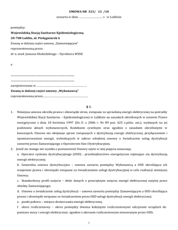 UMOWA NR 323/ 12 /10 zawarta w dniu ……………………….. r. w Lublinie pomiędzy: Wojewódzką Stacją Sanitarno-Epidemiologiczną 20-708 Lublin, ul. Pielęgniarek 6 Zwaną w dalszej części umowy „Zamawiającym” reprezentowaną przez: dr n. med. Janusza Słodzińskiego – Dyrektora WSSE a ………………………………………………………………… ………………………………………………………………… zarejestrowana w ……………………………………………………. Zwaną w dalszej części umowy „Wykonawcą” reprezentowana przez:……………………………………………… § 1. 1. Niniejsza umowa określa prawa i obowiązki stron, związane ze sprzedażą energii elektrycznej na potrzeby Wojewódzkiej Stacji Sanitarno – Epidemiologicznej w Lublinie na zasadach określonych w ustawie Prawo energetyczne z dnia 10 kwietnia 1997 (Dz. U. z 2006 r. Nr 89 poz. 625 z późn. zm.), wydanych na jej podstawie aktach wykonawczych, Kodeksem cywilnym oraz zgodnie z zasadami określonymi w koncesjach. Umowa nie obejmuje spraw związanych z dystrybucją energii elektrycznej, przyłączeniem i opomiarowaniem energii, wchodzących w zakres odrębnej umowy o świadczenie usług dystrybucji zawartej przez Zamawiającego z Operatorem Sieci Dystrybucyjnej. 2. Jeżeli nic innego nie wynika z postanowień Umowy użyte w niej pojęcia oznaczają: a. Operator systemu dystrybucyjnego (OSD) - przedsiębiorstwo energetyczne zajmujące się dystrybucją energii elektrycznej; b. Generalna umowa dystrybucyjna – umowa zawarta pomiędzy Wykonawcą a OSD określająca ich wzajemne prawa i obowiązki związane za świadczeniem usługi dystrybucyjnej w celu realizacji niniejszej Umowy; c. Standardowy profil zużycia – zbiór danych o przeciętnym zużyciu energii elektrycznej zużytej przez obiekty Zamawiającego; d. Umowa o świadczenie usług dystrybucji – umowa zawarta pomiędzy Zamawiającym a OSD określająca prawa i obowiązki związane ze świadczeniem przez OSD usługi dystrybucji energii elektrycznej; e. punkt poboru – miejsce dostarczania energii elektrycznej, f. okres rozliczeniowy – okres pomiędzy dwoma kolejnymi rozliczeniowymi odczytami urządzeń do pomiaru mocy i energii elektrycznej -zgodnie z okresem rozliczeniowym stosowanym przez OSD; 1 3. Przedmiot umowy szczegółowo określa „Specyfikacja Istotnych Warunków Zamówienia”, stanowiąca załącznik do umowy. § 2. 1. Wykonawca zobowiązuje się do sprzedaży, a Zamawiający zobowiązuje się do kupna energii elektrycznej dla punktów poboru: budynek A oraz budynek B, należące do Wojewódzkiej Stacji Sanitarno – Epidemiologicznej w Lublinie położone w Lublinie przy ulicy Pielęgniarek 6. 2. Łączną ilość energii elektrycznej, która będzie dostarczona w okresie obowiązywania umowy do punktów poboru szacuje się na 220 000 kWh (+/- 10%). 3. Moc umowna, grupa taryfowa oraz miejsce dostarczenia energii elektrycznej dla punktów poboru określone są w specyfikacji istotnych warunków zamówienia. 4. Wykonawca zobowiązuje się również do pełnienia funkcji podmiotu odpowiedzialnego za bilansowanie handlowe dla energii elektrycznej sprzedanej w ramach tej umowy. Rozliczenia za energię elektryczną odbywać się będą na podstawie odczytów wskazań liczników, dokonywanych przez Wykonawcę w terminach przez niego ustalonych, w okresach jednomiesięcznych. 5. Koszty wynikające z dokonania bilansowania uwzględnione są w cenie energii elektrycznej podanej w formularzu ofertowym. 6. Energia elektryczna kupowana na podstawie niniejszej umowy zużywana będzie na potrzeby odbiorcy końcowego. 7. Określone przez Zamawiającego prognozowane zużycie energii ma charakter jedynie orientacyjny i nie stanowi z jego strony zobowiązania do zakupu energii w podanej ilości. §3 Standardy jakości obsługi 1. Standardy jakości obsługi Zamawiającego zostały określone w obowiązujących przepisach wykonawczych wydanych na podstawie Ustawy z dnia 10 kwietnia 1997 r. – Prawo energetyczne. 2. W przypadku niedotrzymania jakościowych standardów obsługi Zamawiającemu na jego pisemny wniosek przysługuje prawo bonifikaty lub upustu według stawek określonych w § 38 Rozporządzenia Ministra Gospodarki z dnia 2 lipca 2007 r. w sprawie szczegółowych zasad kształtowania i kalkulacji taryf oraz rozliczeń w obrocie energią elektryczną (Dz. U. z 2007 r. Nr 128 poz. 895) lub w każdym później wydanym akcie prawnym określającym te stawki. § 4. Podstawowe obowiązki Zamawiającego i Wykonawcy 1. Do obowiązków Zamawiającego należy: a. Pobieranie energii elektrycznej zgodnie z warunkami Umowy oraz obowiązującymi przepisami prawa. b. Terminowe regulowanie należności za zakupioną energię elektryczną. 2 2. Do obowiązków Wykonawcy należy: a. Sprzedaży energii elektrycznej zgodnie z warunkami określonymi w niniejszej umowie, ustawie – Prawo energetyczne oraz aktach wykonawczych wydanych na jej podstawie. b. Posiadania Generalnej Umowy Dystrybucyjnej zawartej z OSD ( PGE Dystrybucja LUBZEL Sp. z o.o. ) przez cały okres obowiązywania umowy i wskazania jej numeru Zamawiającemu najpóźniej w dniu podpisania umowy. Wykonawca zapewni, że Generalna Umowa Dystrybucyjna pozostanie ważna przez cały okres obowiązywania umowy. W przypadku niezawarcia Generalnej Umowy Dystrybucyjnej lub jej rozwiązania, Zamawiający ma prawo odstąpić od niniejszej umowy lub ja wypowiedzieć w trybie natychmiastowym, a także niezależnie od powyższych uprawnień, obciążyć Wykonawcę karą umowną w wysokości 2000 zł ( słownie: dwa tysiące złotych ). c. Przestrzeganie standardów jakościowych obsługi odbiorców. d. Przyjmowanie od Zamawiającego, w uzgodnionym czasie, zgłoszeń i reklamacji, dotyczących dostarczanej energii elektrycznej. § 5. Zasady rozliczeń 1. Sprzedawana energia elektryczna będzie rozliczana według ceny jednostkowej energ