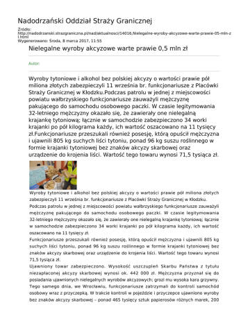 Nadodrzański Oddział Straży Granicznej Źródło: http://nadodrzanski.strazgraniczna.pl/nad/aktualnosci/14016,Nielegalne-wyroby-akcyzowe-warte-prawie-05-mln-z l.html Wygenerowano: Środa, 8 marca 2017, 11:55 Nielegalne wyroby akcyzowe warte prawie 0,5 mln zł Autor: Wyroby tytoniowe i alkohol bez polskiej akcyzy o wartości prawie pół miliona złotych zabezpieczyli 11 września br. funkcjonariusze z Placówki Straży Granicznej w Kłodzku.Podczas patrolu w jednej z miejscowości powiatu wałbrzyskiego funkcjonariusze zauważyli mężczyznę pakującego do samochodu osobowego paczki. W czasie legitymowania 32-letniego mężczyzny okazało się, że zawierały one nielegalną krajankę tytoniową; łącznie w samochodzie zabezpieczono 34 worki krajanki po pół kilograma każdy, ich wartość oszacowano na 11 tysięcy zł.Funkcjonariusze przeszukali również posesję, którą opuścił mężczyzna i ujawnili 805 kg suchych liści tytoniu, ponad 96 kg suszu roślinnego w formie krajanki tytoniowej bez znaków akcyzy skarbowej oraz urządzenie do krojenia liści. Wartość tego towaru wynosi 71,5 tysiąca zł. Wyroby tytoniowe i alkohol bez polskiej akcyzy o wartości prawie pół miliona złotych zabezpieczyli 11 września br. funkcjonariusze z Placówki Straży Granicznej w Kłodzku. Podczas patrolu w jednej z miejscowości powiatu wałbrzyskiego funkcjonariusze zauważyli mężczyznę pakującego do samochodu osobowego paczki. W czasie legitymowania 32-letniego mężczyzny okazało się, że zawierały one nielegalną krajankę tytoniową; łącznie w samochodzie zabezpieczono 34 worki krajanki po pół kilograma każdy, ich wartość oszacowano na 11 tysięcy zł. Funkcjonariusze przeszukali również posesję, którą opuścił mężczyzna i ujawnili 805 kg suchych liści tytoniu, ponad 96 kg suszu roślinnego w formie krajanki tytoniowej bez znaków akcyzy skarbowej oraz urządzenie do krojenia liści. Wartość tego towaru wynosi 71,5 tysiąca zł. Ujawniony towar zabezpieczono. Wysokość uszczupleń Skarbu Państwa z tytułu niezapłaconej akcyzy skarbowej wynosi ok. 442 000 zł. Mężczyzna przyznał się do posiadania ujawnionych nielegalnych wyrobów akcyzowych; grozi mu wysoka kara grzywny. Tego samego dnia, we Wrocławiu, funkcjonariusze zatrzymali do kontroli samochód osobowy wraz z przyczepką. W trakcie kontroli w pojeździe i przyczepce ujawniono wyroby bez znaków akcyzy skarbowej – ponad 465 tysięcy sztuk papierosów różnych marek, 200 woreczków krajanki tytoniowej po ok. 0,5 kg każda, 112 butelek o pojemności 0,5 litra oraz 42 butelki o pojemności 1 litra z napisami „POLSKI SPIRYTUS RATYFIKOWANY 95 %”, a także 11 plastikowych pojemników o pojemności ok. 30 litrów każdy. Łączna szacunkowa wartość zabezpieczonego towaru to prawie 400 tysięcy zł; przy wprowadzeniu towaru do obrotu Skarb Państwa mógł stracić ok. 470 tysięcy zł. Kierowca kontrolowanego pojazdu przyznał się do posiadania wyrobów bez akcyzy. Mężczyźnie postawiono zarzut naruszenia przepisów kodeksu karnego skarbowego, za które grozi wysoka grzywna, kara trzech lat pozbawienia wolności lub obie te kary łącznie.