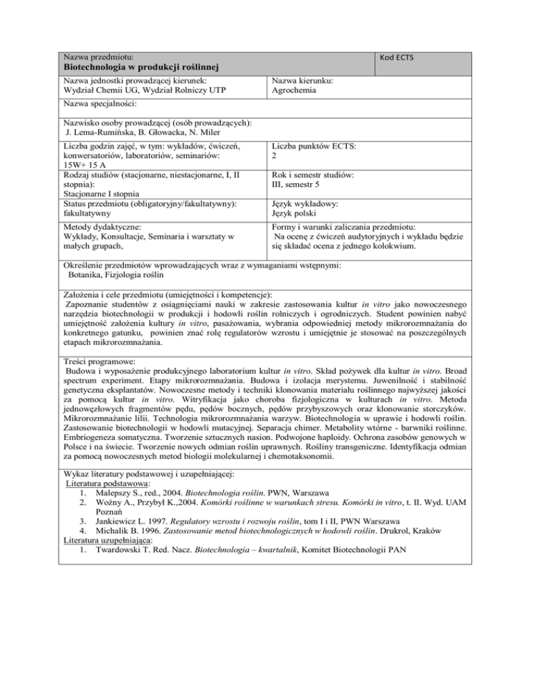 Kod ECTS Nazwa przedmiotu: Biotechnologia w produkcji roślinnej Nazwa jednostki prowadzącej kierunek: Wydział Chemii UG, Wydział Rolniczy UTP Nazwa kierunku: Agrochemia Nazwa specjalności: Nazwisko osoby prowadzącej (osób prowadzących): J. Lema-Rumińska, B. Głowacka, N. Miler Liczba godzin zajęć, w tym: wykładów, ćwiczeń, konwersatoriów, laboratoriów, seminariów: 15W+ 15 A Rodzaj studiów (stacjonarne, niestacjonarne, I, II stopnia): Stacjonarne I stopnia Status przedmiotu (obligatoryjny/fakultatywny): fakultatywny Liczba punktów ECTS: 2 Metody dydaktyczne: Wykłady, Konsultacje, Seminaria i warsztaty w małych grupach, Formy i warunki zaliczania przedmiotu: Na ocenę z ćwiczeń audytoryjnych i wykładu będzie się składać ocena z jednego kolokwium. Rok i semestr studiów: III, semestr 5 Język wykładowy: Język polski Określenie przedmiotów wprowadzających wraz z wymaganiami wstępnymi: Botanika, Fizjologia roślin Założenia i cele przedmiotu (umiejętności i kompetencje): Zapoznanie studentów z osiągnięciami nauki w zakresie zastosowania kultur in vitro jako nowoczesnego narzędzia biotechnologii w produkcji i hodowli roślin rolniczych i ogrodniczych. Student powinien nabyć umiejętność założenia kultury in vitro, pasażowania, wybrania odpowiedniej metody mikrorozmnażania do konkretnego gatunku, powinien znać rolę regulatorów wzrostu i umiejętnie je stosować na poszczególnych etapach mikrorozmnażania. Treści programowe: Budowa i wyposażenie produkcyjnego laboratorium kultur in vitro. Skład pożywek dla kultur in vitro. Broad spectrum experiment. Etapy mikrorozmnażania. Budowa i izolacja merystemu. Juwenilność i stabilność genetyczna eksplantatów. Nowoczesne metody i techniki klonowania materiału roślinnego najwyższej jakości za pomocą kultur in vitro. Witryfikacja jako choroba fizjologiczna w kulturach in vitro. Metoda jednowęzłowych fragmentów pędu, pędów bocznych, pędów przybyszowych oraz klonowanie storczyków. Mikrorozmnażanie lilii. Technologia mikrorozmnażania warzyw. Biotechnologia w uprawie i hodowli roślin. Zastosowanie biotechnologii w hodowli mutacyjnej. Separacja chimer. Metabolity wtórne - barwniki roślinne. Embriogeneza somatyczna. Tworzenie sztucznych nasion. Podwojone haploidy. Ochrona zasobów genowych w Polsce i na świecie. Tworzenie nowych odmian roślin uprawnych. Rośliny transgeniczne. Identyfikacja odmian za pomocą nowoczesnych metod biologii molekularnej i chemotaksonomii. Wykaz literatury podstawowej i uzupełniającej: Literatura podstawowa: 1. Malepszy S., red., 2004. Biotechnologia roślin. PWN, Warszawa 2. Woźny A., Przybył K.,2004. Komórki roślinne w warunkach stresu. Komórki in vitro, t. II. Wyd. UAM Poznań 3. Jankiewicz L. 1997. Regulatory wzrostu i rozwoju roślin, tom I i II, PWN Warszawa 4. Michalik B. 1996. Zastosowanie metod biotechnologicznych w hodowli roślin. Drukrol, Kraków Literatura uzupełniająca: 1. Twardowski T. Red. Nacz. Biotechnologia – kwartalnik, Komitet Biotechnologii PAN