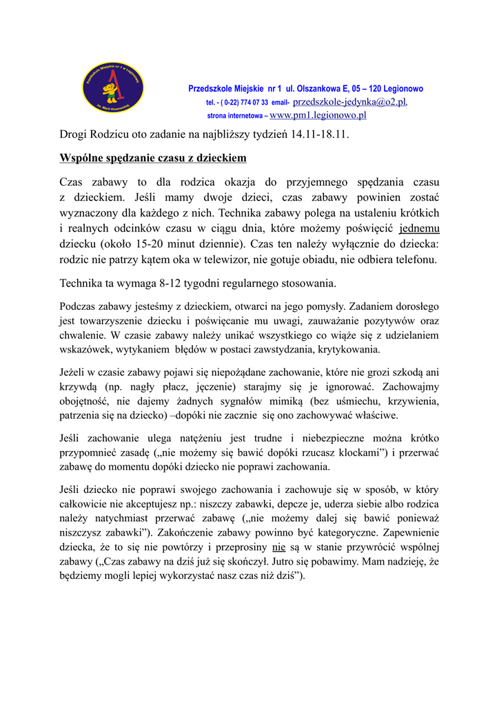 Przedszkole Miejskie nr 1 ul. Olszankowa E, 05 – 120 Legionowo [email protected], strona internetowa – www.pm1.legionowo.pl tel. - ( 0-22) 774 07 33 email- Drogi Rodzicu oto zadanie na najbliższy tydzień 14.11-18.11. Wspólne spędzanie czasu z dzieckiem Czas zabawy to dla rodzica okazja do przyjemnego spędzania czasu z dzieckiem. Jeśli mamy dwoje dzieci, czas zabawy powinien zostać wyznaczony dla każdego z nich. Technika zabawy polega na ustaleniu krótkich i realnych odcinków czasu w ciągu dnia, które możemy poświęcić jednemu dziecku (około 15-20 minut dziennie). Czas ten należy wyłącznie do dziecka: rodzic nie patrzy kątem oka w telewizor, nie gotuje obiadu, nie odbiera telefonu. Technika ta wymaga 8-12 tygodni regularnego stosowania. Podczas zabawy jesteśmy z dzieckiem, otwarci na jego pomysły. Zadaniem dorosłego jest towarzyszenie dziecku i poświęcanie mu uwagi, zauważanie pozytywów oraz chwalenie. W czasie zabawy należy unikać wszystkiego co wiąże się z udzielaniem wskazówek, wytykaniem błędów w postaci zawstydzania, krytykowania. Jeżeli w czasie zabawy pojawi się niepożądane zachowanie, które nie grozi szkodą ani krzywdą (np. nagły płacz, jęczenie) starajmy się je ignorować. Zachowajmy obojętność, nie dajemy żadnych sygnałów mimiką (bez uśmiechu, krzywienia, patrzenia się na dziecko) –dopóki nie zacznie się ono zachowywać właściwe. Jeśli zachowanie ulega natężeniu jest trudne i niebezpieczne można krótko przypomnieć zasadę („nie możemy się bawić dopóki rzucasz klockami”) i przerwać zabawę do momentu dopóki dziecko nie poprawi zachowania. Jeśli dziecko nie poprawi swojego zachowania i zachowuje się w sposób, w który całkowicie nie akceptujesz np.: niszczy zabawki, depcze je, uderza siebie albo rodzica należy natychmiast przerwać zabawę („nie możemy dalej się bawić ponieważ niszczysz zabawki”). Zakończenie zabawy powinno być kategoryczne. Zapewnienie dziecka, że to się nie powtórzy i przeprosiny nie są w stanie przywrócić wspólnej zabawy („Czas zabawy na dziś już się skończył. Jutro się pobawimy. Mam nadzieję, że będziemy mogli lepiej wykorzystać nasz czas niż dziś”).