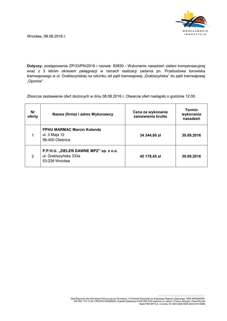 Wrocław, 08.08.2016 r. Dotyczy: postępowania ZP/33/PN/2016 i nazwie: 83830 - Wykonanie nasadzeń zieleni kompensacyjnej wraz z 3 letnim okresem pielęgnacji w ramach realizacji zadania pn. Przebudowa torowiska tramwajowego w ul. Grabiszyńskiej na odcinku od pętli tramwajowej „Grabiszyńska” do pętli tramwajowej „Oporów” Zbiorcze zestawienie ofert złożonych w dniu 08.08.2016 r. Otwarcie ofert nastąpiło o godzinie 12:00. Cena za wykonanie zamówienia brutto Termin wykonania nasadzeń 1 PPHU MARMAC Marcin Kolenda ul. 3 Maja 12 56-400 Oleśnica 34 344,00 zł 30.09.2016 2 P.P.H.U. „ZIELEŃ DAWNE MPZ” sp. z o.o. ul. Grabiszyńska 333a 53-236 Wrocław 45 178,45 zł 30.09.2016 Nr oferty Nazwa (firma) i adres Wykonawcy Sąd Rejonowy dla Wrocławia-Fabrycznej we Wrocławiu, VI Wydział Gospodarczy Krajowego Rejestru Sądowego, KRS 0000285920, NIP 897-173-13-83 | REGON 020568529 | Kapitał Zakładowy 8.500.000 PLN wpłacony w całości | Prezes Zarządu: Paweł Rychel Bank PKO BP S.A. nr konta 18 1020 5226 0000 6202 0416 9686