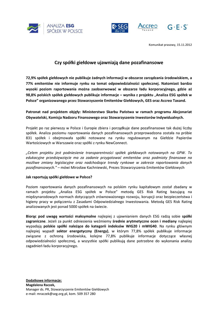 Komunikat prasowy, 15.11.2012 Czy spółki giełdowe ujawniają dane pozafinansowe 72,9% spółek giełdowych nie publikuje żadnych informacji w obszarze zarządzania środowiskiem, a 77% emitentów nie informuje rynku na temat odpowiedzialności społecznej. Natomiast bardzo wysoki poziom raportowania można zaobserwować w obszarze ładu korporacyjnego, gdzie aż 98,8% polskich spółek giełdowych publikuje informacje – wynika z projektu „Analiza ESG spółek w Polsce” organizowanego przez Stowarzyszenie Emitentów Giełdowych, GES oraz Accreo Taxand. Patronat nad projektem objęły: Ministerstwo Skarbu Państwa w ramach programu Akcjonariat Obywatelski, Komisja Nadzoru Finansowego oraz Stowarzyszenie Inwestorów Indywidualnych. Projekt po raz pierwszy w Polsce i Europie zbiera i porządkuje dane pozafinansowe tak dużej liczby spółek. Analiza poziomu raportowania danych pozafinansowych przeprowadzona została na próbie 831 spółek i obejmowała spółki notowane na rynku regulowanym na Giełdzie Papierów Wartościowych w Warszawie oraz spółki z rynku NewConnect. „Celem projektu jest podniesienie transparentności spółek giełdowych notowanych na GPW. To edukacyjne przedsięwzięcie ma za zadanie przygotować emitentów oraz podmioty finansowe na możliwe zmiany legislacyjne oraz nadchodzące trendy rynkowe w zakresie raportowania danych pozafinansowych.” – mówi Mirosław Kachniewski, Prezes Stowarzyszenia Emitentów Giełdowych Jak raportują spółki giełdowe w Polsce? Poziom raportowania danych pozafinansowych na polskim rynku kapitałowym został zbadany w ramach projektu „Analiza ESG spółek w Polsce” metodą GES Risk Rating bazującą na międzynarodowych normach dotyczących zrównoważonego rozwoju, korupcji oraz bezpieczeństwa i higieny pracy w połączeniu z Zasadami Odpowiedzialnego Inwestowania. Metodą GES Risk Rating analizowanych jest ponad 5000 spółek na świecie. Biorąc pod uwagę wartości maksymalne najlepiej z ujawnianiem danych ESG radzą sobie spółki zagraniczne. Jeżeli za punkt odniesienia weźmiemy średnie arytmetyczne ocen i mediany najlepiej wypadają polskie spółki należące do kategorii indeksów WIG20 i mWIG40. Na rynku głównym najlepiej wypadł sektor energetyczny (Energy), w którym 77,8% spółek publikuje informacje związane z ochroną środowiska, kolejne 77,8% publikuje informacje dotyczące własnej odpowiedzialności społecznej, a wszystkie spółki publikują dane potrzebne do wykonania analizy zagadnień ładu korporacyjnego. Dodatkowe informacje: Magdalena Raczek, Manager ds. PR, Stowarzyszenie Emitentów Giełdowych e-mail: [email protected], kom. 509 357 280 Spośród zbadanych 831 spółek aż 606 nie publikuje żadnej informacji w obszarze zarządzania środowiskiem, co może przyczynić się do obniżenia ich wartości w oczach inwestorów. Zdaniem Piotra Kaźmierkiewicza, analityka CDM Pekao S.A., spółki raportujące istotne dane w obszarze środowiskowym, cechowały najlepsze parametry finansowe na przestrzeni ostatnich trzech lat. W badaniu GES Risk Rating najwięcej pozytywnych ocen otrzymały spółki za informacje wykorzystywane przy analizie ładu korporacyjnego. „Najskuteczniejszy indeks Europy ŚrodkowoWschodniej z indeksów „Blue chip” w zakresie ładu korporacyjnego to indeks ze Słowenii, zajmując pozycję przed indeksami „Blue chip” z Niemiec, Polski, Włoch i Islandii. Polski indeks „WIG 20” uplasował się na pozycji 15 z wynikiem 49%.” – mówi Marcin Pitura, Dyrektor Zarządzający GES w Polsce Dodatkowe informacje: Magdalena Raczek, Manager ds. PR, Stowarzyszenie Emitentów Giełdowych e-mail: [email protected], kom. 509 357 280 Dane ESG w relacjach inwestorskich Jednym z elementów projektu „Analiza ESG spółek w Polsce” były spotkania z przedstawicielami spółek, którzy są odpowiedzialni za relacje inwestorskie. Część spółek, które wzięły udział w badaniu, pomimo braku zainteresowania samych inwestorów, raportuje dane pozafinansowe aby edukować analityków, a w ten sposób budować swoją lepszą pozycję rynkową. Jednak aby dane ESG rzeczywiście były dostrzegane jako cenotwórcze przez inwestorów, spółki powinny przede wszystkim zarządzać nimi w sposób strategiczny, wzmacniając działaniami na poziomie operacyjnym oraz dobrą komunikacją wspartą nowymi rozwiązaniami narzędziowymi. Takie podejście może skutkować lepszą pozycją rynkową. Zdaniem Piotra Kaźmierkiewicza, analityka CDM Pekao S.A., w tak zmiennych warunkach rynkowych, spółki ujawniające istotne dane pozafinansowe pozytywnie wyróżniały się zarówno na tle pozostałych spółek z sektora jak i całego rynku. Należy podkreślić, że spółki które prowadziły rozszerzony dialog z interesariuszami były nagradzane przez uczestników rynku kapitałowego większym zaufaniem, które przekładało się na ograniczone wahania kursów akcji tychże podmiotów. Truizmem jest stwierdzenie, że większa przejrzystość spółek pozwala na podejmowanie bardziej racjonalnych decyzji inwestycyjnych. Natomiast wśród rodzimych analityków nie jest tak oczywiste, że uwzględnianie danych ESG przyczynia się do lepszej wyceny spółek i minimalizacji ryzyka inwestycyjnego. Potwierdzają to najnowsze dane Europejskiego Forum ds. Zrównoważonego Inwestowania Eurosif (European Sustainable Investment Forum) wskazujące, że wartość wszystkich funduszy w Europie, stosujących przynajmniej jedną ze strategii odpowiedzialnego inwestowania, wyniosła w 2011 roku prawie 7 bln EUR. – mówi Robert Sroka, Szef Projektów CSR w Accreo Taxand. Co warto podkreślić, spółki o wysokim poziomie raportowania wykazywały nie tylko pożądaną relację potencjalnej stopy zwrotu do ryzyka, ale również wysoką rentowność nawet w latach obejmujących kryzys finansowy. To spostrzeżenie powinno stanowić zachętę do uwzględniania danych ESG w procesie podejmowania decyzji i