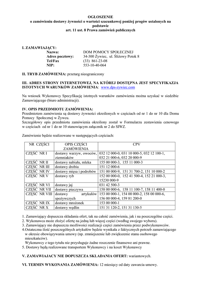 OGŁOSZENIE o zamówieniu dostawy żywności o wartości szacunkowej poniżej progów ustalonych na podstawie art. 11 ust. 8 Prawa zamówień publicznych I. ZAMAWIAJĄCY: Nazwa: Adres pocztowy: Tel/Fax NIP: DOM POMOCY SPOŁECZNEJ 34-300 Żywiec, ul. Śliżowy Potok 8 (33) 861-23-08 553-10-40-064 II. TRYB ZAMÓWIENIA: przetarg nieograniczony III. ADRES STRONY INTERNETOWEJ, NA KTÓREJ DOSTĘPNA JEST SPECYFIKAZJA ISTOTNYCH WARUNKÓW ZAMÓWIENIA: www.dps-zywiec.com Na wniosek Wykonawcy Specyfikację istotnych warunków zamówienia można uzyskać w siedzibie Zamawiającego (biuro administracji). IV. OPIS PRZEDMIOTU ZAMÓWIENIA: Przedmiotem zamówienia są dostawy żywności określonych w częściach od nr 1 do nr 10 dla Domu Pomocy Społecznej w Żywcu. Szczegółowy opis przedmiotu zamówienia określony został w Formularzu zestawienia cenowego w częściach od nr 1 do nr 10 stanowiącym załącznik nr 2 do SIWZ. Zamówienie będzie realizowane w następujących częściach: NR CZĘŚCI CZĘŚĆ NR I OPIS CZĘŚCI ZAMÓWIENIA dostawy warzyw, owoców, ziemniaków dostawy nabiału, mleka dostawy drobiu dostawy mięsa i podrobów dostawy ryb CPV 032 12 000-0, 031 10 000-5, 032 12 100-1, 032 21 000-6, 032 20 000-9 CZĘŚĆ NR II 155 00 000-3, 155 11 000-3 CZĘŚĆ NR III 151 12 000-6 CZĘŚĆ NR IV 151 00 000-9, 151 31 700-2, 151 10 000-2 CZĘŚĆ NR V 152 00 000-0, 152 41 500-4, 152 21 000-3, 15230 000-9 CZĘŚĆ NR VI dostawy jaj 031 42 500-3 CZĘŚĆ NR VII dostawy pieczywa 158 00 000-6, 158 11 100-7, 158 11 400-0 CZĘŚĆ NR VIII dostawy artykułów 153 00 000-1, 154 00 000-2, 158 00 000-6, spożywczych 156 00 000-4, 159 81 200-0 CZĘŚĆ NR IX dostawy mrożonek 153 00 000-1 CZĘŚĆ NR X dostawy wędlin 151 31 120-2, 151 31 130-5 1. Zamawiający dopuszcza składania ofert, tak na całość zamówienia, jak i na poszczególne części. 2. Wykonawca może złożyć ofertę na jedną lub więcej części (według swojego wyboru). 3. Zamawiający nie dopuszcza możliwości realizacji części zamówienia przez podwykonawców. 4.Ostateczna ilość poszczególnych artykułów będzie wynikała z faktycznych potrzeb zamawiającego w okresie obowiązywania umowy (np. zmniejszenie lub zwiększenie stanu osobowego mieszkańców). Wykonawcy z tego tytułu nie przysługuje żadne roszczenie finansowe ani prawne. 5. Dostawy będą realizowane transportem Wykonawcy i na koszt Wykonawcy V. ZAMAWIAJACY NIE DOPUSZCZA SKLADANIA OFERT: wariantowych. VI. TERMIN WYKONANIA ZAMÓWIENIA: 12 miesięcy od daty zawarcia umowy. /2/ VII. OPIS WARUNKÓW UDZIAŁU W POSTĘPOWANIU ORAZ OPIS DOKONYWANIA OCENY SPEŁNIENIA TYCH WARUNKÓW. 1. O udzielenie zamówienia mogą ubiegać się Wykonawcy, którzy spełniają warunki dotyczące: 1) posiadania uprawnień do wykonywania określonej działalności lub czynności, jeżeli przepisy prawa nakładają obowiązek ich posiadania, 2) posiadania wiedzy i doświadczenia, 3) dysponowania odpowiednim potencjałem technicznym oraz osobami zdolnymi do wykonania zamówienia, 4) sytuacji ekonomicznej i finansowej. 2. Ponadto o udzielenie zamówienia mogą ubiegać się Wykonawcy, którzy: 1) nie podlegają wykluczeniu z postępowania o udzielenie zamówienia (art. 24 ust. 1 ustawy), 2) złożą ofertę, której treść odpowiada treści niniejszej Specyfikacji istotnych warunków zamówienia. 3. Wykonawca może polegać na wiedzy i doświadczeniu, potencjale technicznym, osobach zdolnych do wykonania zamówienia lub zdolnościach finansowych innych podmiotów, niezależnych od charakteru prawnego łączących go z nimi stosunków. Wykonawca w takiej sytuacji zobowiązany jest udowodnić zamawiającemu, iż będzie dysponował zasobami niezbędnymi do realizacji zamówienia, w szczególności przedstawiając w tym celu pisemne zobowiązanie tych podmiotów do oddania mu do dyspozycji niezbędnych zasobów na okres korzystania z nich przy wykonywaniu zamówienia. 4. Ocena spełnienia warunków zostanie dokonana na podstawie przedłożonych dokumentów i oświadczeń opisanych w pkt VI SIWZ według formuły spełnia/nie spełnia. VIII. INFORMACJE NA TEMAT WADIUM: Zamawiający nie będzie wymagał wniesienia wadium. IX. KRYTERIA OCENY OFERT I ICH ZNACZENIE: cena brutto – 100 % X. MIEJSCE I TERMIN SKŁADANIA OFERT: Dom Pomocy Społecznej w Żywcu ul. Śliżowy Potok 8 – Biuro nr 1 /sekretariat/ do dnia 15.11.2013 r. do godz. 1000 11. MIEJSCE I TERMIN OTWARCIA OFERT: Jawne otwarcie ofert nastąpi w Domu Pomocy Społeczne w Żywcu przy ul. Śliżowy Potok 8 – „Klub SENIORA” w dniu 15.11.2013 r. o godz. 10 30 12.TERMIN ZWIĄZANIA OFERTĄ: Każdy wykonawca zgodnie z art. 85 ust. 1 pkt. 1 ustawy prawo zamówień publicznych pozostaje związany z ofertą przez okres 30 dni. Bieg terminu rozpoczyna się wraz z upływem terminu składania ofert. XIII. Zamawiający nie przewiduje zawarcia umowy ramowej. XIV. Zamawiający nie przewiduje ustanowienia dynamicznego systemu zakupów. XV. Zamawiający nie przewiduje wyboru najkorzystniejszej oferty z zastosowaniem aukcji elektronicznej. XVI. Zamawiający nie przewiduje możliwości udzielania zamówienia uzupełniającego, o którym mowa w art. 67 ust.1 pkt.7 ustawy Prawo zamówień publicznych. XVII. Ogłoszenie o zamówieniu ukazało się w Biuletynie Zamówień Publicznych w dniu 04.11.2013 r., numer ogłoszenia 447442-2013. Żywiec, dnia 04.11.2013 r. ZATWIERDZIŁ: