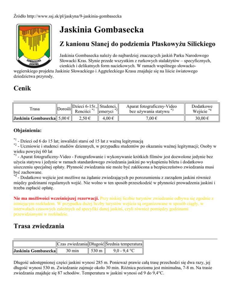 Źródło http://www.ssj.sk/pl/jaskyna/9-jaskinia-gombasecka Jaskinia Gombasecka Z kanionu Slanej do podziemia Płaskowyżu Silickiego Jaskinia Gombasecka należy do najbardziej znaczących jaskiń Parku Narodowego Słowacki Kras. Słynie przede wszystkim z rurkowych stalaktytów – specyficznych, cienkich i delikatnych form naciekowych. W ramach wspólnego słowackowęgierskiego projektu Jaskinie Słowackiego i Aggteleckiego Krasu znajduje się na liście światowego dziedzictwa przyrody. Cenik Dzieci 6-15r., Studenci, Renciści *1 emeryci *2 2,50 € 4,00 € Jaskinia Gombasecka 5,00 € Trasa Dorośli Aparat fotograficzny-Video bez używania statywu *3 7,00 € Dodatkowe Wejście *4 30,00 € Objaśnienia: *1 - Dzieci od 6 do 15 lat; inwalidzi starsi od 15 lat z ważną legitymacją - Uczniowie i studenci studiów dziennych, w przypadku studentów po okazaniu ważnej legitymacji; Osoby w wieku powyżej 60 lat *3 - Aparat fotograficzny-Video - Fotografowanie i wykonywanie krótkich filmów jest dozwolone jedynie bez użycia statywu i jedynie w ramach standardowego zwiedzania jaskini po wykupieniu biletu i dodatkowo uiszczeniu specjalnej opłaty. Płynność zwiedzania nie może być zakłócona a bezpieczeństwo zwiedzania musi być zachowane. *4 - Dodatkowe wejście jest możliwe na żądanie zwiedzających po porozumieniu z zarządem jaskini również między godzinami regularnych wejść. Nie wolno w ten sposób przeszkodzić w płynności prowadzenia jaskini i trzeba zapłacić opłatę. *2 Nie ma możliwości wcześniejszej rezerwacji. Przy niskiej liczbie turystów zwiedzanie odbywa się zgodnie z istniejącym rozkładem. W przypadku dużej liczby turystów wejścia są organizowane w sposób ciągły, w interwałach czasowych zależnych od specyfiki danej jaskini, czyli również pomiędzy godzinami przewidzianymi w rozkładzie. Trasa zwiedzania Czas zwiedzania Długość Średnia temperatura 30 min 530 m 9,0 - 9,4 °C Jaskinia Gombasecka Długość udostępnionej części jaskini wynosi 285 m. Ponieważ prawie całą trasę przechodzi się dwa razy, jej długość wynosi 530 m. Zwiedzanie zajmuje około 30 min. Różnica poziomu jest minimalna, 7-8 m. Na trasie zwiedzania znajduje się 87 schodów. Temperatura w jaskini wynosi od 9 do 9,4°C. Na trasie zwiedzania można zobaczyć szczególnie stalaktyty rurkowe zwane także makaronami. Są to formy zwisających ze stropu cienkich, pustych w środku rurek występujących w takiej wielkiej ilości, że nie znajdziemy ich w żadnej innej jaskini na Słowacji. Oprócz tego w Jaskini Gombaseckiej znajdują się inne formy stalaktytów, stalagmitów różne naciekowe zasłony i polewy. Rozkład wejść i mapa jaskini Podstawowe informacje i kontakt Zarządca: Ján Ambrúž Adres: 049 11 Plešivec Téléphone: +421/ (0)58/ 788 20 20 E-mail: [email protected] Powiat: Pożenie administracyjne: Geomorfologiczna jednostka: Kategoria: Długość: Głębokość: Rožňava Slavec Slovenský kras Sprístupnené SSJ, Národné prírodné pamiatky, Jaskyne svetového dedičstva 1 525 m 15 m Położenie Znajduje się w zachodniej części Płaskowyżu Silickiego w Parku Narodowym Słowacki Kras. Wejście do jaskini leży 11 m nad wywierzyskiem zwanym Čiernou vyvieračkou 250 m n.p.m. Dostęp do jaskini Jaskinia znajduje się 10 km na południe od Rożniawy, na lewym brzegu doliny rzeki Slaná pomiędzy Rożniawą i Plešivcom. Parking znajduje się bezpośrednio przy jaskini. Najbliższy przystanek komunikacji publicznej: Slavec (autobus, pociąg) Dojazd samochodem do jaskini: Z Rożniawy kierunek Tornaľa – 10 km Z Tornale kierunek Rożniawa – 20 km Współrzędne GPS N 48,5628014 E 20,4664993 Warunki przyrodnicze Rozwinięta jest w środkowotriasowych jasnoszarych wapieniach typu Wetterstein ciemnoszarych wapieniach typu Gutenstein, a także jasnoszarych wapieniach i wapieniach dolomitycznych, wzdłuż spękań tektonicznych powstałych na skutek korozyjnej i erozyjnej działalności Czarnego potoku i jego dopływów. Jest częścią Silicko-Gombaseckiego podziemnego systemu hydrologicznego, do którego należy jaskinia Ladnica Silicka (Silická ľadnica). Dzieli je nierozpoznany dotychczas, syfonalny odcinek podziemnego przepływu potoku. Potok ten wypływa na powierzchnię w wywierzysku Čierna vyvieračka usytuowanym 11 m poniżej obecnego wejścia do jaskini. Jaskinia Gombasecka jest wywierzyskową jaskinią o długości 1525 m. Dwa piętra jaskini składają się z owalnych korytarzy modelowanych przez przepływ podziemnego potoku i korytarzy szczelinowych, które są miejscami poszerzone przez procesy zawaliskowe . Wyższe piętro jaskini znajduje się na wysokości od 5 do 10 m ponad aktywnym ciekiem Czarnego Potoku, który płynie korytarzami dolnego piętra. Korytarz Suchá chodba, na górnym piętrze, wytworzyły wody, które obecnie okresowo pojawiają się w 10 metrowej studni w Sali Marmurowej (Mramorová sieň.). Jaskinia słynie przede wszystkim z unikalnych stalaktytów rurkowych zwanych także makaronami. Są to formy zwisających ze stropu cienkich, pustych w środku rurek; długość niektórych z nich sięga 3 m. W jaskini znajdują się także inne formy stalaktytów, a ponadto stalagmity, naciekowe zasłony i polewy. Temperatura w jaskyni wynosi od 9,0 do 9,4 °C a wilgotność względna od 95 do 97 %. Szczególnie godny uwagi jest znaleziony tam okaz wieloszczetu z rodzaju Typhloiulus sp., o długości ciała 26 mm. Jest to, jak dotychczas, największy troglobiont (czyli przedstawiciel gatunku zamieszkującego wyłącznie jaskinie). Nietoperze występują w jaskini jedynie sporadycznie, najczęściej na wiosnę. W ostatnich latach we wstępnym korytarzu w sezonie od jesieni do wiosny występują salamandry (Salamandra salamandra). Historia Jaskinię odkryli w 1951 roku grotołazi z Rożniawy (V. Rozložník, L. Herényi, Š. Roda, A. Abonyi, A. Rusňák, Š. Ivanec i inni), zrzeszeni w Słowackim Towarzystwie Spele