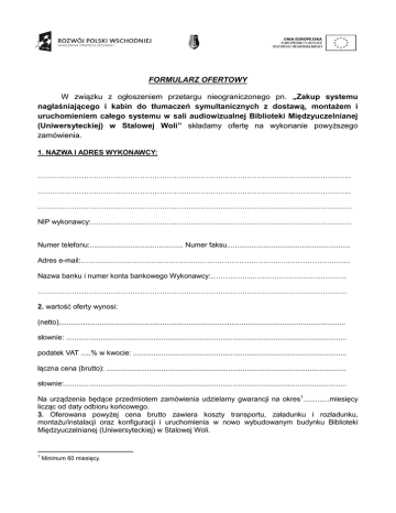 FORMULARZ OFERTOWY W związku z ogłoszeniem przetargu nieograniczonego pn. „Zakup systemu nagłaśniającego i kabin do tłumaczeń symultanicznych z dostawą, montażem i uruchomieniem całego systemu w sali audiowizualnej Biblioteki Międzyuczelnianej (Uniwersyteckiej) w Stalowej Woli” składamy ofertę na wykonanie powyższego zamówienia. 1. NAZWA I ADRES WYKONAWCY: ………………………………………………………………………………………………………………... ………………………………………………………………………………………………………………... ………………………………………………………………………………………………………………… NIP wykonawcy:………………………………………………………………………………………….…. Numer telefonu:.............................................. Numer faksu............................................................. Adres e-mail:…………………………………………………………………………………………….….. Nazwa banku i numer konta bankowego Wykonawcy:……………………………………………….. ………………………………………………………………………………………………………………. 2. wartość oferty wynosi: (netto)............................................................................................................................................. słownie: .......................................................................................................................................... podatek VAT .....% w kwocie: ......................................................................................................... łączna cena (brutto): ...................................................................................................................... słownie:........................................................................................................................................... Na urządzenia będące przedmiotem zamówienia udzielamy gwarancji na okres1.............miesięcy licząc od daty odbioru końcowego. 3. Oferowana powyżej cena brutto zawiera koszty transportu, załadunku i rozładunku, montażu/instalacji oraz konfiguracji i uruchomienia w nowo wybudowanym budynku Biblioteki Międzyuczelnianej (Uniwersyteckiej) w Stalowej Woli. 1 Minimum 60 miesięcy. 4. Parametry techniczne : Wielkość parametru (nie gorszy niż lub równoważny) Parametry techniczne Modułu Nadajnika (1szt.) Spełnia/nie spełnia2 1. Cyfrowa transmisja sygnałów 2. Dystrybucja minimum ośmiu kanałów audio 3. Minimum 2 wejścia optyczne do komunikacji z urządzeniami audio 4. Panel czołowy wyposażony w promiennik podczerwieni 5. Panel wyświetlający MENU 6. Gniazdo słuchawkowe 7. Pokrętło do poruszania się po menu 8. Waga maksymalna 7 kg 9. Pobór mocy maksymalnie 55W 10. Możliwość obsługi do 30 promienników Parametry techniczne modułu wejścia audio (1 szt.) Spełnia/nie spełnia 1. Możliwość połączenia nadajnika z pulpitem tłumacza 2. Impedancja wejścia prądu stałego ≥200 kΩ 3. Impedancja wejścia asymetrycznego ≥10kΩ 4. Waga min. 132g Parametry techniczne Odbiornika (130 szt.) 1. Minimum 8 kanałów pracy w standardzie stereo 2. Przełącznik wyboru kanału pracy 3. Wyświetlacz 4. Suwak do ustawiania siły głośności 5. Guzik do włączenia zasilania 6. Wbudowany miernik siły odbieranego sygnału 2 Należy wskazać czy dane urządzenie spełnia określone parametry. Spełnia/nie spełnia 7. Zasilanie bateryjne oraz z akumulatorków 8. Waga max. 125 g z akumulatorem 9. Wskaźnik naładowania 10. Styki umożliwiające współpracę z ładowarką walizkową lub ścienną 11. Stosunek sygnał – szum minimum 80dB 12. Maksymalny pobór prądu 15mA Parametry techniczne akumulatorów do odbiorników (130 szt.) Spełnia/nie spełnia 1. Akumulatory NiMH 2. Napięcie 2,4V 3. Pojemność 1100mAh 4. Waga 50g Parametry techniczne ładowarki walizkowej (3 szt.) Spełnia/nie spełnia 1. Wskaźnik poziomu naładowania w odbiornikach 2. Masa bez odbiorników max. 15,5kg 3. Pobór mocy w trybie gotowości – 17W (bez odbiorników) 4. Pobór mocy podczas ładowania – max 270W 5. W zestawie kabel zasilający Parametry techniczne słuchawek stereofonicznych (130 szt.) 1. Nagłowne słuchawki stereofoniczne współpracujące z odbiornikami podczerwieni: 2. Kabel o długości minimum 1,3 m z wtykiem 3,5mm 3. Oporność maksymalna 32Ω 4. Pasmo przenoszenia minimum 50Hz – 20kHz 5. Moc wyjściowa 50mW 6. Skuteczność 98dB na wkładkę 7. Waga maksymalna 70g Spełnia/nie spełnia Parametry techniczne pulpitu tłumacza (8 szt.) 1. Waga maksymalna 1,8 kg 2. Obsługa minimum 6 kanałów językowych oraz kanału FLOOR 3. Możliwość łączenia pulpitów do 12 szt. 4. Możliwość podłączenia mikrofonu ze słuchawek tłumacza 5. Przełącznik wstępnego wyboru kanału wejściowego 6. Mikrofon na wsporniku elastycznym 7. Mikrofon wyposażony we wskaźnik LED, który świeci się na czerwono, jeśli mikrofon jest włączony 8. Regulator głośności sygnału w słuchawkach oraz regulatory barwy dźwięku ( niskie oraz wysokie) 9. Przycisk wyboru kanału A i B 10. Sześć wyjściowych przycisków wyboru dla kanału B ze wskaźnikami wyboru 11. Wskaźnik kanału wyjścia 12. Wskaźnik zajętości kanałów 13. Przycisk wyciszenia kanałów 14. Przycisk mikrofonowy ze wskaźnikiem LED – przełączanie pomiędzy językiem oryginalnym, a kanałem wybranym za pośrednictwem przełącznika wyboru kanału 15. Wskaźnik kanału wejściowego 16. Przełącznik wyboru kanałów języka wejściowego, dla odsłuchu na słuchawkach 17. Przycisk wywoływania głosowego 18. Przycisk komunikatów wychodzących 19. Wskaźnik odebranej wiadomości 20. Przełącznik obrotowy umożliwiający wy