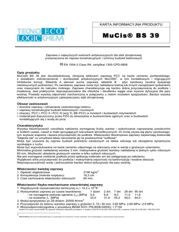 KARTA INFORMACYJNA PRODUKTU MuCis® BS 39 Zaprawa o najwy!szych walorach antykorozyjnych dla stali zbrojeniowej przeznaczona do napraw konstrukcyjnych i ochrony budowli betonowych EN 1504-3 Class R4, certyfikat 1305-CPD-0808 Opis produktu MuCis® BS 39 jest dwusk"adnikow#, zbrojon# w"óknami zapraw# PCC na bazie cementu portlandzkiego, 1 z dodatkiem mikrokrzemionki i domieszkek antykorozyjnych MuCIS® , w tym kontaktowych i migruj#cych inhibitorów korozji. Sk"adnik A stanowi sucha zaprawa, sk"adnik B - p"yn zarobowy (wodna dyspersja nietoksycznych polimerów). Po zarobieniu zaprawa mo!e by$ nak"adana kielni# lub innymi narz%dziami tynkarskimi oraz maszynami do natrysku mokrego. Zaprawa charakteryzuje si% bardzo dobr# przyczepno&ci# do pod"o!a i trwa"o&ci#. Jest praktycznie nieprzepuszczalna dla chlorków i dwutlenku w%gla oraz wysoce dyfuzyjna dla pary wodnej. Posiada wysok# odporno&$ mechaniczn# w po"#czeniu z niskim modu"em spr%!ysto&ci. Bardzo wysoka efektywno&$ w antykorozyjnym zabezpieczaniu stali zbrojeniowej. Obszar zastosowa! ' dowolne naprawy i odnawianie uszkodzonego betonu ' naprawy konstrukcyjne budowli betonowych i murowych ' obszary: PCC I, PCC II i PCC III (w/g TL BE-PCC) w mostach i budowlach in!ynierskich ' materia" jest dopuszczony przez PZH do stosowania w budownictwie ogólnym oraz w budowlach kontaktuj#cych si% z wod# do picia Charakterystyka Wysoka tiksotropowo&$ umo!liwia na"o!enie wymaganej liczby warstw i wyko(czenie naprawianej powierzchni w krótkim czasie, nawet w ma"o sprzyjaj#cych warunkach atmosferycznych. Im mniej u!ywa si% p"ynu zarobowego, tym szybsze wi#zanie i lepsza przyczepno&$ do pod"o!a. W"a&ciwo&ci tiksotropowe zaprawy zapewniaj# doskona"e "klejenie si%" co umo!liwia "atwe nanoszenie jej na powierzchnie "sufitowe". Mo!e by$ u!ywana do napraw budowli po&rednio nara!onych na lekkie wibracje lub obci#!enia dynamiczne wynikaj#ce z ruchu. Mo!e by$ wyprodukowana na bazie cementu odpornego na siarczany oraz w wersji o grubszym uziarnieniu. Minimalna grubo&$ nak"adanej warstwy 3 mm, maksymalna grubo&$ warstwy nak"adanej w jednym cyklu roboczym 60 mm. Mo!liwo&$ uk"adania grubszych warstw w kilku cyklach roboczych. Nie jest wymagane zwil!anie pod"o!a przed aplikacj# materia"u ani te! piel%gnacja po na"o!eniu. Wyj#tkowo silna przyczepno&$ do pod"o!a i maksymalna odporno&$ na karbonizacj% i kwa&ne deszcze. Nieprzepuszczalno&$ wody i jednocze&nie bardzo dobra dyfuzyjno&$ dla pary wodnej. W"a#ciwo#ci #wie$ej zaprawy 1. G%sto&$ obj%to&ciowa: 2. Konsystencja (metoda rozp"ywu): 3. Czas zachowania w"a&ciwo&ci roboczych: 2190 kg/m 16,2 cm 60 min. 3 W"a#ciwo#ci fizyko-mechaniczne stwardnia"ej zaprawy -6 -1 1. Wspó"czynnik rozszerzalno&ci termicznej !t = 14,2 x 10 K 2. Wytrzyma"o&$ zaprawy po czasie twardnienia: 1 dzie( 2 dni 7 dni 28 dni 90 dni - na rozci#ganie podczas zginania ƒct,fl [MPa] 5,9 6,9 9,0 11,0 11,9 - na &ciskanie ƒc [MPa] 23,0 31,9 45,2 55,0 64,0 2 3. Modu" spr%!ysto&ci po 28 dniach: 20000 N/mm 4. Przyczepno&$ do betonu warstwy zaprawy o grubo&ci 5, 15 i 30 mm: 2,60 MPa, 2,60 MPa i 2,9 MPa. 5. Mrozoodporno&$(zgodnie z procedur# IBDiM SO3 i PN-85/B-04500): > F150 (ubytek (%) masy/ wytrzyma"o&ci na zginanie/ &ciskanie/ odrywanie po badaniu: w wodzie: 0,02(<5)/ 0,15(<20)/ 4,67(<20)/ 0,00, w solance: 0,00(<5)/ 0,00(<20)/ 1,56(<20)/ 0,00) 1 MuCis® Multiple Corrosion Inhibiting Synergies to uzupe"niaj#ce si% mechanizmy i funkcje materia"ów, które wspó"dzia"aj#c ze sob# hamuj# korozj% zbrojenia. karta informacyjna MuCis BS 39 strona 2 W"a#ciwo#ci ochronne i dyfuzyjne warstwy zaprawy 1. Przepuszczalno&$ jonów Cl- (AASHTO T 277-831): 1051 [Coulomb] 2. Czas bez korozji zbrojenia w te&cie przyspieszonym ASTM G109 (rozwój korozji zbrojenia w belce !elbetowej pokrytej zapraw# MuCis BS 39 i nawil!anej 3 % roztworem NaCl): > 54 [tydzie(]. 3. Wspó"czynnik oporu dyfuzji pary wodnej µH2O = 46,0, Sd [m] = 0,46 m dla warstwy o grubo&ci 10 mm 4. Wspó"czynnik oporu dyfuzji dwutlenku w%gla µCO2 = 14 584, Sd [m] = 146 m dla warstwy 10 mm 5. Post%p karbonatyzacji po 8, 18 i 25 latach w te&cie przyspieszonym TFB: 0,10; 0,10; 0,20 [mm] 6. Post%p karbonatyzacji w te&cie przyspieszonym ITB (wspó"czynnik dyfuzji materia"u MuCis BS 39 dla CO2 w stosunku do wspó"czynnika dyfuzji zaprawy wzorcowej, PN-EN 13295:2005): 7 [%] W"a#ciwo#ci ochronne zaprawy w kontakcie ze stal% 1. Stan stali w kontakcie z zapraw#: pasywny (PN-86/B-01810). 2. Stan stali w kontakcie z zapraw# w obecno&ci 1 % chlorków w stosunku do masy cementu: pasywny(j.w.). 3. Stan stali w kontakcie z zapraw# w obecno&ci 2 % chlorków w stosunku do masy cementu: pasywny(j.w.). 4. Powierzchnia skorodowana zbrojenia otulonego zapraw# MuCis BS 39 ska!on# chlorkami w ilo&ci 0,5 % w stosunku do masy sk"adnika sypkiego, w stosunku do powierzchni skorodowanej zbrojenia otulonego zapraw# wzorcow# ska!on# chlorkami w ilo&ci 0,5 % w stosunku do masy sk"adnika sypkiego (test przyspieszony JIS A 6205): 15 [%] Sposób u$ycia Przygotowanie pod"o!a Wszelkie lu)no zwi#zane cz%&ci, otulina skorodowanych pr%tów, zanieczyszczenia i warstwy ograniczaj#ce przyczepno&$ musz# zosta$ usuni%te tak, aby pod"o!e by"o zdrowe i szorstkie, z ods"oni%tymi ziarnami kruszywa. Tak przygotowane pod"o!e powinno charakteryzowa$ si% &redni# wytrzyma"o&ci# na odrywanie powy!ej 1,5 MPa (warto&$ minimalna 1,0 MPa). Zalecane i najlepsze jest przygotowanie powierzchni wod# pod wysokim ci&nieniem (powy!ej 1000 bar). Pod"o!e mo!e by$ suche lub wilgotne z wyj#tkiem powierzchni poziomych naprawianych od góry, które powinny zosta$ nawil!one do nasycenia porów. Przy pod"o!ach zawieraj#cych jony chlorków, nak"adanie zaprawy na suche pod"o!e ogranicza ich migracj% i ska!enie &wie!ej zaprawy. Je!eli stal zbrojeniowa jest odkryta i skorodowana, oczy&ci$ j# przez suche piaskowanie i zabezpieczy$ materia"em MuCis® Steel Protection. Warstwa sczepna Tylko w przypadku pod"o!y niespójnych, przed na"o!eniem warstwy zaprawy wetrze$ w pod"o!e sztywnym p%dzlem te