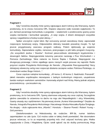 1 września 1939 e-Kartka 1939 Fragment 1: Gdy 1 września obudziły mnie syreny ogłaszające alarm lotniczy dla Warszawy, byłem przekonany, że to znowu ćwiczenia OPL. Dopiero włączone radio rozwiało wątpliwości. To już. Zamiast porannego komunikatu o pogodzie – wiadomość o przekroczeniu granicy przez wojska niemieckie i komunikat specjalny. „A więc wojna. Z dniem dzisiejszym wszystkie sprawy i zagadnienia schodzą na plan dalszy...” Spiker uroczyście czytał tekst. Był wzruszony ponad zawodową miarę: zapowiadał rozpoczęcie światowej wojny. Odpowiednio dobrany kawałek poważnej muzyki. To był jeszcze przygotowany zawczasu program radiowy. Potem dyktowały go wojenne komunikaty. Zapowiadane szybko, nerwowo, przerywające w pół taktu program muzyczny. „Do wszystkich Jasiów i Stasiów”. Kontrast pieszczotliwie zdrobniałych kryptonimów i złowrogich faktów. Nieprzyjacielskie kolumny pancerne nacierają z Prus Wschodnich i z Pomorza Zachodniego. Silne natarcie na froncie Śląska i Podhala. Nieprzyjaciel ma druzgocącą przewagę i mimo zajadłego oporu naszych wojsk posuwa się naprzód. Radio przynosi orędzie Prezydenta Mościckiego do Narodu: „Obywatele Rzeczypospolitej! Nocy dzisiejszej odwieczny wróg nasz rozpoczął działania zaczepne wobec Państwa Polskiego, co stwierdzam wobec Boga i historii...”. Coraz częstsze natrętne komunikaty: „43 koma 2, 43 koma 2. Nadchodzi. Przeszedł”. Jakieś nierealne współrzędne niezwiązane z żadnym konkretnym miejscem, uzupełnione bardzo realnym warkotem samolotów i kanonadą artylerii nad Wolą. Mamy jednak artylerię przeciwlotniczą – pocieszałem się. Fragment 2: Gdy 1 września obudziły mnie syreny ogłaszające alarm lotniczy dla Warszawy, byłem przekonany, że to ćwiczenia OPL. Syreny alarmowe odzywały się coraz częściej. Szczególnie głośno zawodziła ta ustawiona na dachu na rogu alei Niepodległości i ulicy Wawelskiej. Gazety ukazały się z opóźnieniem. Na pierwszej stronie „Kuriera Warszawskiego” Orędzie do Narodu, fotografia Prezydenta Mościckiego i Naczelnego Wodza Marszałka Rydza-Śmigłego. Na drugiej – duże ogłoszenie kina „Atlantic”: Honolulu – Eleanor Powell i Robert Young – Dziś premiera. Zatelefonowałem na Mokotowską do rodziców. 819-36, numer telefonu zapamiętałem na całe życie. Coś można sobie w takiej chwili powiedzieć. Nie doceniałem jeszcze wówczas, co to za wspaniały przywilej móc choć usłyszeć kochany głos. Matka wypytywała o Zosię i Magdalenę. Ojciec szedł zgłosić się do służby pomocniczej. Moja siostra, Maria Lenczewska, lekarz odbywająca praktykę w Szpitalu Ujazdowskim u pułkownika docenta Rosnowskiego, od kilku dni dyżurowała już dzień i noc. Brat, Andrzej, inżynier rolnik, był z żoną i dziećmi w Puczniewie, majątku pod Łodzią. Zrobiliśmy z moją teściową krótką domową naradę. Zdecydowaliśmy, że Zosia z Magdalenką powinny zostać chwilowo na wsi nad Bugiem. Jak się front ustali, to będzie czas je ewentualnie przed zimą ściągnąć do Warszawy. Źródło: Stanisław Jankowski „Agaton”, Z fałszywym ausweisem w prawdziwej Warszawie: wspomnienia 1939-1946, T. 1, Państwowy Instytut Wydawniczy, Warszawa 1996.
