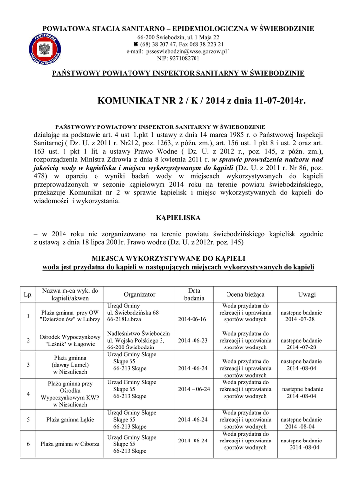 POWIATOWA STACJA SANITARNO – EPIDEMIOLOGICZNA W ŚWIEBODZINIE 66-200 Świebodzin, ul. 1 Maja 22 (68) 38 207 47, Fax 068 38 223 21 e-mail: [email protected] ` NIP: 9271082701 PAŃSTWOWY POWIATOWY INSPEKTOR SANITARNY W ŚWIEBODZINIE KOMUNIKAT NR 2 / K / 2014 z dnia 11-07-2014r. PAŃSTWOWY POWIATOWY INSPEKTOR SANITARNY W ŚWIEBODZINIE działając na podstawie art. 4 ust. 1,pkt 1 ustawy z dnia 14 marca 1985 r. o Państwowej Inspekcji Sanitarnej ( Dz. U. z 2011 r. Nr212, poz. 1263, z późn. zm.), art. 156 ust. 1 pkt 8 i ust. 2 oraz art. 163 ust. 1 pkt 1 lit. a ustawy Prawo Wodne ( Dz. U. z 2012 r., poz. 145, z późn. zm.), rozporządzenia Ministra Zdrowia z dnia 8 kwietnia 2011 r. w sprawie prowadzenia nadzoru nad jakością wody w kąpielisku i miejscu wykorzystywanym do kąpieli (Dz. U. z 2011 r. Nr 86, poz. 478) w oparciu o wyniki badań wody w miejscach wykorzystywanych do kąpieli przeprowadzonych w sezonie kąpielowym 2014 roku na terenie powiatu świebodzińskiego, przekazuje Komunikat nr 2 w sprawie kąpielisk i miejsc wykorzystywanych do kąpieli do wiadomości i wykorzystania. KĄPIELISKA – w 2014 roku nie zorganizowano na terenie powiatu świebodzińskiego kąpielisk zgodnie z ustawą z dnia 18 lipca 2001r. Prawo wodne (Dz. U. z 2012r. poz. 145) MIEJSCA WYKORZYSTYWANE DO KĄPIELI woda jest przydatna do kąpieli w następujących miejscach wykorzystywanych do kąpieli Lp. Nazwa m-ca wyk. do kąpieli/akwen 1 Plaża gminna przy OW "Dzierżoniów" w Lubrzy 2 Ośrodek Wypoczynkowy "Leśnik" w Łagowie 3 Plaża gminna (dawny Lumel) w Niesulicach 4 Plaża gminna przy Ośrodku Wypoczynkowym KWP w Niesulicach 5 6 Organizator Urząd Gminy ul. Świebodzińska 68 66-218Lubrza Nadleśnictwo Świebodzin ul. Wojska Polskiego 3, 66-200 Świebodzin Urząd Gminy Skąpe Skąpe 65 66-213 Skąpe Data badania 2014-06-16 2014 -06-23 2014 -06-24 Urząd Gminy Skąpe Skąpe 65 66-213 Skąpe 2014 – 06-24 Plaża gminna Łąkie Urząd Gminy Skąpe Skąpe 65 66-213 Skąpe 2014 -06-24 Plaża gminna w Ciborzu Urząd Gminy Skąpe Skąpe 65 66-213 Skąpe 2014 -06-24 Ocena bieżąca Uwagi Woda przydatna do rekreacji i uprawiania sportów wodnych następne badanie 2014 -07-28 Woda przydatna do rekreacji i uprawiania sportów wodnych następne badanie 2014 -07-28 Woda przydatna do rekreacji i uprawiania sportów wodnych Woda przydatna do rekreacji i uprawiania sportów wodnych Woda przydatna do rekreacji i uprawiania sportów wodnych Woda przydatna do rekreacji i uprawiania sportów wodnych następne badanie 2014 -08-04 następne badanie 2014 -08-04 następne badanie 2014 -08-04 następne badanie 2014 -08-04 7 Ośrodek Wypoczynkowy "Nowy Dworek" w Nowym Dworku 8 Baza obozowa "ZHP Świdnica" w Niesulicach 9 Plaża gminna przy polu namiotowym "Goszcza" w Lubrzy Nowy Dworek OśrodekWypoczynkowy s.c.Tomasz Bińczycki, Dorota Bińczycka ul. Świerkowa 7, 66-200 Świebodzin Komenda Hufca "ZHP w Świdnicy" ul. Lelewela 18, 58-100 Świdnica 2014 -06-23 2014-06-25 Woda przydatna do rekreacji i uprawiania sportów wodnych następne badanie 2014 -07-28 Woda przydatna do rekreacji i uprawiania sportów wodnych następne badanie 2014 -07-28 Urząd Gminy ul. Świebodzińska 68 66-218 Lubrza 2014 -06-16 Woda przydatna do rekreacji i uprawiania sportów wodnych następne badanie 2014 -07-28 10 Plaża gminna w Nowej Wiosce Urząd Gminy ul. Świebodzińska 68 66-218 Lubrza 2014 -06-16 Woda przydatna do rekreacji i uprawiania sportów wodnych następne badanie 2014 -07-28 11 Plaża gminna w Przełazach Urząd Gminy ul. Świebodzińska 68 66-218 Lubrza 2014-06-23 Woda przydatna do rekreacji i uprawiania sportów wodnych następne badanie 2014 -07-28 12 Park Rekreacyjny "Mundi - Recra" w Łagowie 2014-06-23 Woda przydatna do rekreacji i uprawiania sportów wodnych następne badanie 2014 -07-28 13 Plaża Gminna w Tyczynie 2014 -06-23 Woda przydatna do rekreacji i uprawiania sportów wodnych następne badanie 2014 -07-28 2014 -06-24 Woda przydatna do rekreacji i uprawiania sportów wodnych następne badanie 2014 -08-04 Chorągiew Dolonośląska ZHP Hufiec Wrocław ul. Nowa 6, 50-082 Wrocław 2014 -06-16 Woda przydatna do rekreacji i uprawiania sportów wodnych "Olimp" Sp.z o.o. ul. Wojska Polskiego 2 66-200 Świebodzin 2014 -06-25 Woda przydatna do rekreacji i uprawiania sportów wodnych 14 Plaża gminna przy OW "ADA" w Niesulicach 15 Baza obozowa "ZHP Wrocław " w Tyczynie 16 Ośrodek wczasowy KORMORAN w Niesulicach Park Rekreacyjny "Mundi - Recra" ul.1-go Lutego 2A , 66-220 Łagów Urząd Gminy ul. Świebodzińska 68 66-218 Lubrza Urząd Gminy Skąpe 66-213 Skąpe 65 następne badanie 2014 -07-28 następne badanie 2014 -08-04 Jednocześnie Państwowy Powiatowy Inspektor Sanitarny w Świebodzinie zastrzega sobie prawo zmiany powyższych ustaleń w przypadku pogorszenia jakości wody w miejscach wykorzystywanych do kąpieli. Państwowy Powiatowy Inspektor Sanitarny w Świebodzinie informuje, że niewskazana jest kąpiel w przypadku masowego zakwitu sinic w zbiornikach wodnych, ze względu na możliwość wystąpienia ujemnych skutków zdrowotnych. Zbiorcza informacja na temat jakości wody w kąpieliskach i miejscach wykorzystywanych do kąpieli z terenu województwa lubuskiego znajduje się na stronach internetowych Wojewódzkiej Stacji Sanitarno– Epidemiologicznej w Gorzowie Wlkp.: www.wsse.gorzow.pl i wssegorzow.pis.gov.pl, a z terenu całej Polski na stronie internetowej Głównego Inspektoratu Sanitarnego: www.pis.gov.pl. PPIS w Świebodzinie informuje, że organy Państwowej Inspekcji Sanitarnej nie prowadzą od 2011roku bieżącego nadzoru nad jakością wody miejsc wykorzystywanych do kąpieli oraz kąpielisk poprzez badania fizykochemiczne i mikrobiologiczne co 14 dni. Do obowiązków organizatora należy (zgodnie z ustawa z dnia 18 lipca 2001 r. Prawo wodne Dz.U.2005r. Nr 239 poz.2019 z późn.zm.): I. wykonywanie badań jakości wody; a. nie wcześniej niż 14 dni przed dniem rozpoczęcia jego funkcjonowania, b. przynaj