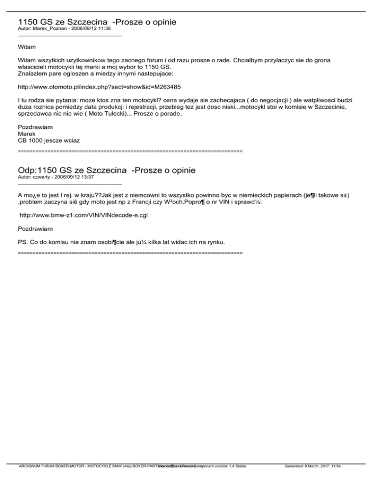 1150 GS ze Szczecina -Prosze o opinie Autor: Marek_Poznan - 2006/09/12 11:36 _____________________________________ Witam Witam wszytkich uzytkownikow tego zacnego forum i od razu prosze o rade. Chcialbym przylaczyc sie do grona wlascicieli motocykli tej marki a moj wybor to 1150 GS. Znalazlem pare ogloszen a miedzy innymi nastepujace: http://www.otomoto.pl/index.php?sect=show&id=M263485 I tu rodza sie pytania: moze ktos zna ten motocykl? cena wydaje sie zachecajaca ( do negocjacji ) ale watpliwosci budzi duza roznica pomiedzy data produkcji i rejestracji, przebieg tez jest dosc niski...motocykl stoi w komisie w Szczecinie, sprzedawca nic nie wie ( Moto Tulecki)... Prosze o porade. Pozdrawiam Marek CB 1000 jescze wciaz ============================================================================ Odp:1150 GS ze Szczecina -Prosze o opinie Autor: czwarty - 2006/09/12 13:37 _____________________________________ A mo¿e to jest I rej. w kraju??Jak jest z niemcowni to wszystko powinno byc w niemieckich papierach (je¶li takowe s±) ,problem zaczyna siê gdy moto jest np z Francji czy W³och.Popro¶ o nr VIN i sprawd¼: http://www.bmw-z1.com/VIN/VINdecode-e.cgi Pozdrawiam PS. Co do komisu nie znam osobi¶cie ale ju¼ kilka lat widac ich na rynku. ============================================================================ ARCHIWUM FoRUM BOXER-MOTOR - MOTOCYKLE BMW sklep BOXER-PARTS.eu MamboBoard czê¶ci i akcesoria Forum Component version: 1.4 Stable Generated: 8 March, 2017, 11:54