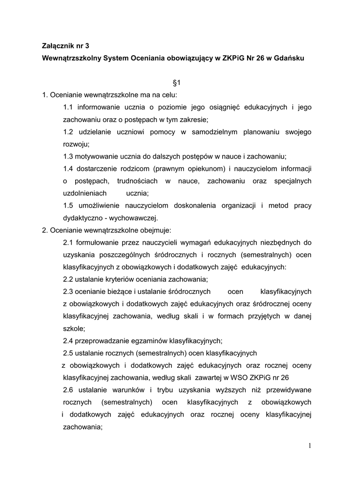 Załącznik nr 3 Wewnątrzszkolny System Oceniania obowiązujący w ZKPiG Nr 26 w Gdańsku §1 1. Ocenianie wewnątrzszkolne ma na celu: 1.1 informowanie ucznia o poziomie jego osiągnięć edukacyjnych i jego zachowaniu oraz o postępach w tym zakresie; 1.2 udzielanie uczniowi pomocy w samodzielnym planowaniu swojego rozwoju; 1.3 motywowanie ucznia do dalszych postępów w nauce i zachowaniu; 1.4 dostarczenie rodzicom (prawnym opiekunom) i nauczycielom informacji o postępach, uzdolnieniach trudnościach w nauce, zachowaniu oraz specjalnych ucznia; 1.5 umożliwienie nauczycielom doskonalenia organizacji i metod pracy dydaktyczno - wychowawczej. 2. Ocenianie wewnątrzszkolne obejmuje: 2.1 formułowanie przez nauczycieli wymagań edukacyjnych niezbędnych do uzyskania poszczególnych śródrocznych i rocznych (semestralnych) ocen klasyfikacyjnych z obowiązkowych i dodatkowych zajęć edukacyjnych: 2.2 ustalanie kryteriów oceniania zachowania; 2.3 ocenianie bieżące i ustalanie śródrocznych ocen klasyfikacyjnych z obowiązkowych i dodatkowych zajęć edukacyjnych oraz śródrocznej oceny klasyfikacyjnej zachowania, według skali i w formach przyjętych w danej szkole; 2.4 przeprowadzanie egzaminów klasyfikacyjnych; 2.5 ustalanie rocznych (semestralnych) ocen klasyfikacyjnych z obowiązkowych i dodatkowych zajęć edukacyjnych oraz rocznej oceny klasyfikacyjnej zachowania, według skali zawartej w WSO ZKPiG nr 26 2.6 ustalanie warunków i trybu uzyskania wyższych niż przewidywane rocznych (semestralnych) ocen klasyfikacyjnych z obowiązkowych i dodatkowych zajęć edukacyjnych oraz rocznej oceny klasyfikacyjnej zachowania; 1 2.7 ustalanie warunków i sposobu przekazywania rodzicom (prawnym opiekunom) informacji o postępach i trudnościach ucznia w nauce 2.8 formułowanie wymagań edukacyjnych i ocenianie dostosowuje się do indywidualnych potrzeb rozwojowych i edukacyjnych oraz możliwości psychofizycznych ucznia. 3. Oceniane będą indywidualne możliwości ucznia w następujących sytuacjach dydaktycznych: 3.1 umiejętności i wiadomości nabyte w procesie nauczania i uczenia się, 3.2 systematyczność pracy ucznia, 3.3 samodzielne twórcze prace ucznia, projekty, prace pisemne, sprawdziany, 3.4 zaangażowanie i kreatywność ucznia, 3.5 umiejętność prezentowania wiedzy, 3.6 umiejętność współpracy w grupie. 4. Nauczyciele na początku każdego roku szkolnego informują uczniów oraz ich rodziców (prawnych opiekunów) o: 4.1 wymaganiach edukacyjnych niezbędnych do uzyskania poszczególnych śródrocznych i rocznych ocen klasyfikacyjnych z obowiązkowych i dodatkowych zajęć edukacyjnych, wynikających z realizowanego przez siebie programu nauczania; 4.2 sposobach sprawdzania osiągnięć edukacyjnych uczniów; 4.3 warunkach i trybie uzyskania wyższej niż przewidywana rocznej oceny klasyfikacyjnej z obowiązkowych i dodatkowych zajęć edukacyjnych. 5. Wychowawca klasy na początku każdego roku szkolnego informuje uczniów oraz ich rodziców (prawnych opiekunów) o warunkach i sposobie oraz kryteriach oceniania zachowania oraz o warunkach i trybie uzyskania wyższej niż przewidywana rocznej oceny klasyfikacyjnej zachowania oraz o skutkach ustalenia uczniowi nagannej rocznej oceny klasyfikacyjnej zachowania. 6. Oceny są jawne dla ucznia i jego rodziców (prawnych opiekunów). 7. Na wniosek ucznia lub jego rodziców (prawnych opiekunów) nauczyciel uzasadnia ustaloną ocenę. 8. Na wniosek ucznia lub jego rodziców (prawnych opiekunów), sprawdzone i ocenione pisemne prace kontrolne oraz inna dokumentacja dotycząca oceniania ucznia jest udostępniana uczniowi lub jego rodzicom (prawnym opiekunom) 2 9. Nauczyciel dostosowuje wymagania edukacyjne i ocenianie do indywidualnych potrzeb rozwojowych i edukacyjnych oraz możliwości psychofizycznych ucznia: 9.1 posiadającego orzeczenie o potrzebie kształcenia specjalnego – na podstawie tego orzeczenia oraz ustaleń zawartych w indywidualnym programie edukacyjno-terapeutycznym, 9.2 posiadającego orzeczenie o potrzebie indywidualnego nauczania – na podstawie tego orzeczenia; 9.3 posiadającego opinię poradni psychologiczno-pedagogicznej, w tym poradni specjalistycznej, o specyficznych trudnościach w uczeniu się lub inną opinię poradni psychologiczno-pedagogicznej, w tym poradni specjalistycznej, wskazującą na potrzebę takiego dostosowania – na podstawie tej opinii; 9.4 nieposiadającego orzeczenia lub opinii wymienionych w pkt 9.1–9.3, który jest objęty pomocą psychologiczno-pedagogiczną w szkole – na podstawie rozpoznania indywidualnych potrzeb rozwojowych i edukacyjnych oraz indywidualnych możliwości psychofizycznych ucznia dokonanego przez nauczycieli i specjalistów, 9.5 posiadającego opinię lekarza o ograniczonych możliwościach wykonywania przez ucznia określonych ćwiczeń fizycznych na zajęciach wychowania fizycznego – na podstawie tej opinii. 10. Przy ustalaniu oceny z wychowania fizycznego, zajęć technicznych, plastyki, muzyki i zajęć artystycznych należy przede wszystkim brać pod uwagę wysiłek wkładany przez ucznia w wywiązywanie się z obowiązków wynikających ze specyfiki tych zajęć, a w przypadku wychowania fizycznego – także systematyczność udziału ucznia w zajęciach oraz aktywność ucznia w działaniach podejmowanych przez szkołę na rzecz kultury fizycznej. 11. Dyrektor szkoły zwalnia ucznia z wykonywania określonych ćwiczeń fizycznych na zajęciach wychowania fizycznego, na podstawie opinii o ograniczonych możliwościach wykonywania przez ucznia tych ćwiczeń wydanej przez lekarza, na czas określony w tej opinii. 12 Dyrektor szkoły zwalnia ucznia z realizacji zajęć wychowania fizycznego, zajęć komputerowych lub informatyki, na podstawie opinii o braku możliwości uczestniczenia ucznia w tych zajęciach wydanej przez lekarza, na czas określony w tej opinii. 3 13. Jeżeli okres zwolnienia ucznia z realizacji zajęć, o którym mowa w pkt.