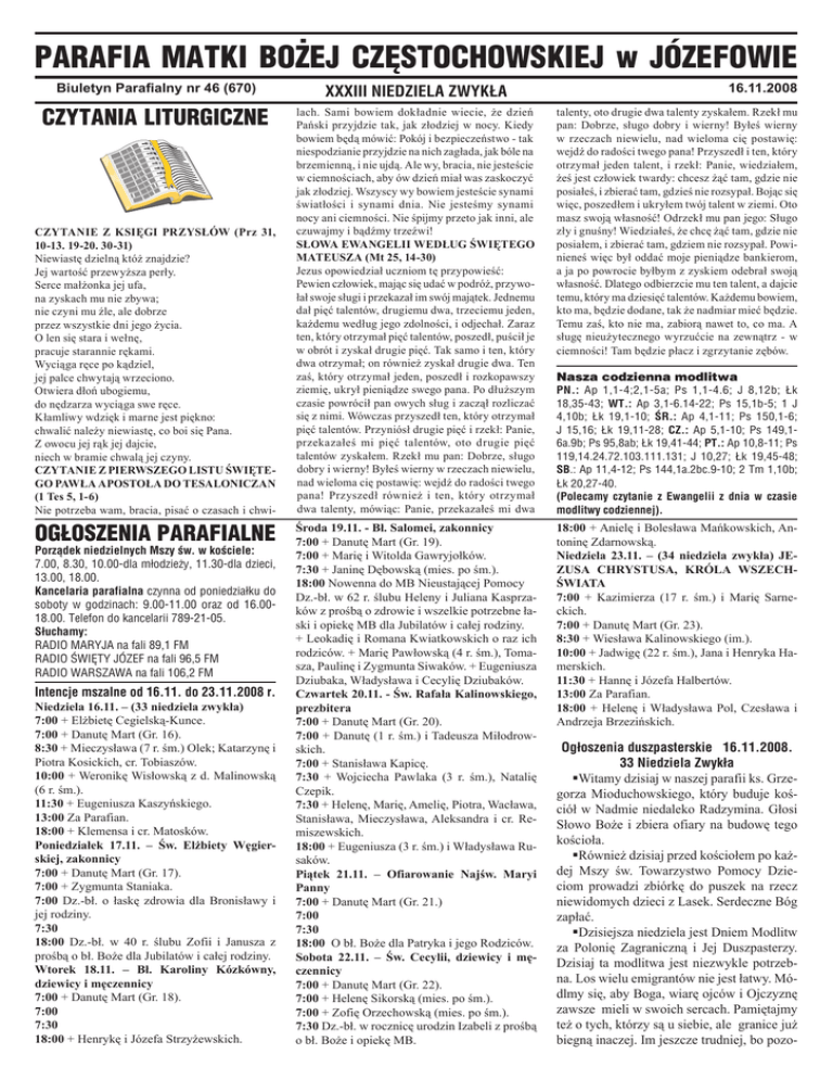 PARAFIA MATKI BOŻEJ CZÊSTOCHOWSKIEJ w JÓZEFOWIE 16.11.2008 Biuletyn Parafialny nr 46 (670) XXXIII NIEDZIELA ZWYKŁA CZYTANIA LITURGICZNE lach. Sami bowiem dokładnie wiecie, że dzień Pański przyjdzie tak, jak złodziej w nocy. Kiedy bowiem będą mówić: Pokój i bezpieczeństwo - tak niespodzianie przyjdzie na nich zagłada, jak bóle na brzemienną, i nie ujdą. Ale wy, bracia, nie jesteście w ciemnościach, aby ów dzień miał was zaskoczyć jak złodziej. Wszyscy wy bowiem jesteście synami światłości i synami dnia. Nie jesteśmy synami nocy ani ciemności. Nie śpijmy przeto jak inni, ale czuwajmy i bądźmy trzeźwi! SŁOWA EWANGELII WEDŁUG ŚWIĘTEGO MATEUSZA (Mt 25, 14-30) Jezus opowiedział uczniom tę przypowieść: Pewien człowiek, mając się udać w podróż, przywołał swoje sługi i przekazał im swój majątek. Jednemu dał pięć talentów, drugiemu dwa, trzeciemu jeden, każdemu według jego zdolności, i odjechał. Zaraz ten, który otrzymał pięć talentów, poszedł, puścił je w obrót i zyskał drugie pięć. Tak samo i ten, który dwa otrzymał; on również zyskał drugie dwa. Ten zaś, który otrzymał jeden, poszedł i rozkopawszy ziemię, ukrył pieniądze swego pana. Po dłuższym czasie powrócił pan owych sług i zaczął rozliczać się z nimi. Wówczas przyszedł ten, który otrzymał pięć talentów. Przyniósł drugie pięć i rzekł: Panie, przekazałeś mi pięć talentów, oto drugie pięć talentów zyskałem. Rzekł mu pan: Dobrze, sługo dobry i wierny! Byłeś wierny w rzeczach niewielu, nad wieloma cię postawię: wejdź do radości twego pana! Przyszedł również i ten, który otrzymał dwa talenty, mówiąc: Panie, przekazałeś mi dwa talenty, oto drugie dwa talenty zyskałem. Rzekł mu pan: Dobrze, sługo dobry i wierny! Byłeś wierny w rzeczach niewielu, nad wieloma cię postawię: wejdź do radości twego pana! Przyszedł i ten, który otrzymał jeden talent, i rzekł: Panie, wiedziałem, żeś jest człowiek twardy: chcesz żąć tam, gdzie nie posiałeś, i zbierać tam, gdzieś nie rozsypał. Bojąc się więc, poszedłem i ukryłem twój talent w ziemi. Oto masz swoją własność! Odrzekł mu pan jego: Sługo zły i gnuśny! Wiedziałeś, że chcę żąć tam, gdzie nie posiałem, i zbierać tam, gdziem nie rozsypał. Powinieneś więc był oddać moje pieniądze bankierom, a ja po powrocie byłbym z zyskiem odebrał swoją własność. Dlatego odbierzcie mu ten talent, a dajcie temu, który ma dziesięć talentów. Każdemu bowiem, kto ma, będzie dodane, tak że nadmiar mieć będzie. Temu zaś, kto nie ma, zabiorą nawet to, co ma. A sługę nieużytecznego wyrzućcie na zewnątrz - w ciemności! Tam będzie płacz i zgrzytanie zębów. Środa 19.11. - Bł. Salomei, zakonnicy 7:00 + Danutę Mart (Gr. 19). 7:00 + Marię i Witolda Gawryjołków. 7:30 + Janinę Dębowską (mies. po śm.). 18:00 Nowenna do MB Nieustającej Pomocy Dz.-bł. w 62 r. ślubu Heleny i Juliana Kasprzaków z prośbą o zdrowie i wszelkie potrzebne łaski i opiekę MB dla Jubilatów i całej rodziny. + Leokadię i Romana Kwiatkowskich o raz ich rodziców. + Marię Pawłowską (4 r. śm.), Tomasza, Paulinę i Zygmunta Siwaków. + Eugeniusza Dziubaka, Władysława i Cecylię Dziubaków. Czwartek 20.11. - Św. Rafała Kalinowskiego, prezbitera 7:00 + Danutę Mart (Gr. 20). 7:00 + Danutę (1 r. śm.) i Tadeusza Miłodrowskich. 7:00 + Stanisława Kapicę. 7:30 + Wojciecha Pawlaka (3 r. śm.), Natalię Czepik. 7:30 + Helenę, Marię, Amelię, Piotra, Wacława, Stanisława, Mieczysława, Aleksandra i cr. Remiszewskich. 18:00 + Eugeniusza (3 r. śm.) i Władysława Rusaków. Piątek 21.11. – Ofiarowanie Najśw. Maryi Panny 7:00 + Danutę Mart (Gr. 21.) 7:00 7:30 18:00 O bł. Boże dla Patryka i jego Rodziców. Sobota 22.11. – Św. Cecylii, dziewicy i męczennicy 7:00 + Danutę Mart (Gr. 22). 7:00 + Helenę Sikorską (mies. po śm.). 7:00 + Zofię Orzechowską (mies. po śm.). 7:30 Dz.-bł. w rocznicę urodzin Izabeli z prośbą o bł. Boże i opiekę MB. 18:00 + Anielę i Bolesława Mańkowskich, Antoninę Zdarnowską. Niedziela 23.11. – (34 niedziela zwykła) JEZUSA CHRYSTUSA, KRÓLA WSZECHŚWIATA 7:00 + Kazimierza (17 r. śm.) i Marię Sarneckich. 7:00 + Danutę Mart (Gr. 23). 8:30 + Wiesława Kalinowskiego (im.). 10:00 + Jadwigę (22 r. śm.), Jana i Henryka Hamerskich. 11:30 + Hannę i Józefa Halbertów. 13:00 Za Parafian. 18:00 + Helenę i Władysława Pol, Czesława i Andrzeja Brzezińskich. CZYTANIE Z KSIĘGI PRZYSŁÓW (Prz 31, 10-13. 19-20. 30-31) Niewiastę dzielną któż znajdzie? Jej wartość przewyższa perły. Serce małżonka jej ufa, na zyskach mu nie zbywa; nie czyni mu źle, ale dobrze przez wszystkie dni jego życia. O len się stara i wełnę, pracuje starannie rękami. Wyciąga ręce po kądziel, jej palce chwytają wrzeciono. Otwiera dłoń ubogiemu, do nędzarza wyciąga swe ręce. Kłamliwy wdzięk i marne jest piękno: chwalić należy niewiastę, co boi się Pana. Z owocu jej rąk jej dajcie, niech w bramie chwalą jej czyny. CZYTANIE Z PIERWSZEGO LISTU ŚWIĘTEGO PAWŁA APOSTOŁA DO TESALONICZAN (1 Tes 5, 1-6) Nie potrzeba wam, bracia, pisać o czasach i chwi- OG£OSZENIA PARAFIALNE Porz¹dek niedzielnych Mszy œw. w koœciele: 7.00, 8.30, 10.00-dla m³odzie¿y, 11.30-dla dzieci, 13.00, 18.00. Kancelaria parafialna czynna od poniedzia³ku do soboty w godzinach: 9.00-11.00 oraz od 16.0018.00. Telefon do kancelarii 789-21-05. S³uchamy: RADIO MARYJA na fali 89,1 FM RADIO ŒWIÊTY JÓZEF na fali 96,5 FM RADIO WARSZAWA na fali 106,2 FM Intencje mszalne od 16.11. do 23.11.2008 r. Niedziela 16.11. – (33 niedziela zwykła) 7:00 + Elżbietę Cegielską-Kunce. 7:00 + Danutę Mart (Gr. 16). 8:30 + Mieczysława (7 r. śm.) Olek; Katarzynę i Piotra Kosickich, cr. Tobiaszów. 10:00 + Weronikę Wisłowską z d. Malinowską (6 r. śm.). 11:30 + Eugeniusza Kaszyńskiego. 13:00 Za Parafian. 18:00 + Klemensa i cr. Matosków. Po