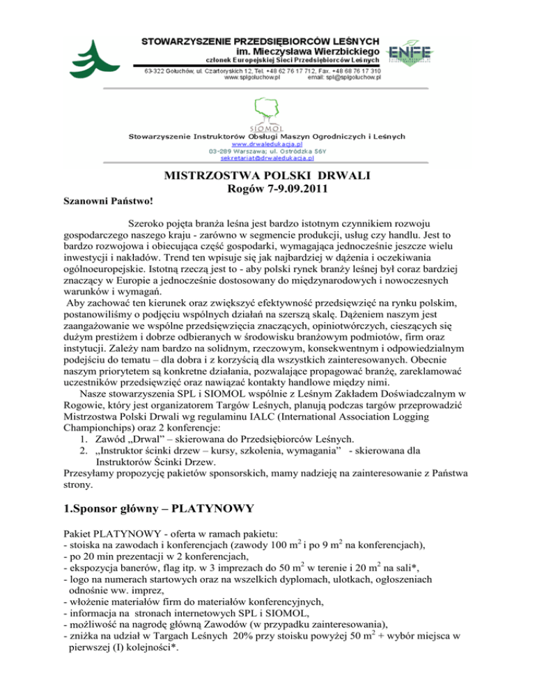 MISTRZOSTWA POLSKI DRWALI Rogów 7-9.09.2011 Szanowni Państwo! Szeroko pojęta branŜa leśna jest bardzo istotnym czynnikiem rozwoju gospodarczego naszego kraju - zarówno w segmencie produkcji, usług czy handlu. Jest to bardzo rozwojowa i obiecująca część gospodarki, wymagająca jednocześnie jeszcze wielu inwestycji i nakładów. Trend ten wpisuje się jak najbardziej w dąŜenia i oczekiwania ogólnoeuropejskie. Istotną rzeczą jest to - aby polski rynek branŜy leśnej był coraz bardziej znaczący w Europie a jednocześnie dostosowany do międzynarodowych i nowoczesnych warunków i wymagań. Aby zachować ten kierunek oraz zwiększyć efektywność przedsięwzięć na rynku polskim, postanowiliśmy o podjęciu wspólnych działań na szerszą skalę. DąŜeniem naszym jest zaangaŜowanie we wspólne przedsięwzięcia znaczących, opiniotwórczych, cieszących się duŜym prestiŜem i dobrze odbieranych w środowisku branŜowym podmiotów, firm oraz instytucji. ZaleŜy nam bardzo na solidnym, rzeczowym, konsekwentnym i odpowiedzialnym podejściu do tematu – dla dobra i z korzyścią dla wszystkich zainteresowanych. Obecnie naszym priorytetem są konkretne działania, pozwalające propagować branŜę, zareklamować uczestników przedsięwzięć oraz nawiązać kontakty handlowe między nimi. Nasze stowarzyszenia SPL i SIOMOL wspólnie z Leśnym Zakładem Doświadczalnym w Rogowie, który jest organizatorem Targów Leśnych, planują podczas targów przeprowadzić Mistrzostwa Polski Drwali wg regulaminu IALC (International Association Logging Championchips) oraz 2 konferencje: 1. Zawód „Drwal” – skierowana do Przedsiębiorców Leśnych. 2. „Instruktor ścinki drzew – kursy, szkolenia, wymagania” - skierowana dla Instruktorów Ścinki Drzew. Przesyłamy propozycję pakietów sponsorskich, mamy nadzieję na zainteresowanie z Państwa strony. 1.Sponsor główny – PLATYNOWY Pakiet PLATYNOWY - oferta w ramach pakietu: - stoiska na zawodach i konferencjach (zawody 100 m2 i po 9 m2 na konferencjach), - po 20 min prezentacji w 2 konferencjach, - ekspozycja banerów, flag itp. w 3 imprezach do 50 m2 w terenie i 20 m2 na sali*, - logo na numerach startowych oraz na wszelkich dyplomach, ulotkach, ogłoszeniach odnośnie ww. imprez, - włoŜenie materiałów firm do materiałów konferencyjnych, - informacja na stronach internetowych SPL i SIOMOL, - moŜliwość na nagrodę główną Zawodów (w przypadku zainteresowania), - zniŜka na udział w Targach Leśnych 20% przy stoisku powyŜej 50 m2 + wybór miejsca w pierwszej (I) kolejności*. 2.Sponsor ZŁOTY Pakiet ZŁOTY - oferta w ramach pakietu: - 10 min prezentacji w 2 konferencjach, - ekspozycja banerów, flag itp. w 3 imprezach do 20 m2 w terenie i 6 m2 na sali*, - logo na materiałach informacyjnych ww. imprez, - włoŜenie materiałów firm do materiałów konferencyjnych, - informacja na stronach internetowych SPL i SIOMOL, - stoisko na Zawodach do 35 m2, - zniŜka na udział w Targach Leśnych 10% przy stoisku powyŜej 50 m2 + wybór miejsca w drugiej (II) kolejności*. 3.Sponsor SREBRNY Pakiet SREBRNY - oferta w ramach pakietu: - ekspozycja banerów, flag itp. w 3 imprezach do 10 m2 w terenie i 2 m2 na sali*, - włoŜenie materiałów firm do materiałów konferencyjnych, - informacja na stronach internetowych SPL i SIOMOL, - stoisko na Zawodach do 20 m2, - zniŜka na udział w Targach Leśnych 5% przy stoisku powyŜej 50 m2 + wybór miejsca w trzeciej (III) kolejności *. *rabaty nie sumują się z innymi udzielanymi przez organizatora targów. *na sali preferowane są materiały do postawienia. Co do szczegółów proszę kontaktować się z: 1. Pełnomocnikiem Zarządu Głównego SPL - Stefanem Sokolskim tel. 602 485 181; e-mail: [email protected] lub 2. Prezesem Zarządu SIOMOL - Robertem Kujawiakiem tel.696 67 67 67; e-mail: [email protected]