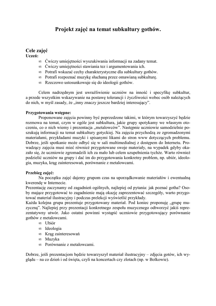 Projekt zajęć na temat subkultury gothów. Cele zajęć Uczeń: • • • • • Ćwiczy umiejętności wyszukiwania informacji na zadany temat. Ćwiczy umiejętności stawiania tez i argumentowania ich. Potrafi wskazać cechy charakterystyczne dla subkultury gothów. Potrafi rozpoznać muzykę słuchaną przez omawianą subkulturę. Rzeczowo ustosunkowuje się do ideologii gothów. Celem nadrzędnym jest uwrażliwienie uczniów na inność i specyfikę subkultur, a przede wszystkim wskazywanie na postawę tolerancji i życzliwości wobec osób należących do nich, w myśl zasady, że „inny znaczy jeszcze bardziej interesujący”. Przygotowania wstępne: Proponowane zajęcia powinny być poprzedzone takimi, w którym towarzyszyć będzie rozmowa na temat, czym w ogóle jest subkultura, jakie grupy spotykamy we własnym otoczeniu, co o nich wiemy i prezentacja „metalowców”. Następnie uczniowie samodzielnie poszukują informacji na temat subkultury gotyckiej. Na zajęcia przychodzą ze zgromadzonymi materiałami, przykładami muzyki i spisanymi likami do stron www dotyczących problemu. Dobrze, jeśli spotkanie może odbyć się w sali multimedialnej z dostępem do Internetu. Prowadzący zajęcia musi mieć również przygotowane swoje materiały, na wypadek gdyby okazało się, że uczniowie zgromadzili ich za mało lub celem uzupełnienia tychże. Warto również podzielić uczniów na grupy i dać im do przygotowania konkretny problem, np. ubiór, ideologia, muzyka, krąg zainteresowań, porównanie z metalowcami. Przebieg zajęć: Na początku zajęć dajemy grupom czas na uporządkowanie materiałów i ewentualną kwerendę w Internecie. Prezentację zaczynamy od zagadnień ogólnych, najlepiej od pytania: jak poznać gotha? Osoby mające przygotować to zagadnienie mają okazję zaprezentować szczegóły, warto przygotować materiał ilustracyjny i podczas prelekcji wyświetlić przykłady. Każda kolejna grupa prezentuje przygotowany materiał. Pod koniec proponuję „grupę muzyczną”. Najlepiej przy prezentacji konkretnego zespołu muzycznego odtworzyć jakiś reprezentatywny utwór. Jako ostatni powinni wystąpić uczniowie przygotowujący porównanie gothów z metalowcami. • Ubiór • Ideologia • Krąg zainteresowań • Muzyka • Porównanie z metalowcami. Dobrze, jeśli prezentacjom będzie towarzyszył materiał ilustracyjny – zdjęcia gotów, ich wyglądu – na co dzień i od święta, czyli na koncertach czy zlotach (np. w Bolkowie). Na podsumowanie tej części proponuję schematyczny rysunek gotha. Uczniowie samodzielnie muszą „ubrać” te postaci, np. zamiast włosów wpisujemy elementy ideologiczne, sukienka lub bluza może być przyozdobiona nazwami zespołów muzycznych bądź tytułami ulubionych, kultowych powieści gotha. Można zaproponować również odpowiednie przyozdobienie postaci gadżetami typu łańcuchy z krzyżami, pieszczochy itp., na nogi „zakładamy” glany. Na zakończenie zajęć może być dyskusja nad tym, co może w tej subkulturze się podobać, co odstraszyć. Staramy się, aby uczniowie unikali ocen i mówili o swoich odczuciach. Warto także zdobyć wypowiedzi autentycznych gothów, przeczytać je i poprosić o ustosunkowanie się do nich; również na zasadzie odczuć i skojarzeń, lecz bez oceny. Ostatnim elementem spotkania niech będzie postawienie sobie pytania: „czy ja mógłbym zostać gothem?” albo inaczej: „czy jest w tej subkulturze coś, co mnie zainteresowało, zaintrygowało?”. Dobrze by było zrobić to metodą „rundki”, czyli wszyscy obecni po kolei wypowiadają się na postawione pytanie. Powyższy projekt jest oczywiście tylko propozycją, każdy zainteresowany może zmodyfikować go według własnych potrzeb i zainteresowań czy zdolności grupy, z którą pracuje. Ważne, aby młodzież nie uprzedziła się do tej subkultury, tylko potrafiła ją rozpoznać i umiała nazwać swoje odczucia z nią związane, bez wydawania sądów i ocen. Opracowała Anna Kurpiel Studia podyplomowe WOK Grupa I