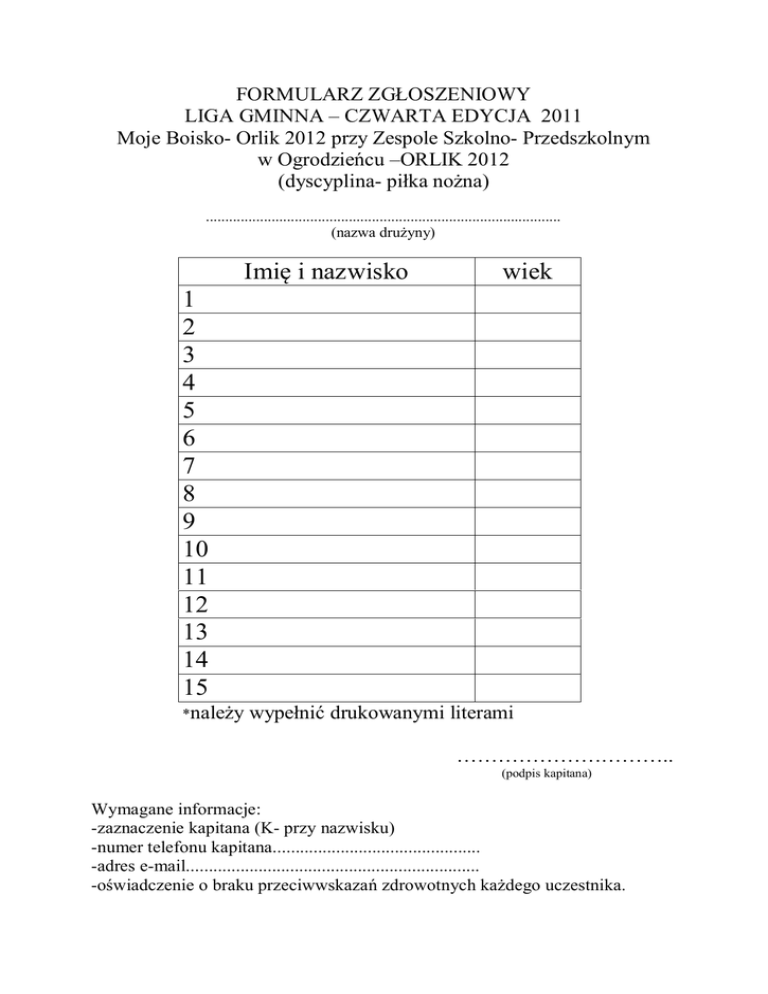 FORMULARZ ZGŁOSZENIOWY LIGA GMINNA – CZWARTA EDYCJA 2011 Moje Boisko- Orlik 2012 przy Zespole Szkolno- Przedszkolnym w Ogrodzieńcu –ORLIK 2012 (dyscyplina- piłka nożna) ............................................................................................ (nazwa drużyny) Imię i nazwisko wiek 1 2 3 4 5 6 7 8 9 10 11 12 13 14 15 *należy wypełnić drukowanymi literami ………………………….. (podpis kapitana) Wymagane informacje: -zaznaczenie kapitana (K- przy nazwisku) -numer telefonu kapitana.............................................. -adres e-mail................................................................. -oświadczenie o braku przeciwwskazań zdrowotnych każdego uczestnika. REGULAMIN UCZESTNICTWA GMINNEJ LIGI PIŁKI NOŻNEJ- ORLIK 2012 TEKST UJEDNOLICONY Postanowienia wstępne. 1. Rozgrywki przeprowadzone zostaną na kompleksie sportowym Moje Boisko-Orlik 2012 przy Zespole Szkolno-Przedszkolnym w Ogrodzieńcu systemem dwu rundowym (mecz i rewanż). 2. Organizatorem rozgrywek są Animatorzy Moje Boisko-Orlik 2012 przy współpracy z Zespołem Szkolno-Przedszkolnym w Ogrodzieńcu oraz Urzędem Miasta i Gminy Ogrodzieniec. 3. Mecze rozgrywane będą po wcześniejszym przedstawieniu terminarza rozgrywek. 4. Po zakończeniu rozgrywek zostanie wyłoniony mistrz ligi. Przepisy ogólne 1. Drużyna składa się maksymalnie z 15 zawodników ( bramkarz i pięciu zawodników w polu, pozostali to rezerwowi). 2. Na uczestnikach ligi spoczywa obowiązek ubezpieczenia się, a Organizator nie ponosi żadnej odpowiedzialności za kontuzje, urazy i problemy zdrowotne, itp. zawodników. Ten obowiązek spoczywa również na osobach, które nie biorą udziału w Lidze Gminnej, a biorą udział w treningach organizowanych na Orliku. 3. Kapitan drużyny ma prawo zwrócić się do sędziego z prośbą o nie dopuszczenie do gry zawodnika drużyny przeciwnej, który nie ma obuwia sportowego lub którego strój odbiega od strojów pozostałych zawodników. W takim przypadku sędzia nie dopuszcza wskazanego zawodnika do gry do chwili uzupełnienia stroju lub założenia przez drużynę narzutek (znaczników). 4. Zawodnicy mogą grać wyłącznie w obuwiu sportowym. 5. W miarę możliwości technicznych Organizator udostępnia drużynie szatnię oraz możliwość skorzystania z prysznica. Drużyna ma obowiązek pozostawienia po sobie czystej szatni. Za wszelkie szkody wyrządzone przez zawodników drużyny na terenie szkoły i obiektu sportowego odpowiada kapitan drużyny. 6. Uczestnicy są zobowiązani do przestrzegania zasad współżycia społecznego, zasad fair play, a w szczególności poszanowania zdrowia i godności osobistej innych uczestników Ligi Gminnej. 7. Za przewinienia podlegające na upomnieniu (żółta kartka) stosuje się wykluczenia czasowe na 2 lub 5 min., w zależności od rodzaju przewinienia. 8. W przypadku wykluczenia zawodnika (czerwona kartka) zespół gra w osłabieniu 5 min., a po ich upływie wprowadza zawodnika innego niż ukarany wykluczeniem. 9. Przy 1 wykluczeniu czasowym - żółta kartka, następnie wykluczenie całkowite czerwona kartka i może wejść inny zawodnik po 5 min. 10. Gdy drużyna grająca w osłabionym składzie na skutek czasowego wykluczenia zawodnika straci bramkę, zawodnik ukarany karą minutową ma automatyczne prawo powrotu na boisko. 11. W przypadku straty bramki przez drużynę grającą w niepełnym składzie na skutek wykluczenia zawodnika (czerwona kartka) - drużyna może wprowadzić do gry zawodnika innego niż zawodnik ukarany wykluczeniem po upływie 5 min. 12. Jeśli w trakcie gry jedna z drużyn „uzbiera” pięć fauli, to na korzyść drugiej stosowany jest rzut karny. 13. W sytuacjach nieprzewidzianych Organizator ma prawo odwołać kolejkę informując o tym kapitanów drużyn. 14. Mecz wygrywa drużyna, która zdobędzie więcej bramek. 15. W przypadku równej ilości strzelonych bramek mecz kończy się wynikiem nierozstrzygniętym (remisem). 16. O końcowej kolejności drużyn w tabeli decyduje liczba zdobytych punktów. W przypadku równej ilości punktów o pozycji decydują kolejno: bezpośrednie wyniki meczów pomiędzy drużynami, lepsza różnica bramek, większa ilość zdobytych bramek. 17. Na kapitanie drużyny spoczywa obowiązek zapoznania zawodników swojej drużyny z niniejszymi przepisami. 18. Jeśli zawodnik bądź drużyna nie stosuje się do ogólnie znanych zasad fair play, na drużynę bądź zawodnika zostają nałożone kary. Karą może być całkowite wykluczenie z rozgrywek bądź zawieszenie w udziale do 10 kolejek. Przepisy szczegółowe 1. Rozgrywki są prowadzone na podstawie obowiązujących przepisów gry w piłkę nożną z zastrzeżeniem zmian wprowadzonych niniejszym regulaminem. 2. Mecz składa się z dwóch równych części po 15 minut każda z 5 minutową przerwą pomiędzy nimi. 3. Po przerwie drużyny zamieniają się stronami boiska. 4. Drużyny grają po 6 zawodników, w tym jeden bramkarz. 5. Aby mecz mógł się rozpocząć na boisku musi znajdować się minimum 5 zawodników każdej z drużyn. (Jeśli wskutek kar w czasie gry drużyna będzie miała mniej niż 3 zawodników na boisku mecz oddany jest walkowerem). 6. Walkower orzeka sędzia po upływie 5 minut od przewidzianego czasu rozpoczęcia rozgrywek, jeżeli drużyna jest niekompletna. 7. Zmiany są lotne wyłącznie w strefie zmian. 8. Strefą zmian określony jest obszar przy ławce zawodników rezerwowych drużyny. 9. Piłka z autu jest wybijana nogą. 10. Bramkarz wprowadza piłkę do gry ręką podając ją do zawodnika. 11. Drużyna ma 5 sekund na wprowadzenie piłki do gry. Po tym czasie sędzia odgwizduje rzut wolny dla drużyny przeciwnej. 12. Zawodnik drużyny przeciwnej powinien znajdować się 5 metrów od miejsca wybijania autu, rzutu rożnego, bądź rzutu wolnego. 13. Wszystkie rzuty wolne są bezpośrednie. 14. Rzuty wolne podyktowane za przewinienia w obrębie pola karnego (poza rzutem k