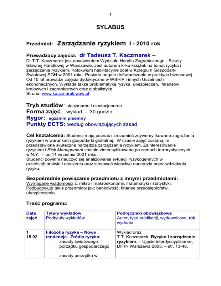 1 SYLABUS Przedmiot: Zarządzanie ryzykiem I - 2010 rok Prowadzący zajęcia: dr Tadeusz T. Kaczmarek – Dr T.T. Kaczmarek jest absolwentem Wydziału Handlu Zagranicznego - Szkoły Głównej Handlowej w Warszawie. Jest autorem kilku książek na temat ryzyka i zarządzania ryzykiem. Kolokwium habilitacyjne zdał w Kolegium Gospodarki Światowej SGH w 2001 roku. Posiada bogate doświadczenie w praktyce biznesowej. Od 10 lat prowadzi zajęcia dydaktyczne w WSHiP i innych Uczelniach ekonomicznych. Wykłada także problematykę ryzyka, ubezpieczeń, finansów krajowych i zagranicznych oraz globalistykę. Strona: www.kaczmarek.waw.pl Tryb studiów: stacjonarne i niestacjonarne Forma zajęć: wykład - 30 godzin Rygor: egzamin pisemny Punkty ECTS: według obowiązujących zasad Cel kształcenia: Studenci mają poznać i zrozumieć zdywersyfikowane zagrożenia ryzykiem w warunkach gospodarki globalnej. W czasie zajęć zostaną im przedstawione skuteczne narzędzia zarządzania ryzykiem. Zainteresowanie ryzykiem i Risk Management zostało zintensyfikowane po zamach terrorystycznych w N.Y. – po 11 września 2001 roku. Studenci powinni nauczyć się analizowania sytuacji ryzykogennych w przedsiębiorstwie i otoczeniu oraz stosować właściwe narzędzia przeciwdziałania ryzyku. Bezpośrednie powiązanie przedmiotu z innymi przedmiotami: Wymagane wiadomości z: mikro i makroekonomii, matematyki i statystyki. Podbudowuje takie przedmioty jak: bankowość, finanse przedsiębiorstw, ubezpieczenia. Treść programu: Data zajęć Tytuły wykładów Podtytuły wykładów Podręczniki obowiązkowe Autor, tytuł publikacji, wydawnictwo, rok wydania 1 15.02 Filozofia ryzyka – Nowe tendencje. Źródła ryzyka: - zasady światowego porządku gospodarczego Wykład oraz T.T. Kaczmarek, Ryzyko i zarządzanie ryzykiem. – Ujęcie interdyscyplinarne, DIFIN Warszawa 2005. – str. 13-48. - zasady porządku w 2 - państwie źródła ryzyka cywilizacyjnego ryzyko związane z prognozowaniem ryzyko polityczne dla Polski ryzyko ekologiczne ryzyko w obszarze infoekonomii 2 22.02 Pojęcie i taksonomia ryzyka: - ryzyko gospodarcze - ryzyko prawne - sił wyższej - cenowe - finansowe: - kredytowe - kursu walutowego - operacyjne - inwestycji finansowej - polityczne T.T. Kaczmarek, Zarządzanie ryzykiem handlowym, finansowym, produkcyjnym, ODDK Gdańsk 2002 T.T. Kaczmarek, Ryzyko i zarządzanie ryzykiem. – Ujęcie interdyscyplinarne, DIFIN Warszawa 2005. str. 48-93. 3 01.03 Źródła informacji. - podstawowe źródła informacji ekonomicznych i finansowych, - Krajowy Rejestr Sądowy - Sprawozdania firm - Wywiadownie gospodarcze - Inne źródła informacji. T.T. Kaczmarek, Ryzyko i zarządzanie ryzykiem .. – jak wyżej, str. 176-227. 4 08.03 Rola informacji w zarządzaniu gospodarką: - istota współczesnej rewolucji informacyjnej - wiedza i informacje – paradygmat trzeciej cywilizacji T.T. Kaczmarek, Ryzyko i zarządzanie ryzykiem. – Ujęcie interdyscyplinarne, DIFIN Warszawa 2005, str. 136-151. 5 15.03 Zarządzanie ryzykiem: - generalne zasady, - proces zarządzania ryzykiem - ubezpieczenie od ryzyka, - inne formy zarządzania ryzykiem T.T. Kaczmarek, Ryzyko i zarządzanie ryzykiem. – Ujęcie interdyscyplinarne, DIFIN Warszawa 2005. str. 95-111. 6 22.03 Zintegrowane zarządzanie ryzykiem w przedsiębiorstwie: - sprzężenia zwrotne, - symptomy zagrożenia ryzykiem, - ryzyko upadłości T.T. Kaczmarek, Ryzyko i zarządzanie ryzykiem. – Ujęcie interdyscyplinarne, DIFIN Warszawa 2005. str. 116-135. 3 przedsiębiorstwa 7 29.03 Agencje ratingowe – metody i kryteria oceny wiarygodności finansowej i ekonomicznej podmiotów gospodarczych T.T. Kaczmarek, Ryzyko i zarządzanie ryzykiem. – Ujęcie interdyscyplinarne, DIFIN Warszawa 2005. str. 247-255. 8 12.04 Zarządzanie ryzykiem finansowym przedsiębiorstwa T.T. Kaczmarek, Ryzyko i zarządzanie ryzykiem. – Ujęcie interdyscyplinarne, DIFIN Warszawa 2005. str. 257-271. 9 19.04 Ryzyko kursu walutowego i metody zarządzania ryzykiem kursowym 10 26.04 Zabezpieczanie się przed ryzykiem stopy procentowej za pomocą nowych instrumentów pochodnych - forward rate agreement - interest rate futures - swap odsetkowy - opcje odsetkowe J. Świderski, R. Kostro, Zarządzanie ryzykiem banku, WSUiB, Warszawa 1999, str. 75-91. Z. Zawadzka, Zarządzanie ryzykiem w banku komercyjnym, Poltext Warszawa 1996 Str. 155-191. J. Hull, Kontrakty terminowe i opcje, WIG-Press Warszawa 1999, Z. Zawadzka, jak wyżej, str. 87-155. 11 10.05 Ryzyko kredytowe: D. Lewandowski, Nowe ryzyko - pojęcie ryzyka rynkowego bankowe a nadzór bankowy, TUTOR - pomiar wartości ryzyka w Warszawa 1995, str. 46-79. różnych walutach (odsetki, otwarte pozycje terminowe) - pomiar ryzyka kredytowego dla transakcji pochodnych 12 17.05 Ryzyko w handlu międzynarodowym: - ryzyko krajowe i zagraniczne 13 Ryzyko oraz przestępczość komputerowa 14 Nowe obszary ryzyka w globalnej gospodarce Literatura dodatkowa: T.T. Kaczmarek, Ryzyko w handlu międzynarodowym, ODDK Gdańsk 2004. str. 181-205. Plus wykład T.T. Kaczmarek, Ryzyko i zarządzanie ryzykiem. – Ujęcie interdyscyplinarne, DIFIN Warszawa 2005. str. 152-176. T.T. Kaczmarek, op. cit., str. 304-351. 4 1. S. Nahotko, Ryzyko ekonomiczne w działalności gospodarczej, TNOIK Bydgoszcz 1997. 2. J. Kisielnicki, Zarządzanie organizacją, WSHP Warszawa 2001. 3. P. Misztal, Zabezpieczenie przed ryzykiem zmian kursu walutowego, Difin Warszawa 2004. 4. G. Crawford, B. Sen, Instrumenty pochodne, Liber Warszawa 1998, Metody oceny: Obecność na zajęciach obowiązkowa. Nieobecność na więcej niż dwóch zajęciach skutkuje koniecznością napisania eseju na temat podany przez wykładowcę i złożenie go na przedostatnich zajęciach w semestrze. Nieobecność na więcej niż 3 zajęciach skutkuje skreśleniem studenta z listy osób dopuszczonych do zaliczenia. 50% - egz. końcowy, 30% - egz. Połówkowy, 20% - inne. Anglojęzyczny słowniczek głównych poję