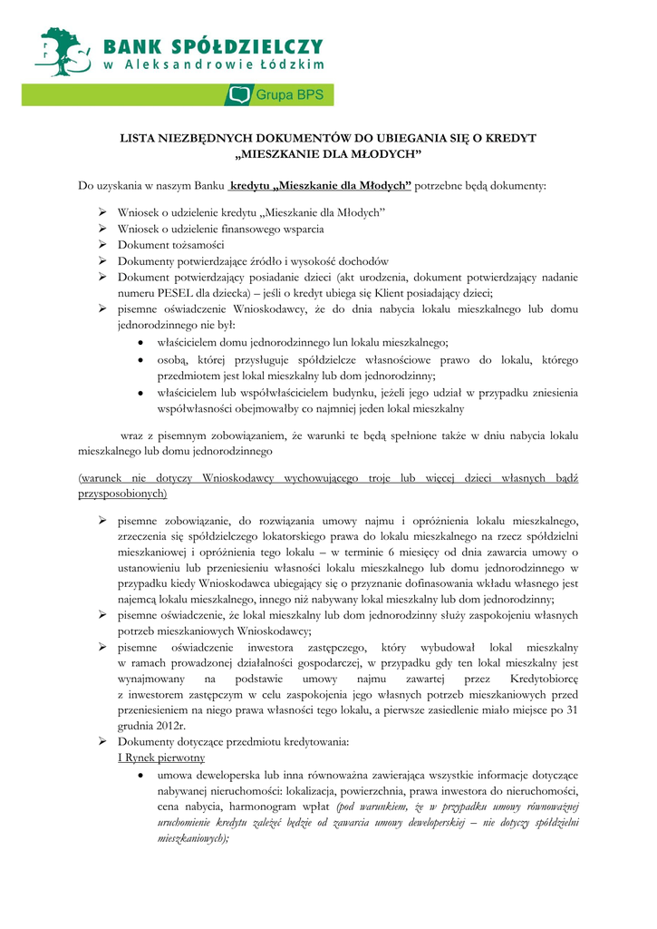 LISTA NIEZBĘDNYCH DOKUMENTÓW DO UBIEGANIA SIĘ O KREDYT „MIESZKANIE DLA MŁODYCH” Do uzyskania w naszym Banku kredytu „Mieszkanie dla Młodych” potrzebne będą dokumenty: Wniosek o udzielenie kredytu „Mieszkanie dla Młodych” Wniosek o udzielenie finansowego wsparcia Dokument tożsamości Dokumenty potwierdzające źródło i wysokość dochodów Dokument potwierdzający posiadanie dzieci (akt urodzenia, dokument potwierdzający nadanie numeru PESEL dla dziecka) – jeśli o kredyt ubiega się Klient posiadający dzieci; pisemne oświadczenie Wnioskodawcy, że do dnia nabycia lokalu mieszkalnego lub domu jednorodzinnego nie był: właścicielem domu jednorodzinnego lun lokalu mieszkalnego; osobą, której przysługuje spółdzielcze własnościowe prawo do lokalu, którego przedmiotem jest lokal mieszkalny lub dom jednorodzinny; właścicielem lub współwłaścicielem budynku, jeżeli jego udział w przypadku zniesienia współwłasności obejmowałby co najmniej jeden lokal mieszkalny wraz z pisemnym zobowiązaniem, że warunki te będą spełnione także w dniu nabycia lokalu mieszkalnego lub domu jednorodzinnego (warunek nie dotyczy Wnioskodawcy wychowującego troje lub więcej dzieci własnych bądź przysposobionych) pisemne zobowiązanie, do rozwiązania umowy najmu i opróżnienia lokalu mieszkalnego, zrzeczenia się spółdzielczego lokatorskiego prawa do lokalu mieszkalnego na rzecz spółdzielni mieszkaniowej i opróżnienia tego lokalu – w terminie 6 miesięcy od dnia zawarcia umowy o ustanowieniu lub przeniesieniu własności lokalu mieszkalnego lub domu jednorodzinnego w przypadku kiedy Wnioskodawca ubiegający się o przyznanie dofinasowania wkładu własnego jest najemcą lokalu mieszkalnego, innego niż nabywany lokal mieszkalny lub dom jednorodzinny; pisemne oświadczenie, że lokal mieszkalny lub dom jednorodzinny służy zaspokojeniu własnych potrzeb mieszkaniowych Wnioskodawcy; pisemne oświadczenie inwestora zastępczego, który wybudował lokal mieszkalny w ramach prowadzonej działalności gospodarczej, w przypadku gdy ten lokal mieszkalny jest wynajmowany na podstawie umowy najmu zawartej przez Kredytobiorcę z inwestorem zastępczym w celu zaspokojenia jego własnych potrzeb mieszkaniowych przed przeniesieniem na niego prawa własności tego lokalu, a pierwsze zasiedlenie miało miejsce po 31 grudnia 2012r. Dokumenty dotyczące przedmiotu kredytowania: I Rynek pierwotny umowa deweloperska lub inna równoważna zawierająca wszystkie informacje dotyczące nabywanej nieruchomości: lokalizacja, powierzchnia, prawa inwestora do nieruchomości, cena nabycia, harmonogram wpłat (pod warunkiem, że w przypadku umowy równoważnej uruchomienie kredytu zależeć będzie od zawarcia umowy deweloperskiej – nie dotyczy spółdzielni mieszkaniowych); ostateczna decyzja administracyjna o pozwolenia na użytkowanie z załącznikami w przypadku nabycia nieruchomości na rynku pierwotnym, której budowa została już zakończona; decyzja o pozwoleniu na budowę z klauzulą ostateczności. II Rynek wtórny aktualna (z ostatnich 6 miesięcy) wycena wartości nieruchomości wykonana przez rzeczoznawcę. W uzasadnionych przypadkach Bank może wymagać od Wnioskodawcy aktualizacji lub nowej wyceny nieruchomości. Możliwe jest zrezygnowanie z operatu szacunkowego w przypadku: nabywania nieruchomości budowanej przez dewelopera, inwestora zastępczego lub spółdzielnię mieszkaniową – pod warunkiem zawarcia w umowie pomiędzy Wnioskodawcą a deweloperem/spółdzielnią dokładnego opisu kredytowanej nieruchomości oraz dołączenia harmonogramu wpłat z tytułu tej umowy; nabywania lokalu mieszkalnego od gminy, gdzie wszelkie informacje zawarte są w dokumencie potwierdzającym prawo do nabycia lokalu przez klienta; w przypadku kredytu do 300 000,00 PLN. aktualny odpis z księgi wieczystej nieruchomości (odpis z ostatnich 3 miesięcy) lub jeśli brak jest księgi wieczystej dla nieruchomości – aktualny odpis ze zbioru dokumentów danej nieruchomości (odpis z ostatnich 3 miesięcy). W przypadku księgi wieczystej prowadzonej w systemie informatycznym, Bank dopuszcza przegląd przez pracownika Banku księgi wieczystej w Centralnej Bazie Danych Ksiąg Wieczystych. w przypadku własnościowego spółdzielczego prawa do lokalu – oświadczenie ze spółdzielni o braku przeciwskazań do założenia księgi wieczystej (jeżeli nie jest założona)/ odpis z księgi wieczystej gruntu/ oświadczenie ze spółdzielni o prawie własności do gruntu/ użytkowania wieczystego i braku księgi wieczystej dla lokalu. aktualny (wydany w ciągu ostatnich 3 miesięcy) wypis i wyrys z rejestru gruntów oraz decyzja o warunkach zabudowy lub zaświadczenie z właściwego miejscowo i rzeczowo urzędu o przeznaczeniu nieruchomości w miejscowym planie zagospodarowania przestrzennego (nie dotyczy lokali mieszkalnych); umowa przedwstępna nabycia w formie aktu notarialnego lub umowy cywilno-prawnej; zaświadczenie ze spółdzielni o braku zaległości w opłatach wraz z informacją, komu przysługuje spółdzielcze własnościowe prawo do domu/lokalu – w przypadku zakupu spółdzielczego własnościowego prawa; inne dokumenty uzgodnione z Bankiem. Dodatkowe dokumenty mogą być potrzebne w przypadku: rozdzielności majątkowej – będzie to decyzja sądu lub akt notarialny ustanowienia między małżonkami rozdzielności majątkowej, zawartej nie później niż 1 miesiąc przez złożeniem wniosku; rozwodu i separacji – będzie to wyrok sądu stwierdzający rozwód lub separację. Wnioskodawca zobowiązany jest do okazania oryginałów wszystkich dokumentów wymaganych jako uzupełnienie wniosku kredytowego. Kopie sporządzane są przez pracownika Banku i poświadczane przez niego za zgodność z oryginałem. W przeciwnym wypadku kopie lub odpisy sporządzone na użytek Banku powinny być potwierdzone notarialnie. Jeśli potrzebujesz więcej informacji lub masz pytania to zac