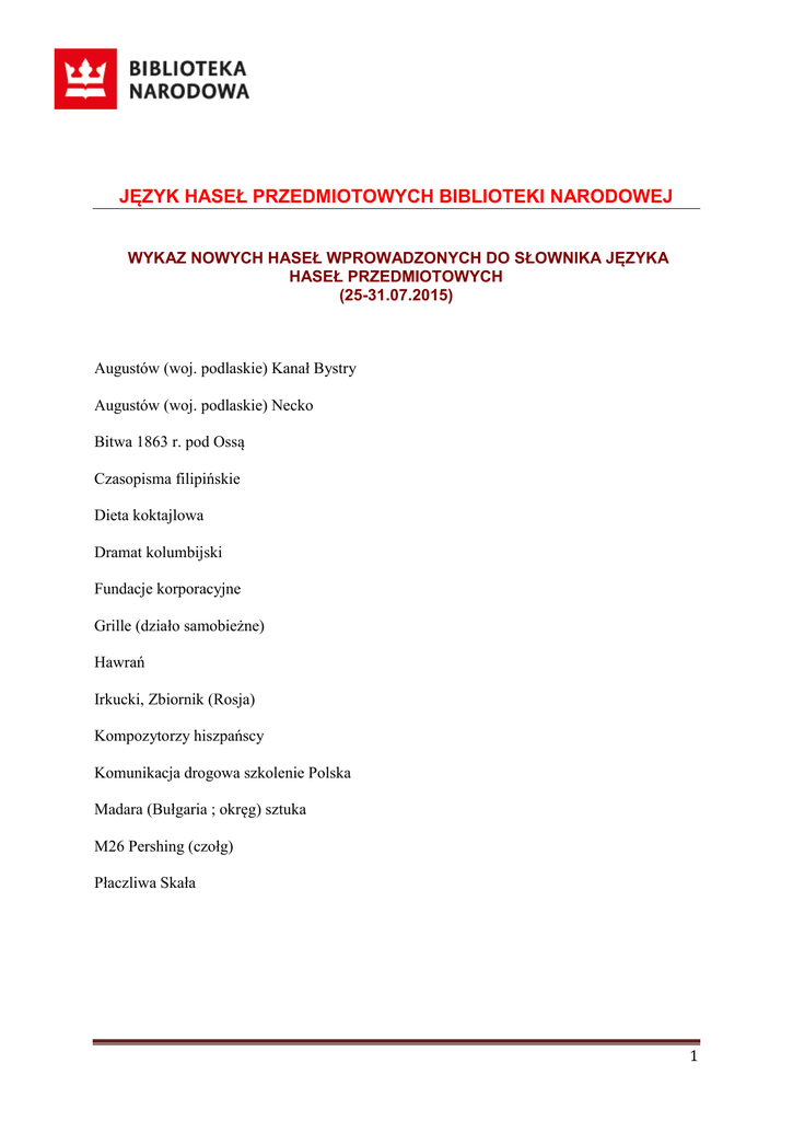 JĘZYK HASEŁ PRZEDMIOTOWYCH BIBLIOTEKI NARODOWEJ WYKAZ NOWYCH HASEŁ WPROWADZONYCH DO SŁOWNIKA JĘZYKA HASEŁ PRZEDMIOTOWYCH (25-31.07.2015) Augustów (woj. podlaskie) Kanał Bystry Augustów (woj. podlaskie) Necko Bitwa 1863 r. pod Ossą Czasopisma filipińskie Dieta koktajlowa Dramat kolumbijski Fundacje korporacyjne Grille (działo samobieżne) Hawrań Irkucki, Zbiornik (Rosja) Kompozytorzy hiszpańscy Komunikacja drogowa szkolenie Polska Madara (Bułgaria ; okręg) sztuka M26 Pershing (czołg) Płaczliwa Skała 1