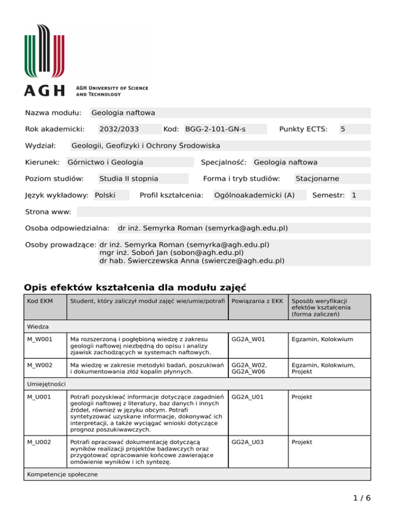 Nazwa modułu: Geologia naftowa Rok akademicki: Wydział: Kierunek: 2032/2033 Kod: BGG-2-101-GN-s Punkty ECTS: 5 Geologii, Geofizyki i Ochrony Środowiska Górnictwo i Geologia Poziom studiów: Studia II stopnia Język wykładowy: Polski Specjalność: Geologia naftowa Forma i tryb studiów: Profil kształcenia: Stacjonarne Ogólnoakademicki (A) Semestr: 1 Strona www: Osoba odpowiedzialna: dr inż. Semyrka Roman ([email protected]) Osoby prowadzące: dr inż. Semyrka Roman ([email protected]) mgr inż. Soboń Jan ([email protected]) dr hab. Świerczewska Anna ([email protected]) Opis efektów kształcenia dla modułu zajęć Kod EKM Student, który zaliczył moduł zajęć wie/umie/potrafi Powiązania z EKK Sposób weryfikacji efektów kształcenia (forma zaliczeń) M_W001 Ma rozszerzoną i pogłębioną wiedzę z zakresu geologii naftowej niezbędną do opisu i analizy zjawisk zachodzących w systemach naftowych. GG2A_W01 Egzamin, Kolokwium M_W002 Ma wiedzę w zakresie metodyki badań, poszukiwań i dokumentowania złóż kopalin płynnych. GG2A_W02, GG2A_W06 Egzamin, Kolokwium, Projekt M_U001 Potrafi pozyskiwać informacje dotyczące zagadnień geologii naftowej z literatury, baz danych i innych źródeł, również w języku obcym. Potrafi syntetyzować uzyskane informacje, dokonywać ich interpretacji, a także wyciągać wnioski dotyczące prognoz poszukiwawczych. GG2A_U01 Projekt M_U002 Potrafi opracować dokumentację dotyczącą wyników realizacji projektów badawczych oraz przygotować opracowanie końcowe zawierające omówienie wyników i ich syntezę. GG2A_U03 Projekt Wiedza Umiejętności Kompetencje społeczne 1/6 Karta modułu - Geologia naftowa M_K001 Potrafi myśleć i działać w sposób kreatywny i przedsiębiorczy w zakresie koncepcji poszukiwań kopalin płynnych w zróżnicowanych systemach naftowych. GG2A_K01 Projekt Matryca efektów kształcenia w odniesieniu do form zajęć Konwersatori um Zajęcia seminaryjne Zajęcia praktyczne Zajęcia terenowe Zajęcia warsztatowe Ma rozszerzoną i pogłębioną wiedzę z zakresu geologii naftowej niezbędną do opisu i analizy zjawisk zachodzących w systemach naftowych. + - + - - - - - - - - M_W002 Ma wiedzę w zakresie metodyki badań, poszukiwań i dokumentowania złóż kopalin płynnych. + - + - - - - - - - - M_U001 Potrafi pozyskiwać informacje dotyczące zagadnień geologii naftowej z literatury, baz danych i innych źródeł, również w języku obcym. Potrafi syntetyzować uzyskane informacje, dokonywać ich interpretacji, a także wyciągać wnioski dotyczące prognoz poszukiwawczych. - - + - - - - - - - - M_U002 Potrafi opracować dokumentację dotyczącą wyników realizacji projektów badawczych oraz przygotować opracowanie końcowe zawierające omówienie wyników i ich syntezę. - - + - - - - - - - - + - + - - - - - - - - E-learning Ćwiczenia projektowe M_W001 Inne Ćwiczenia laboratoryjne Forma zajęć Ćwiczenia audytoryjne Student, który zaliczył moduł zajęć wie/umie/potrafi Wykład Kod EKM Wiedza Umiejętności Kompetencje społeczne M_K001 Potrafi myśleć i działać w sposób kreatywny i przedsiębiorczy w zakresie koncepcji poszukiwań kopalin płynnych w zróżnicowanych systemach naftowych. 2/6 Karta modułu - Geologia naftowa Treść modułu zajęć (program wykładów i pozostałych zajęć) Wykład Przedmiot i zadania geologii naftowej. Podstawy prawne poszukiwań i eksploatacji węglowodorów (3h). System naftowy, jako podstawa procesów złożotwórczych (3h). Uwarunkowania genetyczne procesów naftowych (3h). Diagenetyczne wskaźniki temperatury wykorzystywane w prospekcji węglowodorów (6h). Diageneza strukturalna (9h). Analiza porównawcza systemu naftowego w basenach naftowych Polski (3h). Złoże naftowe. Zasady dokumentowania zasobów przemysłowych (6h). Obliczanie zasobów prognostycznych i przemysłowych węglowodorów, w poszczególnych etapach rozpoznania złoża (6h). Złoża węglowodorów w basenach naftowych Polski (3h). Ćwiczenia laboratoryjne Metody badawcze diagenezy strukturalnej oraz analiza danych diagenetycznych i strukturalnych w prospekcji węglowodorów – kolokwium, projekt (15 h). Obliczanie zasobów prognostycznych węglowodorów i obliczanie zasobów przemysłowych złóż (15h). Mechanika płynów – podstawowe pojęcia i prawa; obliczenia z zakresu analizy ruchu płynów – projekt (12h). Sposób obliczania oceny końcowej Na podstawie średniej ważonej z zaliczenia zajęć laboratoryjnych (waga 0.4) i egzaminu (waga 0.6). Wymagania wstępne i dodatkowe Znajomość podstaw geologii naftowej, petrologii skał osadowych, geologii strukturalnej, kartografii oraz budowy geologicznej Polski. Zalecana literatura i pomoce naukowe Bachleda-Curuś T., Semyrka R., 1990. Bilans węglowodorowy mezozoicznego kompleksu osadowego Centralnej Częsci Niżu Polskiego, Geologia 49, Zeszyty Naukowe AGH Bakirov A.A., 1973. Poszukiwania I rozpoznanie złóż ropy naftowej i gazu ziemnego. Wydawnictwa Geologiczne. Warszawa. Bjørlykke K. (ed.), 2010. Petroleum Geoscience: From Sedimentary Environments to Rock Physics, Springer-Verlag Berlin Heidelberg. Fossen H. 2010. Structural Geology. Cambridge University Press, Cambridge Hadro J., 2010. Strategia poszukiwań złóż gazu ziemnego w łupkach. Przegląd Geologiczny, 58: 250–258. Karnkowski, P., 1999. Oil and Gas Deposits in Poland. Towarzystwo Geosynoptyków “GEOS” AGH, Kraków. Karnkowski P., 2007. Petroleum provinces in Poland. Przegląd Geologiczny, 57:1061-1067. Laubach S.E., Eichhubl P., Hilgers C., Lander R.H., 2010. Structural diagenesis. Journal of Structural Geology, v. 32, no. 12, p. 1866-1872. doi:10.1016/j.jsg.2010.10.001 Levorsen A.I., 1972. Geologia ropy naftowej i gazu ziemnego. Wyd. Geologiczne, Warszawa. Nemčok, M., Schamel, S., Gayer, R. 2005. Thrust-belts. Structural Architecture, Thermal Regimes, and Petroleum Systems. Cambridge University Press. Cambridge. Nieć M.(red.), 2002. Zasady dokument