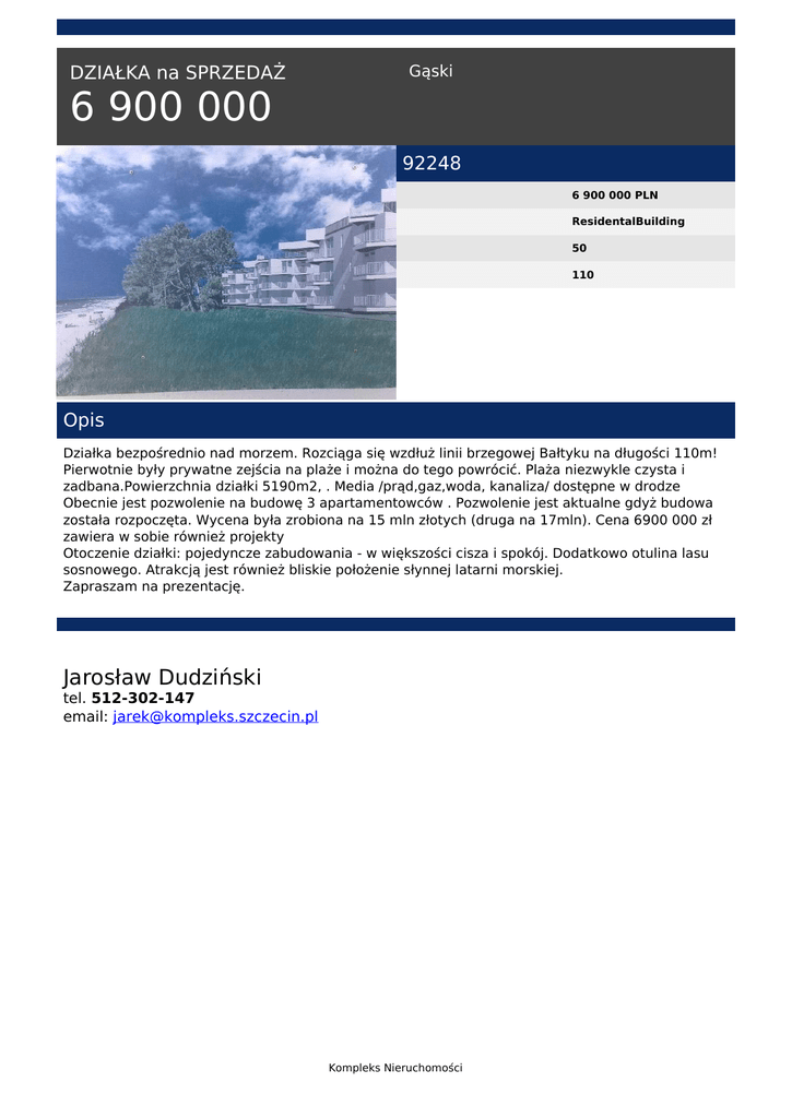 DZIAŁKA na SPRZEDAŻ Gąski 6 900 000 92248 6 900 000 PLN ResidentalBuilding 50 110 Opis Działka bezpośrednio nad morzem. Rozciąga się wzdłuż linii brzegowej Bałtyku na długości 110m! Pierwotnie były prywatne zejścia na plaże i można do tego powrócić. Plaża niezwykle czysta i zadbana.Powierzchnia działki 5190m2, . Media /prąd,gaz,woda, kanaliza/ dostępne w drodze Obecnie jest pozwolenie na budowę 3 apartamentowców . Pozwolenie jest aktualne gdyż budowa została rozpoczęta. Wycena była zrobiona na 15 mln złotych (druga na 17mln). Cena 6900 000 zł zawiera w sobie również projekty Otoczenie działki: pojedyncze zabudowania - w większości cisza i spokój. Dodatkowo otulina lasu sosnowego. Atrakcją jest również bliskie położenie słynnej latarni morskiej. Zapraszam na prezentację. Jarosław Dudziński tel. 512-302-147 email: [email protected] Kompleks Nieruchomości Powered by TCPDF (www.tcpdf.org)