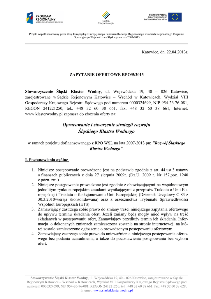 Projekt współfinansowany przez Unię Europejską z Europejskiego Funduszu Rozwoju Regionalnego w ramach Regionalnego Programu Operacyjnego Województwa Śląskiego na lata 2007-2013 Katowice, dn. 22.04.2013r. ZAPYTANIE OFERTOWE RPO/5/2013 Stowarzyszenie Śląski Klaster Wodny, ul. Wojewódzka 19, 40 – 026 Katowice, zarejestrowane w Sądzie Rejonowym Katowice – Wschód w Katowicach, Wydział VIII Gospodarczy Krajowego Rejestru Sądowego pod numerem 0000324699, NIP 954-26-76-081, REGON 241221250, tel.: +48 32 60 38 661, fax: +48 32 60 38 661, Internet: www.klasterwodny.pl zaprasza do złożenia oferty na: Opracowanie i stworzenie strategii rozwoju Śląskiego Klastra Wodnego w ramach projektu dofinansowanego z RPO WSL na lata 2007-2013 pn: "Rozwój Śląskiego Klastra Wodnego". I. Postanowienia ogólne 1. Niniejsze postępowanie prowadzone jest na podstawie zgodnie z art. 44.ust.3 ustawy o finansach publicznych z dnia 27 sierpnia 2009r. (Dz.U. 2009 r. Nr 157,poz. 1240 z późn. zm.) 2. Niniejsze postępowanie prowadzone jest zgodnie z obowiązującymi na wspólnotowym jednolitym rynku europejskim zasadami wynikającymi z przepisów Traktatu o Unii Europejskiej i Traktatu o funkcjonowaniu Unii Europejskiej (Dziennik Urzędowy C 83 z 30.3.2010/wersja skonsolidowana) oraz z orzecznictwa Trybunału Sprawiedliwości Wspólnot Europejskich (ETS) 3. Zamawiający zastrzega sobie prawo do zmiany treści niniejszego zapytania ofertowego do upływu terminu składania ofert. Jeżeli zmiany będą mogły mieć wpływ na treść składanych w postępowaniu ofert, Zamawiający przedłuży termin ich składania. Informacja o dokonanych zmianach zamieszczona zostanie na stronie internetowej, na której zostało zamieszczone ogłoszenie o prowadzonym postępowaniu ofertowym. 4. Zamawiający zastrzega sobie prawo do unieważnienia niniejszego postępowania ofertowego bez podania uzasadnienia, a także do pozostawienia postępowania bez wyboru ofert. Stowarzyszenie Śląski Klaster Wodny, ul. Wojewódzka 19, 40 – 026 Katowice, zarejestrowane w Sądzie Rejonowym Katowice – Wschód w Katowicach, Wydział VIII Gospodarczy Krajowego Rejestru Sądowego pod numerem 0000324699, NIP 954-26-76-081, REGON 241221250, tel.: +48 32 60 38 661, fax: +48 32 60 38 628, Internet: www.slaskiklasterwodny.pl Projekt współfinansowany przez Unię Europejską z Europejskiego Funduszu Rozwoju Regionalnego w ramach Regionalnego Programu Operacyjnego Województwa Śląskiego na lata 2007-2013 II. Opis przedmiotu zamówienia: Prace nad strategią rozwoju Klastra odbywać się będą poprzez uczestnictwo podmiotu odpowiedzialnego za jej opracowanie w oparciu o pomysły/propozycje zgłaszane przez podmioty ŚKW na stronie www oraz podczas spotkań dwustronnych/trójstronnych organizowanych w ramach Projektu Rozwoju Śląskiego Klastra Wodnego. Prace nad strategią rozwoju będą trwały od dnia podpisania umowy do 30 listopada 2014 roku (zakończenie rzeczowe realizacji projektu). Na podstawie stworzonej strategii rozwoju Klastra, zostanie zorganizowana misja gospodarcza dla podmiotów Klastra. Tematem misji gospodarczej będzie już działanie zgodne z wypracowaną strategią rozwoju ŚKW, a prowadzone rozmowy podczas wyjazdu oraz podejmowane wspólne tematy z partnerami zagranicznymi opierać się będą na ściśle wyznaczonych celach rozwoju ŚKW. Zorganizowanie misji gospodarczej nie jest przedmiotem niniejszego zapytania. Podmiot (lub jego przedstawiciel) odpowiadający za prace nad strategią ma obowiązek uczestniczyć w wydarzeniach organizowanych w ramach Projektu zgodnie z poniższym harmonogramem: 1. Europejski Kongres Gospodarczy w Katowicach - II kwartał 2013 2. Warsztaty technologiczne: „Prezentacje innowacyjnych technologii branży wod.–kan. – Dobre praktyki ich zastosowania” - II kwartał 2013 3. Targi HydroSilesia w Sosnowcu - IV kwartał 2013 4. Konferencja branżowa HYDROINTEGRACJE w ramach Targów Urządzeń i Technologii Branży Wod.–Kan. „HydroSilesia” w Sosnowcu - IV kwartał 2013 Ponadto, podmiot (lub jego przedstawiciel) odpowiadający za prace nad strategią ma obowiązek spotykać się z Zamawiającym przynajmniej raz w miesiącu w celu monitorowania postępów prac nad strategią. W przypadku zintensyfikowania prac nad Strategią, Zamawiający może ustalić inny harmonogram spotkań z podmiotem realizującym zlecenie, a spotkania mogą odbywać się częściej niż raz w miesiącu. Wykonawca ma obowiązek na bieżąco analizować wpisy na stronie internetowej Klastra w celu zapewnienia stałego kontaktu z podmiotami Klastra. Jednocześnie, Wykonawca powinien aktywnie wykorzystywać stronę internetową Klastra w celu zadawania pytań podmiotom Klastra lub weryfikacji założeń Strategii. III. Wymagania wobec Wykonawcy: 1. Wykształcenie wyższe humanistyczne ewentualnie ekonomiczne, 2. Doświadczenie w zakresie zarządzania strategicznego, 3. Doświadczenie w zakresie wspierania firm w pisaniu strategii (udokumentowane referencjami- min. 3 firm), 4. Doświadczenie prasowe, 5. Kreatywność, umiejętność pracy w zespole, 6. Znajomość podstaw idei clusteringu i polityki klastrowej w Polsce. Stowarzyszenie Śląski Klaster Wodny, ul. Wojewódzka 19, 40 – 026 Katowice, zarejestrowane w Sądzie Rejonowym Katowice – Wschód w Katowicach, Wydział VIII Gospodarczy Krajowego Rejestru Sądowego pod numerem 0000324699, NIP 954-26-76-081, REGON 241221250, tel.: +48 32 60 38 661, fax: +48 32 60 38 628, Internet: www.slaskiklasterwodny.pl Projekt współfinansowany przez Unię Europejską z Europejskiego Funduszu Rozwoju Regionalnego w ramach Regionalnego Programu Operacyjnego Województwa Śląskiego na lata 2007-2013 IV. Kryterium wyboru 1. Cena wyrażona, jako kwota brutto za usługę: 50 % kryterium oceny oferty. 2. Doświadczenie Wykonawcy oraz zakres tematyczny (założenia strategii i wiodący zespołu projektowego, wykaz realizowanych dokumentów planistycznych dotyczących stra
