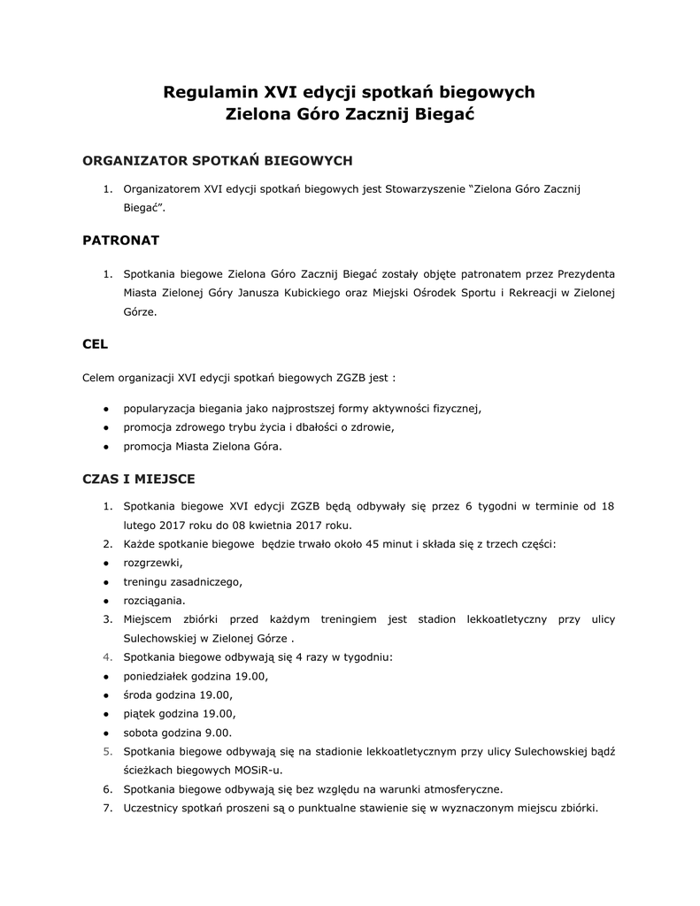 Regulamin XVI edycji spotkań biegowych Zielona Góro Zacznij Biegać ORGANIZATOR SPOTKAŃ BIEGOWYCH 1. Organizatorem XVI edycji spotkań biegowych jest Stowarzyszenie “Zielona Góro Zacznij Biegać”. PATRONAT 1. Spotkania biegowe Zielona Góro Zacznij Biegać zostały objęte patronatem przez Prezydenta Miasta Zielonej Góry Janusza Kubickiego oraz Miejski Ośrodek Sportu i Rekreacji w Zielonej Górze. CEL Celem organizacji XVI edycji spotkań biegowych ZGZB jest : ● popularyzacja biegania jako najprostszej formy aktywności fizycznej, ● promocja zdrowego trybu życia i dbałości o zdrowie, ● promocja Miasta Zielona Góra. CZAS I MIEJSCE 1. Spotkania biegowe XVI edycji ZGZB będą odbywały się przez 6 tygodni w terminie od 18 lutego 2017 roku do 08 kwietnia 2017 roku. 2. Każde spotkanie biegowe będzie trwało około 45 minut i składa się z trzech części: ● rozgrzewki, ● treningu zasadniczego, ● rozciągania. 3. Miejscem zbiórki przed każdym treningiem jest stadion lekkoatletyczny przy ulicy Sulechowskiej w Zielonej Górze . 4. Spotkania biegowe odbywają się 4 razy w tygodniu: ● poniedziałek godzina 19.00, ● środa godzina 19.00, ● piątek godzina 19.00, ● sobota godzina 9.00. 5. Spotkania biegowe odbywają się na stadionie lekkoatletycznym przy ulicy Sulechowskiej bądź ścieżkach biegowych MOSiR-u. 6. Spotkania biegowe odbywają się bez względu na warunki atmosferyczne. 7. Uczestnicy spotkań proszeni są o punktualne stawienie się w wyznaczonym miejscu zbiórki. 8. W trakcie trwania XVI edycji ZGZB uczestnicy będą mogli skorzystać z pomiaru składu ciała oraz spotkania z dietetykiem. O dokładnym terminie uczestnicy zostaną poinformowani w trakcie trwania XVI edycji ZGZB. 9. W dniu 08 kwietnia odbędzie się Finał XVI edycji ZGZB , który będzie polegał na przebiegnięciu 30 minut bez zatrzymywania się. 10. Każdy uczestnik XVI edycji ZGZB, który ukończy ją 30 minutowym biegiem podczas Finału, otrzyma od Organizatora pamiątkowy certyfikat. ZGŁOSZENIA I OPŁATY 1. Warunkiem uczestnictwa w każdym cyklu spotkań jest wypełnienie formularza rejestracyjnego na stronie www.dostartu.pl do dnia 16.02.2017. Po wysłaniu zgłoszenia osoba rejestrująca otrzymuje mail zwrotny informujący o dokonaniu rejestracji. 2. Zapisy zostaną zamknięte po przekroczeniu liczby 50 uczestników. 3. Opłata rejestracyjna wynosi 20 zł i powinna być uiszczona na konto Organizatora, najpóźniej do 16 lutego 2017 roku. 4. Nr konta bankowego: Stowarzyszenie Zielona Góro Zacznij Biegać ul. Armii Ludowej 4 65-245 Zielona Góra 80 1090 1535 0000 0001 2320 3042 Tytułem: wpisowe XVI edycja 6. 7. 8. Opłata w całości przeznaczona na obsługę administracyjną edycji. Opłata raz uiszczona nie podlega zwrotowi. Poniesiona przez uczestnika opłata w przypadku jego rezygnacji z uczestnictwa w XVI edycji ZGZB nie może być przeniesiona na innego uczestnika. Poprzez dokonanie opłaty Uczestnik potwierdza, że zapoznał się z niniejszym Regulaminem i zobowiązuje się do jego przestrzegania oraz wyraża zgodę na przetwarzanie swoich danych osobowych na zasadach określonych w niniejszym Regulaminie. Wysłanie maila rejestracyjnego oraz uiszczenie opłaty rejestracyjnej jest jednoznaczne z wyrażeniem zgody na przetwarzanie danych osobowych, w tym na zamieszczanie tych danych w środkach masowego przekazu i w formie drukowanej oraz na przesyłanie przez Organizatora na adres mailowy uczestników informacji dotyczących organizowanych imprez. 9. 10. POSTANOWIENIA KOŃCOWE 1. Podczas trwania każdego spotkania biegowego jego uczestnicy powinni stosować się do zaleceń prowadzącego. 2. Zaleca się, aby każdy uczestnik spotkania biegowego miał obuwie sportowe i odzież przystosowaną do biegania oraz do aktualnych warunków pogodowych. 3. Prowadzący ma prawo odmówić udziału w spotkaniu biegowym osobom znajdującym się pod wpływem alkoholu, środków odurzających lub zachowującym się agresywnie. 4. Organizator nie zapewnia szatni oraz opieki nad rzeczami osobistymi uczestników spotkań biegowych. 5. Uczestnicy spotkań biegowych zobowiązani są do uszanowania miejsc spotkań biegowych oraz ogólnych zasad w nich panujących, jak również pracy poszczególnych prowadzących spotkania biegowe. 6. Uczestnicy powinni posiadać aktualne ubezpieczenie od następstw nieszczęśliwych wypadków, uzyskane we własnym zakresie. 7. Uczestnicy zobowiązani są do wypełnienia oświadczenia o udziale w spotkaniach biegowych na własną odpowiedzialność oraz braku przeciwwskazań lekarskich do ćwiczeń fizycznych, które powinni pobrać ze strony www.zgzb.pl i przekazać wypełnione Organizatorowi w trakcie pierwszego spotkania biegowego 8. Uczestnicy po ocenie charakteru zajęć oraz potencjalnego ryzyka podczas pierwszego spotkania biegowego, dobrowolnie i bez przymusu decydują się na podjęcie ryzyka odbycia całego cyklu spotkań biegowych. 9. Uczestnicy spotkań biegowych wyrażają zgodę by w zakresie dopuszczalnym przez właściwe przepisy prawa, Organizator fotografował ich w trakcie spotkań biegowych, a następnie zamieścił wybrane przez niego fotografie na stronie www.zgzb.pl oraz Fan Page’u na Facebooku. 10. Organizator nie odpowiada za rzeczy zaginione w czasie trwania spotkań biegowych.