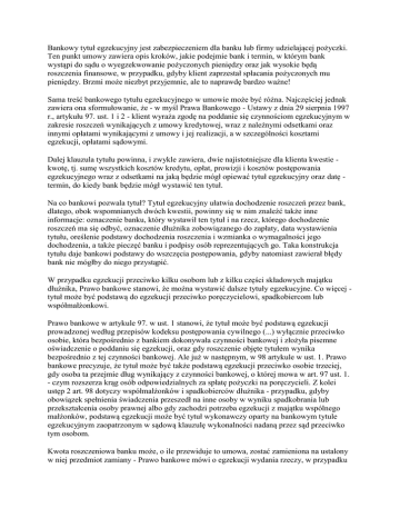 Bankowy tytuł egzekucyjny jest zabezpieczeniem dla banku lub firmy udzielającej pożyczki. Ten punkt umowy zawiera opis kroków, jakie podejmie bank i termin, w którym bank wystąpi do sądu o wyegzekwowanie pożyczonych pieniędzy oraz jak wysokie będą roszczenia finansowe, w przypadku, gdyby klient zaprzestał spłacania pożyczonych mu pieniędzy. Brzmi może niezbyt przyjemnie, ale to naprawdę bardzo ważne! Sama treść bankowego tytułu egzekucyjnego w umowie może być różna. Najczęściej jednak zawiera ona sformułowanie, że - w myśl Prawa Bankowego - Ustawy z dnia 29 sierpnia 1997 r., artykułu 97. ust. 1 i 2 - klient wyraża zgodę na poddanie się czynnościom egzekucyjnym w zakresie roszczeń wynikających z umowy kredytowej, wraz z należnymi odsetkami oraz innymi opłatami wynikającymi z umowy i jej realizacji, a w szczególności kosztami egzekucji, opłatami sądowymi. Dalej klauzula tytułu powinna, i zwykle zawiera, dwie najistotniejsze dla klienta kwestie kwotę, tj. sumę wszystkich kosztów kredytu, opłat, prowizji i kosztów postępowania egzekucyjnego wraz z odsetkami na jaką będzie mógł opiewać tytuł egzekucyjny oraz datę termin, do kiedy bank będzie mógł wystawić ten tytuł. Na co bankowi pozwala tytuł? Tytuł egzekucyjny ułatwia dochodzenie roszczeń przez bank, dlatego, obok wspomnianych dwóch kwestii, powinny się w nim znaleźć także inne informacje: oznaczenie banku, który wystawił ten tytuł i na rzecz, którego dochodzenie roszczeń ma się odbyć, oznaczenie dłużnika zobowiązanego do zapłaty, data wystawienia tytułu, oreślenie podstawy dochodzenia roszczenia i wzmianka o wymagalności jego dochodzenia, a także pieczęć banku i podpisy osób reprezentujących go. Taka konstrukcja tytułu daje bankowi podstawy do wszczęcia postępowania, gdyby natomiast zawierał błędy bank nie mógłby do niego przystąpić. W przypadku egzekucji przeciwko kilku osobom lub z kilku części składowych majątku dłużnika, Prawo bankowe stanowi, że można wystawić dalsze tytuły egzekucyjne. Co więcej tytuł może być podstawą do egzekucji przeciwko poręczycielowi, spadkobiercom lub współmałżonkowi. Prawo bankowe w artykule 97. w ust. 1 stanowi, że tytuł może być podstawą egzekucji prowadzonej według przepisów kodeksu postępowania cywilnego (...) wyłącznie przeciwko osobie, która bezpośrednio z bankiem dokonywała czynności bankowej i złożyła pisemne oświadczenie o poddaniu się egzekucji, oraz gdy roszczenie objęte tytułem wynika bezpośrednio z tej czynności bankowej. Ale już w następnym, w 98 artykule w ust. 1. Prawo bankowe precyzuje, że tytuł może być także podstawą egzekucji przeciwko osobie trzeciej, gdy osoba ta przejmie dług wynikający z czynności bankowej, o której mowa w art. 97 ust. 1. - czym rozszerza krąg osób odpowiedzialnych za spłatę pożyczki na poręczycieli. Z kolei ustęp 2 art. 98 dotyczy współmałżonków i spadkobierców dłużnika - przypadku, gdyby obowiązek spełnienia świadczenia przeszedł na inne osoby w wyniku spadkobrania lub przekształcenia osoby prawnej albo gdy zachodzi potrzeba egzekucji z majątku wspólnego małżonków, podstawą egzekucji może być tytuł wykonawczy oparty na bankowym tytule egzekucyjnym zaopatrzonym w sądową klauzulę wykonalności nadaną przez sąd przeciwko tym osobom. Kwota roszczeniowa banku może, o ile przewiduje to umowa, zostać zamieniona na ustalony w niej przedmiot zamiany - Prawo bankowe mówi o egzekucji wydania rzeczy, w przypadku gdy ustanowiono zastaw rejestrowy lub dokonano przeniesienia własności w celu zabezpieczenia roszczenia. Wydanie bankowego tytułu egzekucyjnego to oczywiście ostateczność, co nie znaczy, że nie praktykowana przez banki. Praktykowana i to z całą bezwzględnością, o czym może świadczyć liczba egzekucji komorniczych. Do tego bowiem sprowadza się wydanie tytułu bankowego. Po jego wystawieniu, bank kieruje go do sądu z klauzulą wykonalności. Sąd ma obowiązek rozpatrzenia go możliwie najszybciej, ale najpóźniej w ciągu 3 dni. Rozpatrzenie odbywa się na posiedzeniu niejawnym, co oznacza, że klient nie ma możliwości obrony i przedstawienia swojego stanowiska. Jeśli sąd wyda postanowienie - nadanie tytułowi klauzuli wykonalności, wtedy do egzekucji długu przystępuje komornik, a jego postępowaniem może być objęty zarówno majątek trwały dłużnika, jak i jego dochody. Tym, którzy uważają, że roszczenia banku są niesłuszne pozostaje w takiej sytuacji wystąpienie do sądu o wytoczenie tzw. powództwa przeciwegzekucyjnego.