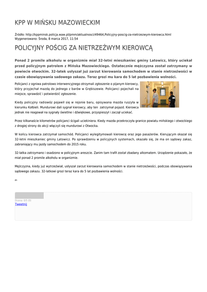 KPP W MIŃSKU MAZOWIECKIM Źródło: http://kppminsk.policja.waw.pl/pmm/aktualnosci/49464,Policyjny-poscig-za-nietrzezwym-kierowca.html Wygenerowano: Środa, 8 marca 2017, 11:54 POLICYJNY POŚCIG ZA NIETRZEŹWYM KIEROWCĄ Ponad 2 promile alkoholu w organizmie miał 32-letni mieszkaniec gminy Latowicz, który uciekał przed policyjnym patrolem z Mińska Mazowieckiego. Ostatecznie mężczyzna został zatrzymany w powiecie otwockim. 32-latek usłyszał już zarzut kierowania samochodem w stanie nietrzeźwości w czasie obowiązywania sadowego zakazu. Teraz grozi mu kara do 5 lat pozbawienia wolności. Policjanci z ogniwa patrolowo interwencyjnego otrzymali zgłoszenie o pijanym kierowcy, który przyjechał mazdą do jednego z barów w Grębiszewie. Policjanci pojechali na miejsce, sprawdzić i potwierdzić zgłoszenie. Kiedy policyjny radiowóz pojawił się w rejonie baru, opisywana mazda ruszyła w kierunku Kołbieli. Mundurowi dali sygnał kierowcy, aby ten zatrzymał pojazd. Kierowca jednak nie reagował na sygnały świetlne i dźwiękowe, przyspieszył i zaczął uciekać. Przez kilkanaście kilometrów policjanci ścigali uciekiniera. Kiedy mazda przekroczyła granice powiatu mińskiego i otwockiego z drogiej strony do akcji włączyli się mundurowi z Otwocka. W końcu kierowca zatrzymał samochód. Policjanci wylegitymowali kierowcę oraz jego pasażerów. Kierującym okazał się 32-letni mieszkaniec gminy Latowicz. Po sprawdzeniu w policyjnych systemach, okazało się, że ma on sądowy zakaz, zabraniający mu jazdy samochodem do 2015 roku. 32-latka zatrzymano i osadzono w policyjnym areszcie. Zanim tam trafił został zbadany alkomatem. Urządzenie pokazało, że miał ponad 2 promile alkoholu w organizmie. Mężczyzna, kiedy już wytrzeźwiał, usłyszał zarzut kierowania samochodem w stanie nietrzeźwości, podczas obowiązywania sądowego zakazu. 32-latkowi grozi teraz kara do 5 lat pozbawienia wolności. dn Ocena: 0/5 (0) Tweetnij