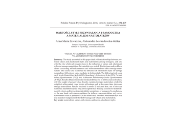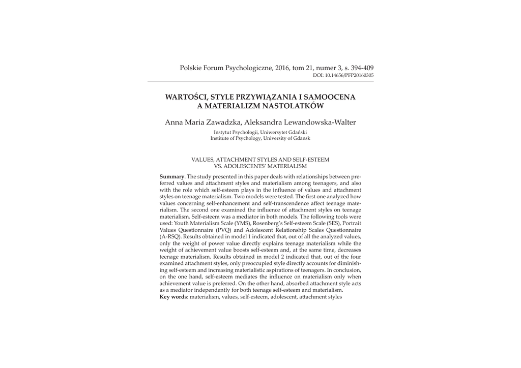 Polskie Forum Psychologiczne, 2016, tom 21, numer 3, s. 394-409 DZȱŗŖǯŗŚŜśŜȦŘŖŗŜŖřŖś gǰȱȱ&ȱȱȱ ȱȱX Anna Maria Zawadzka, Aleksandra Lewandowska-Walter ¢ȱ¢ǰȱ ¢ȱÚ Institute of Psychology, University of Gdansk VALUES, ATTACHMENT STYLES AND SELF-ESTEEM ǯȱȂȱ Summaryǯȱȱ¢ȱȱȱȱȱȱ ȱȱ ȱȱ ȱ ȱ Ĵȱ ¢ȱ ȱ ȱ ȱ ǰȱ ȱ ȱ ȱ ȱ ȱ ȱ Ȭȱ ¢ȱ ȱ ȱ Ěȱ ȱ ȱ ȱ Ĵȱ ¢ȱȱȱǯȱ ȱȱ ȱǯȱȱęȱȱ¢£ȱ ȱ ȱ ȱ Ȭȱ ȱ Ȭȱ ěȱ ȱ ǯȱ ȱ ȱ ȱ ¡ȱ ȱ Ěȱ ȱ Ĵȱ ¢ȱ ȱ ȱ ǯȱȬȱ ȱȱȱȱȱǯȱȱ ȱȱ ȱ DZȱȱȱȱǻǼǰȱȂȱȬȱȱǻǼǰȱȱ ȱ ȱ ǻǼȱ ȱ ȱ ȱ ȱ ȱ ǻȬǼǯȱȱȱȱȱŗȱȱǰȱȱȱȱȱ¢£ȱǰȱ ¢ȱ ȱ ȱ ȱ ȱ ȱ ¢ȱ ¡ȱ ȱ ȱ ȱ ȱ ȱȱȱȱȱȬȱǰȱȱȱȱǰȱȱ ȱ ǯȱ ȱ ȱ ȱ ȱ Řȱ ȱ ǰȱ ȱ ȱ ȱ ȱ ¡ȱĴȱ¢ǰȱ¢ȱȱ¢ȱ¢ȱȱȱing self-esteem and increasing materialistic aspirations of teenagers. In conclusion, ȱ ȱ ȱ ǰȱ Ȭȱ ȱ ȱ Ěȱ ȱ ȱ ¢ȱ ȱ ȱȱȱǯȱȱȱȱǰȱȱĴȱ¢ȱȱ ȱȱȱ¢ȱȱȱȱȬȱȱǯ Key wordsDZȱǰȱǰȱȬǰȱǰȱĴȱ¢ ȱ £ȱ ȱ ȱ ȱ ȱ ȱ ¢£Ù¢ǰȱ Čȱ £ȱ ££ȱ ȱ ȱ ȱ ¢ȱ £¢ȱ £ ȱ ȱ ȱ Č¢ ¢ȱ à ȱ ǻǰȱ ŘŖŗŖǼǯȱ ȱ ȱ £ ȱ ǰȱ ¢Čȱ ȱ ¢£ȱ Čȱ¿ȱ£ȱČ¢ȱȱà ȱǻǰȱ¢ǰȱ ŗşşřDzȱ ǰȱ ǰȱ ŗşşŜǼǯȱ ȱ £ȱ ȱ ȱ ȱ àÙ à ȱ
