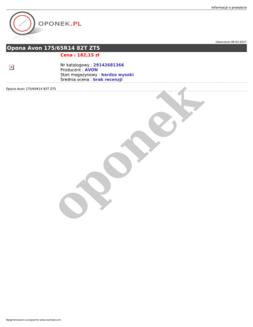 Informacje o produkcie Utworzono 08-03-2017 Opona Avon 175/65R14 82T ZT5 Cena : 182,15 zł Nr katalogowy : 29142681366 Producent : AVON Stan magazynowy : bardzo wysoki Średnia ocena : brak recenzji op on ek Opona Avon 175/65R14 82T ZT5 Wygenerowano w programie www.oscGold.com