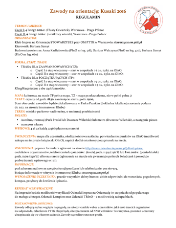 Zawody na orientację: Kusaki 2016 REGULAMIN TERMIN I MIEJSCE:! Część I: 4 lutego 2016 r. (Tłusty Czwartek), Warszawa - Praga Północ Część II: 9 lutego 2016 r. (ostatkowy wtorek), Warszawa - Praga Północ ORGANIZATOR:" Klub Imprez na Orientację STOWARZYSZE przy OM PTTK w Warszawie: stowarzysze.om.pttk.pl! Kierownik: Barbara Szmyt Budowniczowie tras: Anna Kadłubowska (PInO nr leg. 718), Dariusz Walczyna (PInO nr leg. 420), Barbara Szmyt (PInO nr leg. 660) FORMA, ETAPY, TRASY:! • TRASA DLA ZAAWANSOWANYCH (TZ): o Część I: 1 etap wieczorny – start w zespołach 1-2 os., 1 pkt. na OInO, o Część II: 1 etap wieczorny – start w zespołach 1-2 os., 1 pkt. na OInO; • TRASA DLA POCZĄTKUJĄCYCH (TP): o Część I: 1 etap wieczorny – start w zespołach 1-5 os., 1 pkt. na OInO, o Część II: 1 etap wieczorny – start w zespołach 1-5 os., 1 pkt. na OInO; Klasyfikacja łączna z obu części zawodów. MAPA: kolorowa, na trasie TP pełna mapa, TZ - mapa przekształcona, nie w pełni pełna ;)%% START: czynny od godz. 18:30, zamknięcie startu: godz. 19:10; Start obu części zawodów będzie zlokalizowany w Parku Praskim (dokładna lokalizacja zostanie podana do 1.02. na stronie internetowej Klubu) TEREN: miejsko-parkowo-nadbrzeżny, o zmiennej przebieżności DOJAZD: • Autobus, tramwaj (Park Praski lub Dworzec Wileński) lub metro (Dworzec Wileński), a następnie pieszo • transport własny WPISOWE: 4 zł za każdą część (płatne na starcie) ŚWIADCZENIA: mapa dla uczestnika, okolicznościowa naklejka, potwierdzenie punktów na OInO (możliwość zakupu na imprezie książeczki OInO), napój i słodki ostatkowy poczęstunek na mecie. ZGŁOSZENIA: poprzez formularz zgłoszeń na stronie http://www.orienteering.waw.pl/pl/entry/race, osobiście u organizatorów, telefonicznie%do 3.02.2016 r. (środa) godz. 11:59 (część I) lub 8.02.2016 r. (poniedziałek) godz. 11:59 (część II) albo na starcie (zgłoszenie na starcie nie gwarantuje pełnych świadczeń i powoduje podwyższenie wpisowego o 1 zł).% INFORMACJE:! pod adresem mailowym [email protected] lub telefonicznie: 501 160 903, bieżące informacje w witrynie internetowej Klubu: stowarzysze.om.pttk.pl % WYPOSAŻENIE UCZESTNIKA: przede wszystkim dobry humor, ubiór odpowiedni do warunków pogodowych, kompas, przybory do kreślenia i pisania. % REFERAT WERYFIKACYJNY: Na imprezie będzie możliwość weryfikacji Odznaki Imprez na Orientację (w stopniach od popularnego do małego złotego), Odznaki Lampion oraz Odznaki TRInO – z możliwością zakupu blach. POSTANOWIENIA KOŃCOWE: Zawody odbędą się bez względu na pogodę, za szkody wynikłe wobec uczestników, jak i osób trzecich organizator nie odpowiada, członkowie PTTK objęci będą ubezpieczeniem od NNW członków Towarzystwa, pozostali uczestnicy ubezpieczają się we własnym zakresie. Zawody są realizowane non-profit.