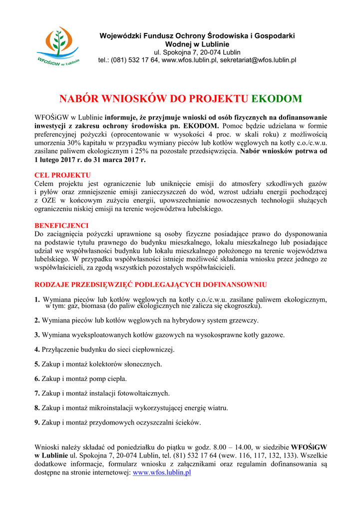 Wojewódzki Fundusz Ochrony Środowiska i Gospodarki Wodnej w Lublinie ul. Spokojna 7, 20-074 Lublin tel.: (081) 532 17 64, www.wfos.lublin.pl, [email protected] NABÓR WNIOSKÓW DO PROJEKTU EKODOM WFOŚiGW w Lublinie informuje, że przyjmuje wnioski od osób fizycznych na dofinansowanie inwestycji z zakresu ochrony środowiska pn. EKODOM. Pomoc będzie udzielana w formie preferencyjnej pożyczki (oprocentowanie w wysokości 4 proc. w skali roku) z możliwością umorzenia 30% kapitału w przypadku wymiany pieców lub kotłów węglowych na kotły c.o./c.w.u. zasilane paliwem ekologicznym i 25% na pozostałe przedsięwzięcia. Nabór wniosków potrwa od 1 lutego 2017 r. do 31 marca 2017 r. CEL PROJEKTU Celem projektu jest ograniczenie lub uniknięcie emisji do atmosfery szkodliwych gazów i pyłów oraz zmniejszenie emisji zanieczyszczeń do wód, wzrost udziału energii pochodzącej z OZE w końcowym zużyciu energii, upowszechnianie nowoczesnych technologii służących ograniczeniu niskiej emisji na terenie województwa lubelskiego. BENEFICJENCI Do zaciągnięcia pożyczki uprawnione są osoby fizyczne posiadające prawo do dysponowania na podstawie tytułu prawnego do budynku mieszkalnego, lokalu mieszkalnego lub posiadające udział we współwłasności budynku lub lokalu mieszkalnego położonego na terenie województwa lubelskiego. W przypadku współwłasności istnieje możliwość składania wniosku przez jednego ze współwłaścicieli, za zgodą wszystkich pozostałych współwłaścicieli. RODZAJE PRZEDSIĘWZIĘĆ PODLEGAJĄCYCH DOFINANSOWNIU 1. Wymiana pieców lub kotłów węglowych na kotły c.o./c.w.u. zasilane paliwem ekologicznym, w tym: gaz, biomasa (do paliw ekologicznych nie zalicza się ekogroszku). 2. Wymiana pieców lub kotłów węglowych na hybrydowy system grzewczy. 3. Wymiana wyeksploatowanych kotłów gazowych na wysokosprawne kotły gazowe. 4. Przyłączenie budynku do sieci ciepłowniczej. 5. Zakup i montaż kolektorów słonecznych. 6. Zakup i montaż pomp ciepła. 7. Zakup i montaż instalacji fotowoltaicznych. 8. Zakup i montaż mikroinstalacji wykorzystującej energię wiatru. 9. Zakup i montaż przydomowych oczyszczalni ścieków. Wnioski należy składać od poniedziałku do piątku w godz. 8.00 – 14.00, w siedzibie WFOŚiGW w Lublinie ul. Spokojna 7, 20-074 Lublin, tel. (81) 532 17 64 (wew. 116, 117, 132, 133). Wszelkie dodatkowe informacje, formularz wniosku z załącznikami oraz regulamin dofinansowania są dostępne na stronie internetowej: www.wfos.lublin.pl