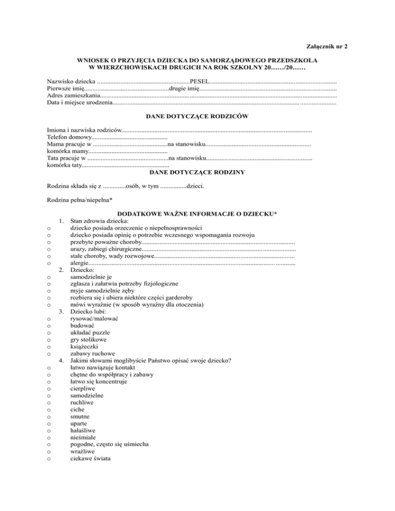 Załącznik nr 2 WNIOSEK O PRZYJĘCIA DZIECKA DO