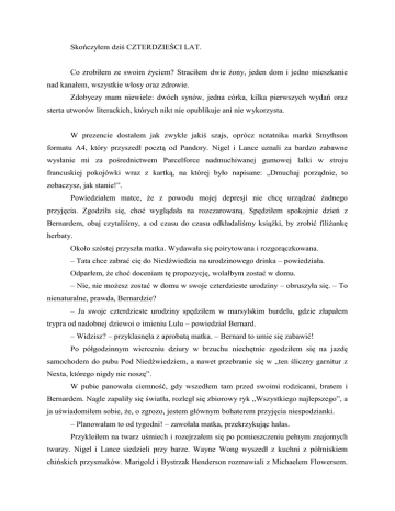 Skończyłem dziś CZTERDZIEŚCI LAT. Co zrobiłem ze swoim życiem? Straciłem dwie żony, jeden dom i jedno mieszkanie nad kanałem, wszystkie włosy oraz zdrowie. Zdobyczy mam niewiele: dwóch synów, jedna córka, kilka pierwszych wydań oraz sterta utworów literackich, których nikt nie opublikuje ani nie wykorzysta. W prezencie dostałem jak zwykle jakiś szajs, oprócz notatnika marki Smythson formatu A4, który przyszedł pocztą od Pandory. Nigel i Lance uznali za bardzo zabawne wysłanie mi za pośrednictwem Parcelforce nadmuchiwanej gumowej lalki w stroju francuskiej pokojówki wraz z kartką, na której było napisane: „Dmuchaj porządnie, to zobaczysz, jak stanie!”. Powiedziałem matce, że z powodu mojej depresji nie chcę urządzać żadnego przyjęcia. Zgodziła się, choć wyglądała na rozczarowaną. Spędziłem spokojnie dzień z Bernardem, obaj czytaliśmy, a od czasu do czasu odkładaliśmy książki, by zrobić filiżankę herbaty. Około szóstej przyszła matka. Wydawała się poirytowana i rozgorączkowana. – Tata chce zabrać cię do Niedźwiedzia na urodzinowego drinka – powiedziała. Odparłem, że choć doceniam tę propozycję, wolałbym zostać w domu. – Nie, nie możesz zostać w domu w swoje czterdzieste urodziny – obruszyła się. – To nienaturalne, prawda, Bernardzie? – Ja swoje czterdzieste urodziny spędziłem w marsylskim burdelu, gdzie złapałem trypra od nadobnej dziewoi o imieniu Lulu – powiedział Bernard. – Widzisz? – przyklasnęła z aprobatą matka. – Bernard to umie się zabawić! Po półgodzinnym wierceniu dziury w brzuchu niechętnie zgodziłem się na jazdę samochodem do pubu Pod Niedźwiedziem, a nawet przebranie się w „ten śliczny garnitur z Nexta, którego nigdy nie noszę”. W pubie panowała ciemność, gdy wszedłem tam przed swoimi rodzicami, bratem i Bernardem. Nagle zapaliły się światła, rozległ się zbiorowy ryk „Wszystkiego najlepszego”, a ja uświadomiłem sobie, że, o zgrozo, jestem głównym bohaterem przyjęcia niespodzianki. – Planowałam to od tygodni! – zawołała matka, przekrzykując hałas. Przykleiłem na twarz uśmiech i rozejrzałem się po pomieszczeniu pełnym znajomych twarzy. Nigel i Lance siedzieli przy barze. Wayne Wong wyszedł z kuchni z półmiskiem chińskich przysmaków. Marigold i Bystrzak Henderson rozmawiali z Michaelem Flowersem. Gracie podbiegła do mnie i objęła mnie za nogi. Pan Carlton-Hayes i Leslie siedzieli razem przy stole z trzema starszymi facetami, których znałem z widzenia. (Tom Urquhart powiedział mi później, że byli to stali klienci, którzy nie chcieli się wynieść „tylko dlatego, że to prywatne przyjęcie”). Wellbeckowie stali pod plastikowym transparentem z napisem „Szczęśliwej czterdziestki”. Rozejrzałem się za Daisy, ale jej nie było. Dopiero około wpół do dziewiątej wparowała do pubu Pandora w długim kremowym kożuchu i ciemnobrązowych zamszowych kozaczkach do kolan. Po raz pierwszy widziała moją łysą głowę, ale nie wzdrygnęła się na ten widok. – Ruch na autostradzie był koszmarny – powiedziała. – Pełno idiotów w małych rodzinnych samochodzikach. Powinien być osobny pas dla takich poważnych ludzi jak ja. – Czy to nie jest pas szybkiego ruchu? – spytałem. – Nie – odparła. – Nie jest wystarczająco szybki. Przymilny Tom Urquhart przyniósł jej kieliszek szampana. Wydudliła go, jakby to była lemoniada. Urquhart próbował zagadnąć ją o browar, przez który Niedźwiedziowi groziło zamknięcie. – Codziennie bankrutuje dwadzieścia pubów – zaczął, ale mu przerwała, mówiąc: – Jestem tu prywatnie, Tom. Bądź tak miły i przynieś mi jeszcze jeden kieliszek z bąbelkami. Gdy pognał do baru, wbiła we mnie błyszczące oczy. – Proszę o raport o postępach w sprawie tej twojej cholernej prostaty – zażądała. Powiedziałem, że guz się chyba kurczy, a onkolog powiedziała, że „są podstawy do optymizmu”. Nie zrobiło to na niej wrażenia. – Alistair Darling powiedział mniej więcej to samo o naszej gospodarce, zanim funt poleciał na łeb na szyję. Gdy Tom Urquhart przyniósł jej kolejny kieliszek szampana, dodała: – Teraz zrelacjonuj mi tę idiotyczną aferę Daisy-Hugo. Powiedziałem, że nadal są razem i że gdy ostatnio spotkałem Daisy na poczcie we wsi, miała na sobie coś od Diora. – Dior! – zaśmiała się. – Przecież tego nie nosi się na wsi. Jakież to wulgarne. W trakcie całej naszej rozmowy wokół kręcili się ludzie, którzy liczyli na to, że zagadną Pandorę. Nie miałem złudzeń co do tego, że to nie ze mną chcą sobie pogawędzić. Około dziewiątej zgasło światło i z dalekiego końca baru wyłoniła się moja matka, niosąc wielki tort w kształcie otwartej książki, ozdobiony lukrem i z czterdziestoma świeczkami. Po bezgłośnym wypowiedzeniu życzenia (żeby Daisy do mnie wróciła) zgasiłem świeczki. Rozległo się kilka nieudolnych prób śpiewania Sto lat, po czym moja matka zaklaskała i zawołała, żeby wszyscy się uciszyli. Struchlałem. Zamierzała wygłosić mowę. Zaczęła od tego, że wybuchnęła płaczem, a potem zatrzepotała dłońmi przed oczami – nauczyła się tego z X Factor. Nigdy nie widziałam, żeby ktoś robił to w prawdziwym życiu. Wiele kobiet zbliżyło się do niej, podając chusteczki, poklepując na pocieszenie i tak dalej. Mój ojciec zawołał: „Weź się w garść, Pauline!”. I wreszcie jakoś jej się to udało. Zaczęła dość konwencjonalnie: – Dziękuję wszystkim za przybycie i dochowanie sekretu przed Adrianem – powiedziała. Później jednak poszła na całość: – Trudno mi uwierzyć, że urodziłam go przed czterdziestu laty. Mój Boże! Nigdy wcześniej nie przeżyłam takiego bólu! Trzydzieści sześć godzin katuszy, i nie było nikogo, kto by mnie trzymał za rękę albo gładził po plecach. Po dziś dzień nie wiem, gdzie podziewał