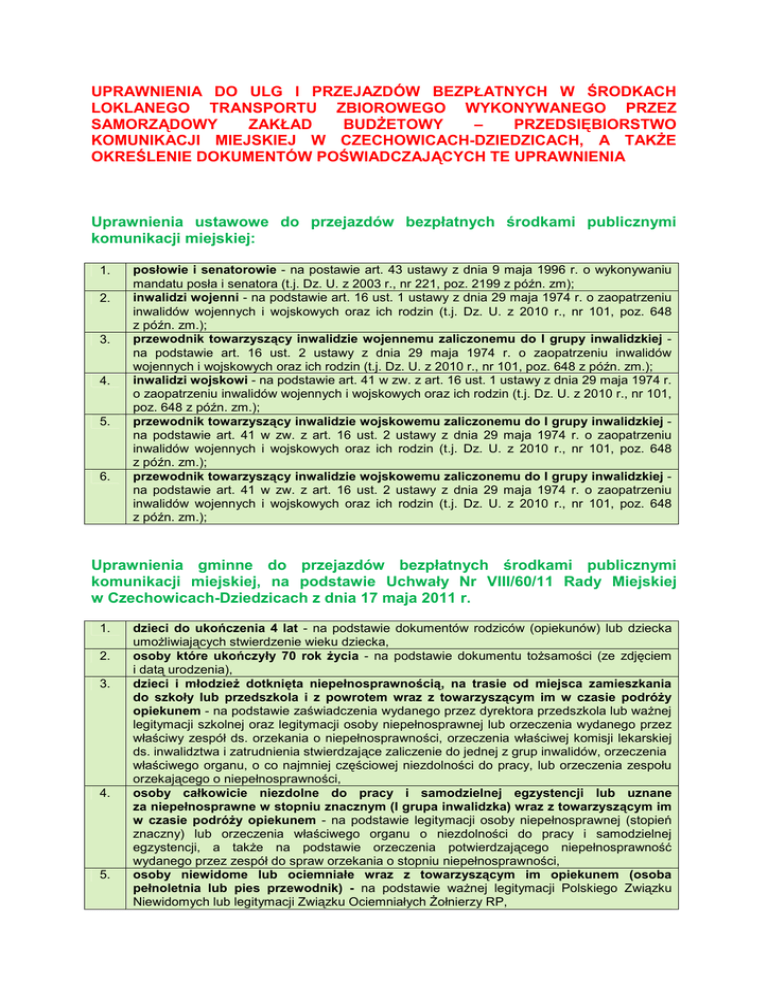 UPRAWNIENIA DO ULG I PRZEJAZDÓW BEZPŁATNYCH W ŚRODKACH LOKLANEGO TRANSPORTU ZBIOROWEGO WYKONYWANEGO PRZEZ SAMORZĄDOWY ZAKŁAD BUDśETOWY – PRZEDSIĘBIORSTWO KOMUNIKACJI MIEJSKIEJ W CZECHOWICACH-DZIEDZICACH, A TAKśE OKREŚLENIE DOKUMENTÓW POŚWIADCZAJĄCYCH TE UPRAWNIENIA Uprawnienia ustawowe do przejazdów bezpłatnych środkami publicznymi komunikacji miejskiej: 1. 2. 3. 4. 5. 6. posłowie i senatorowie - na postawie art. 43 ustawy z dnia 9 maja 1996 r. o wykonywaniu mandatu posła i senatora (t.j. Dz. U. z 2003 r., nr 221, poz. 2199 z późn. zm); inwalidzi wojenni - na podstawie art. 16 ust. 1 ustawy z dnia 29 maja 1974 r. o zaopatrzeniu inwalidów wojennych i wojskowych oraz ich rodzin (t.j. Dz. U. z 2010 r., nr 101, poz. 648 z późn. zm.); przewodnik towarzyszący inwalidzie wojennemu zaliczonemu do I grupy inwalidzkiej na podstawie art. 16 ust. 2 ustawy z dnia 29 maja 1974 r. o zaopatrzeniu inwalidów wojennych i wojskowych oraz ich rodzin (t.j. Dz. U. z 2010 r., nr 101, poz. 648 z późn. zm.); inwalidzi wojskowi - na podstawie art. 41 w zw. z art. 16 ust. 1 ustawy z dnia 29 maja 1974 r. o zaopatrzeniu inwalidów wojennych i wojskowych oraz ich rodzin (t.j. Dz. U. z 2010 r., nr 101, poz. 648 z późn. zm.); przewodnik towarzyszący inwalidzie wojskowemu zaliczonemu do I grupy inwalidzkiej na podstawie art. 41 w zw. z art. 16 ust. 2 ustawy z dnia 29 maja 1974 r. o zaopatrzeniu inwalidów wojennych i wojskowych oraz ich rodzin (t.j. Dz. U. z 2010 r., nr 101, poz. 648 z późn. zm.); przewodnik towarzyszący inwalidzie wojskowemu zaliczonemu do I grupy inwalidzkiej na podstawie art. 41 w zw. z art. 16 ust. 2 ustawy z dnia 29 maja 1974 r. o zaopatrzeniu inwalidów wojennych i wojskowych oraz ich rodzin (t.j. Dz. U. z 2010 r., nr 101, poz. 648 z późn. zm.); Uprawnienia gminne do przejazdów bezpłatnych środkami publicznymi komunikacji miejskiej, na podstawie Uchwały Nr VIII/60/11 Rady Miejskiej w Czechowicach-Dziedzicach z dnia 17 maja 2011 r. 1. 2. 3. 4. 5. dzieci do ukończenia 4 lat - na podstawie dokumentów rodziców (opiekunów) lub dziecka umoŜliwiających stwierdzenie wieku dziecka, osoby które ukończyły 70 rok Ŝycia - na podstawie dokumentu toŜsamości (ze zdjęciem i datą urodzenia), dzieci i młodzieŜ dotknięta niepełnosprawnością, na trasie od miejsca zamieszkania do szkoły lub przedszkola i z powrotem wraz z towarzyszącym im w czasie podróŜy opiekunem - na podstawie zaświadczenia wydanego przez dyrektora przedszkola lub waŜnej legitymacji szkolnej oraz legitymacji osoby niepełnosprawnej lub orzeczenia wydanego przez właściwy zespół ds. orzekania o niepełnosprawności, orzeczenia właściwej komisji lekarskiej ds. inwalidztwa i zatrudnienia stwierdzające zaliczenie do jednej z grup inwalidów, orzeczenia właściwego organu, o co najmniej częściowej niezdolności do pracy, lub orzeczenia zespołu orzekającego o niepełnosprawności, osoby całkowicie niezdolne do pracy i samodzielnej egzystencji lub uznane za niepełnosprawne w stopniu znacznym (I grupa inwalidzka) wraz z towarzyszącym im w czasie podróŜy opiekunem - na podstawie legitymacji osoby niepełnosprawnej (stopień znaczny) lub orzeczenia właściwego organu o niezdolności do pracy i samodzielnej egzystencji, a takŜe na podstawie orzeczenia potwierdzającego niepełnosprawność wydanego przez zespół do spraw orzekania o stopniu niepełnosprawności, osoby niewidome lub ociemniałe wraz z towarzyszącym im opiekunem (osoba pełnoletnia lub pies przewodnik) - na podstawie waŜnej legitymacji Polskiego Związku Niewidomych lub legitymacji Związku Ociemniałych śołnierzy RP, 6. 7. 8. 9. 10. 11. pracownicy Przedsiębiorstwa Komunikacji Miejskiej w Czechowicach-Dziedzicach zatrudnieni w pełnym lub niepełnym wymiarze czasu pracy, małŜonkowie pracowników i ich dzieci do lat 18, a dzieci uczące się i niepracujące do 25 lat, emeryci i renciści oraz osoby korzystające ze świadczeń rehabilitacyjnych, którzy bezpośrednio przed przejściem na emeryturę, rentę lub do korzystania ze świadczeń rehabilitacyjnych byli zatrudnieni w ww. przedsiębiorstwie oraz współmałŜonkowie emerytów, rencistów i osób korzystających ze świadczeń rehabilitacyjnych - na podstawie biletu wydanego przez Przedsiębiorstwo Komunikacji Miejskiej, krwiodawcy zrzeszeni w Klubach Honorowych Dawców Krwi na terenie Gminy Czechowice-Dziedzice, którzy oddali: - kobiety - 15 litrów krwi, - męŜczyźni - 18 litrów krwi, na podstawie legitymacji wydanej przez Przedsiębiorstwo Komunikacji Miejskiej w Czechowicach - Dziedzicach policjanci podczas wykonywania czynności słuŜbowych, umundurowani funkcjonariusze StraŜy Miejskiej w Czechowicach-Dziedzicach podczas wykonywania obowiązków słuŜbowych, osoby upowaŜnione do kontroli biletów w środkach lokalnego transportu zbiorowego podczas wykonywania czynności słuŜbowych na podstawie imiennego identyfikatora, osoby bezrobotne korzystające z pomocy Ośrodka Pomocy Społecznej w Czechowicach-Dziedzicach zamieszkałe na terenie Gminy Czechowice-Dziedzice, które podpisały kontrakt socjalny w rozumieniu ustawy z dnia 12 marca 2004 r. o pomocy społecznej (t.j. Dz. U. z 2009 r., Nr 175, poz. 1362 ze zm.) – na podstawie waŜnego zaświadczenia o spełnieniu tych warunków wydanego przez Ośrodek Pomocy Społecznej w Czechowicach-Dziedzicach. Uprawnienia ustawowe do korzystania z 50 % ulgi w opłatach za przejazdy publicznymi środkami komunikacji miejskiej: 1. 2. 3. 4. kombatanci lub osoby zajmujące się działalnością równorzędną z działalnością kombatancką oraz niektóre osoby będące ofiarami represji wojennych i okresu powojennego - na podstawie ustawy art. 20 ust. 1 ustawy z dnia 24 stycznia 1991 r. o kombatantach oraz niektórych osobach będących ofiarami represji wojennych i okresu powojennego (t. j. Dz.U. z 2002 r., nr 42, poz. 371 z późn. zm); studenci - na podstawie art. 188 ust. 1 ustawy z dnia 27 lipc